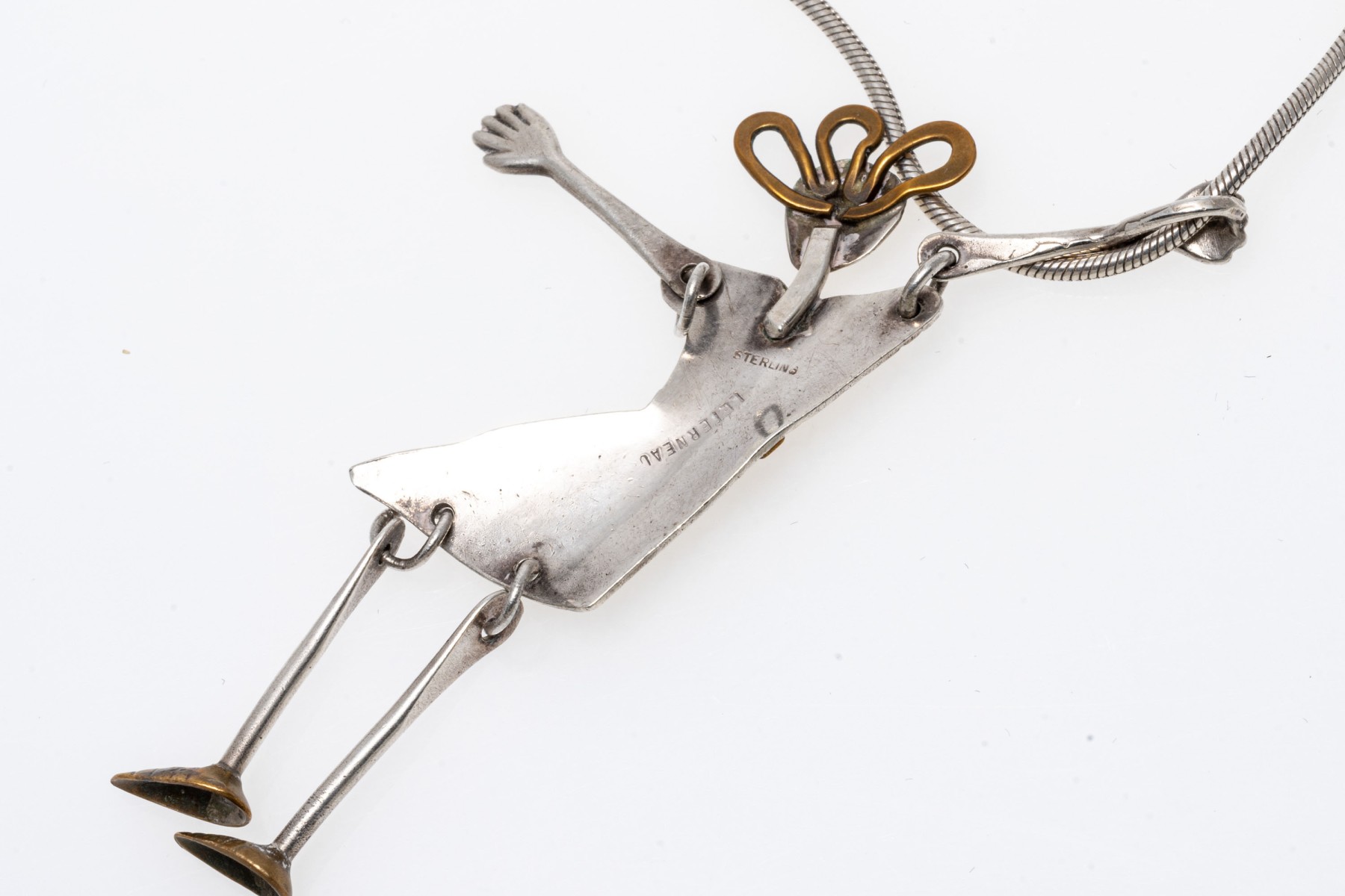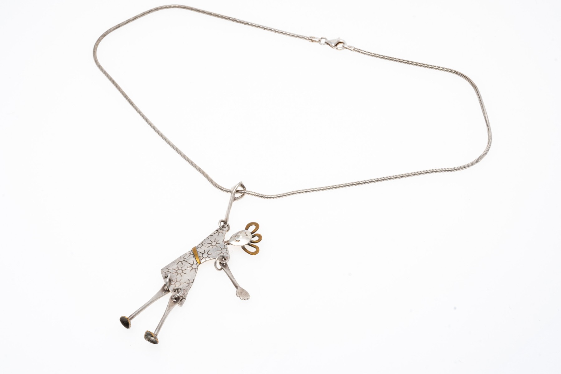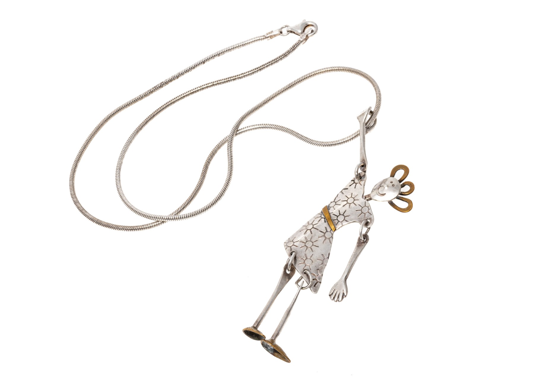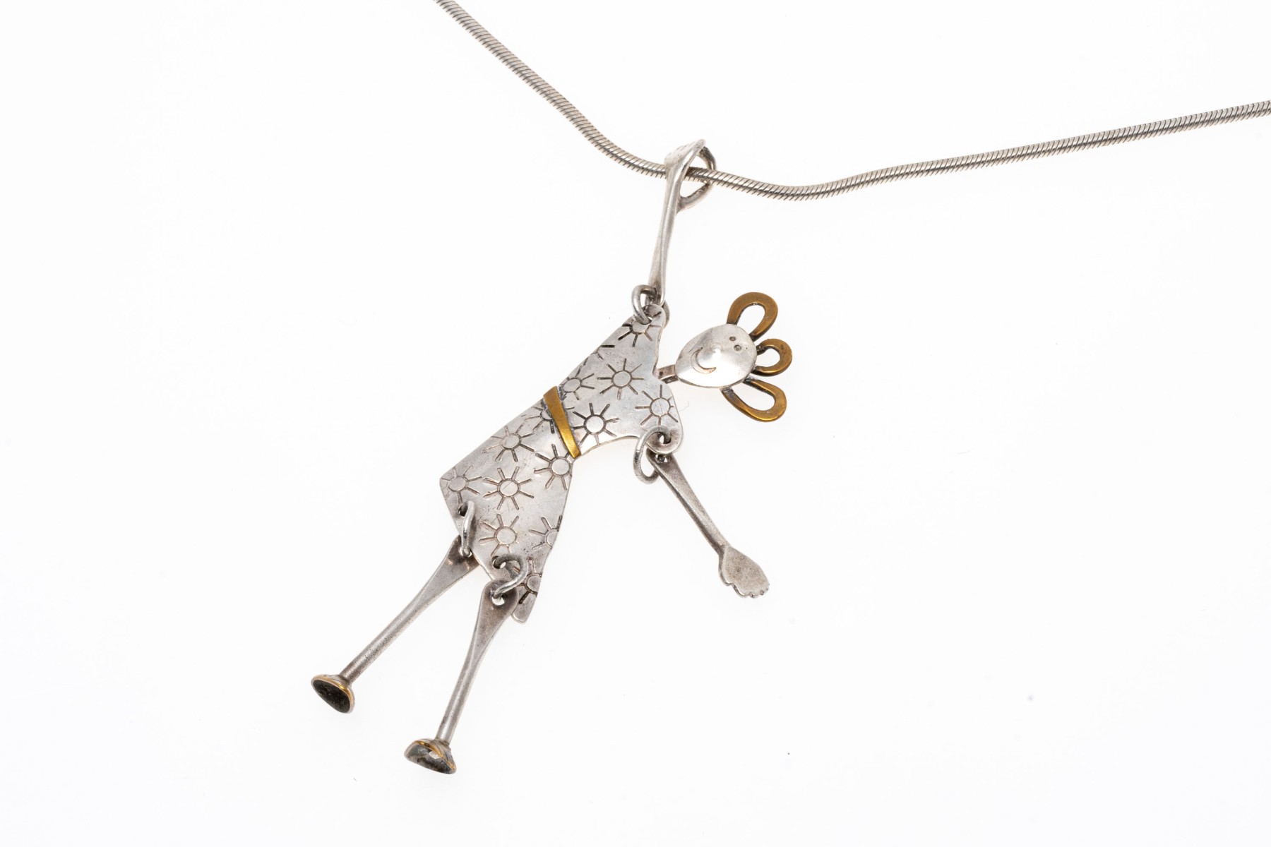 James Letourneau (American [IL], b. 1970) handmade pendant necklace displaying a woman in a flower-motif dress with gilt accents, hanging from a round snake chain.