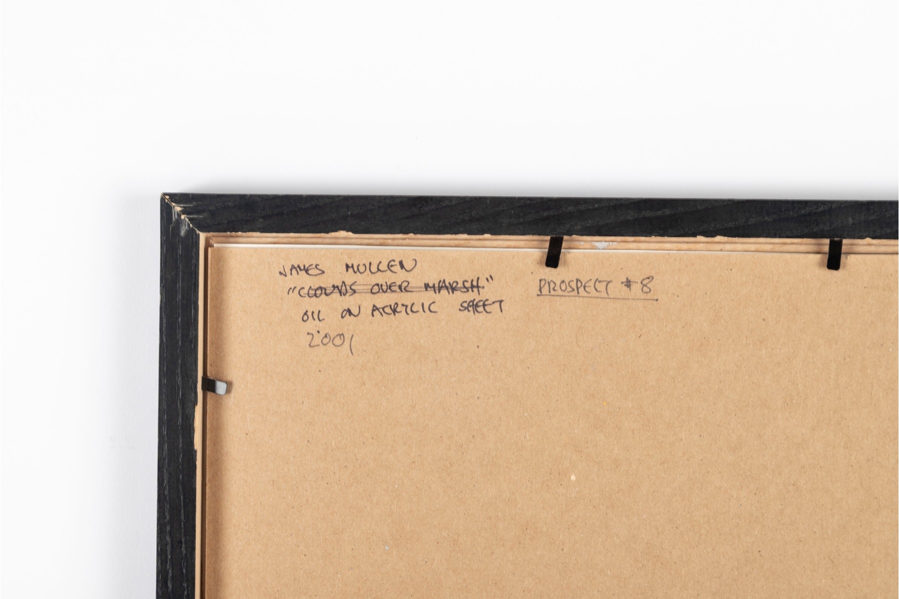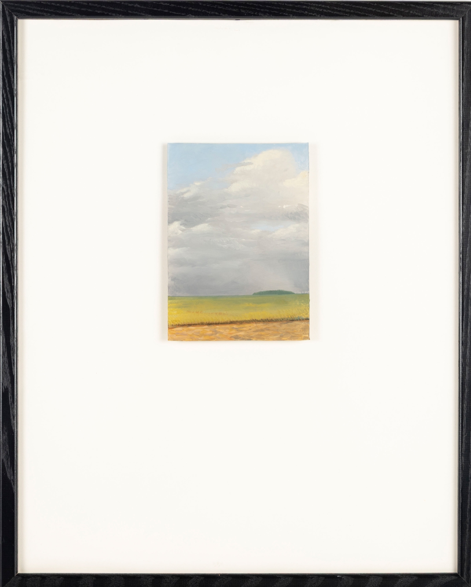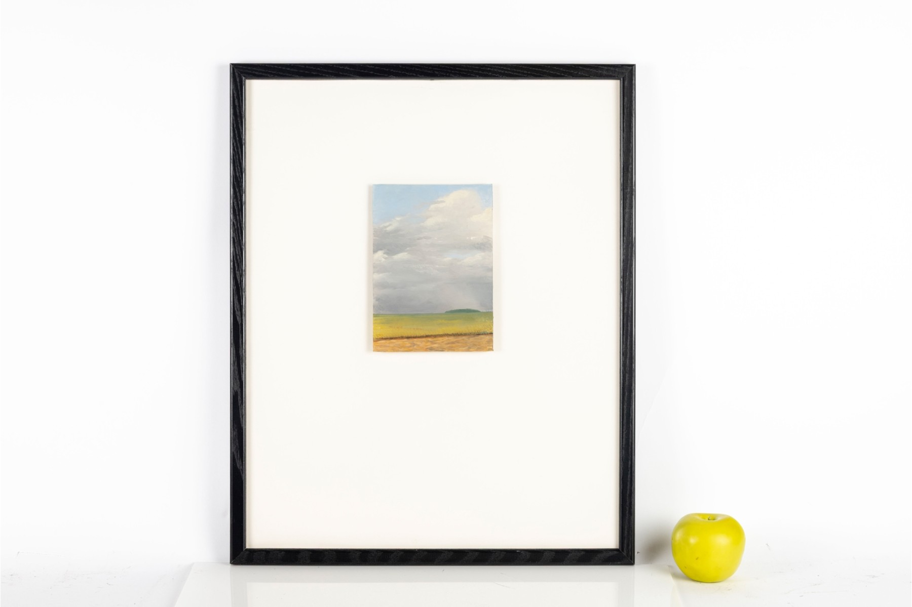 A small oil on paper landscape depicting a golden field beneath a wide sky filled with shifting clouds Composed and signed by James Mullen, titled "Prospect #8" and presented in a wooden frame faced with plexiglass.