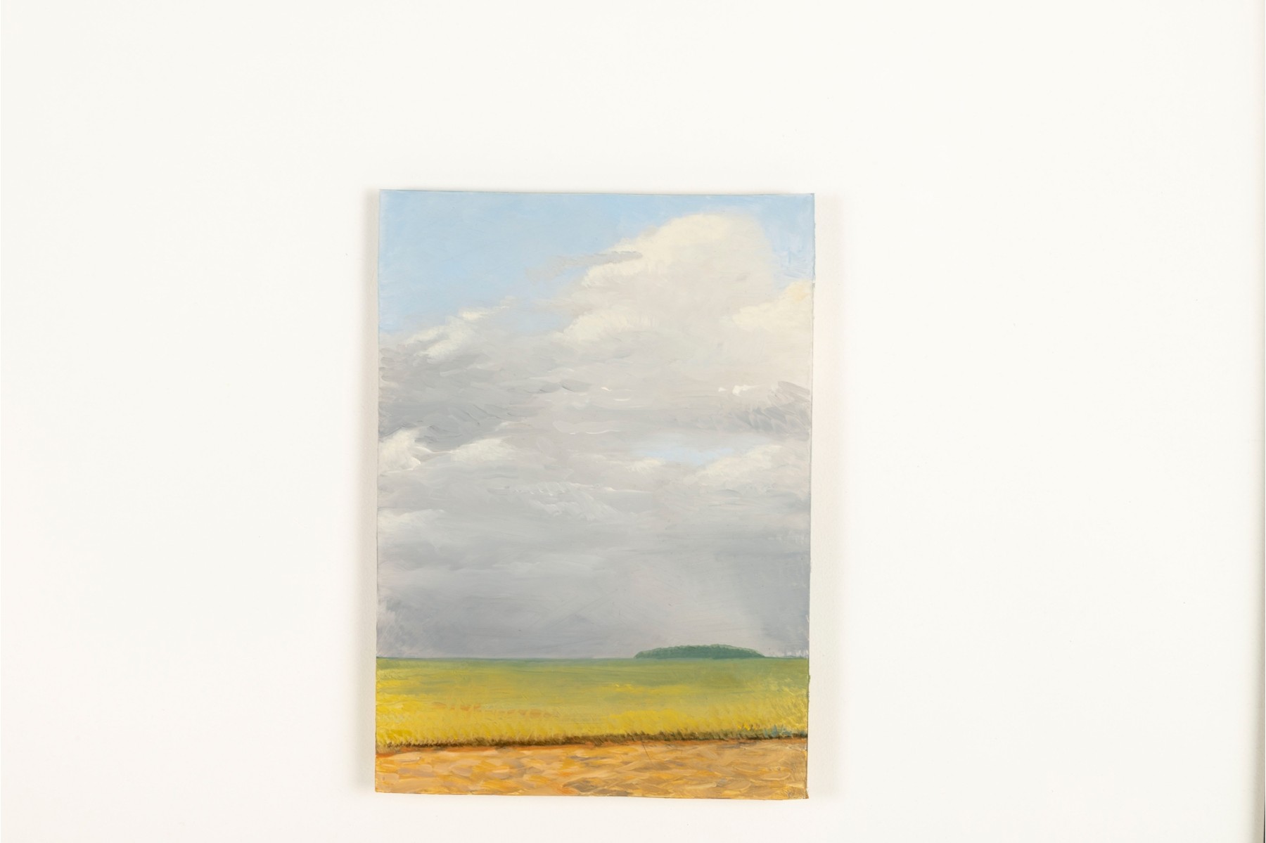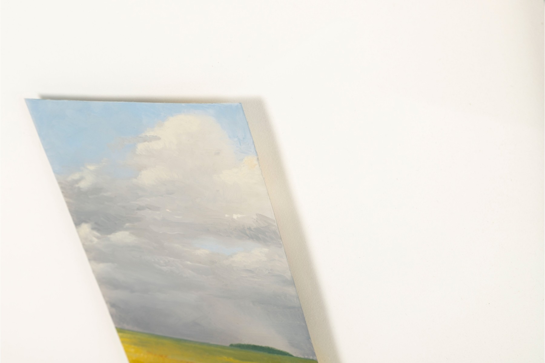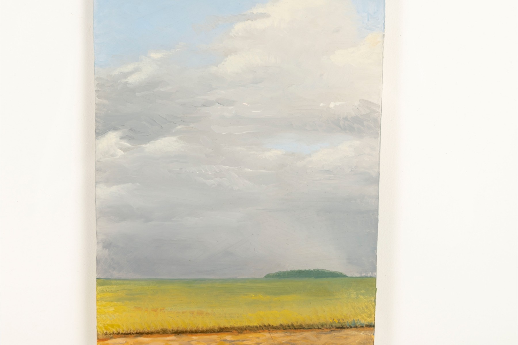A small oil on paper landscape depicting a golden field beneath a wide sky filled with shifting clouds Composed and signed by James Mullen, titled "Prospect #8" and presented in a wooden frame faced with plexiglass.