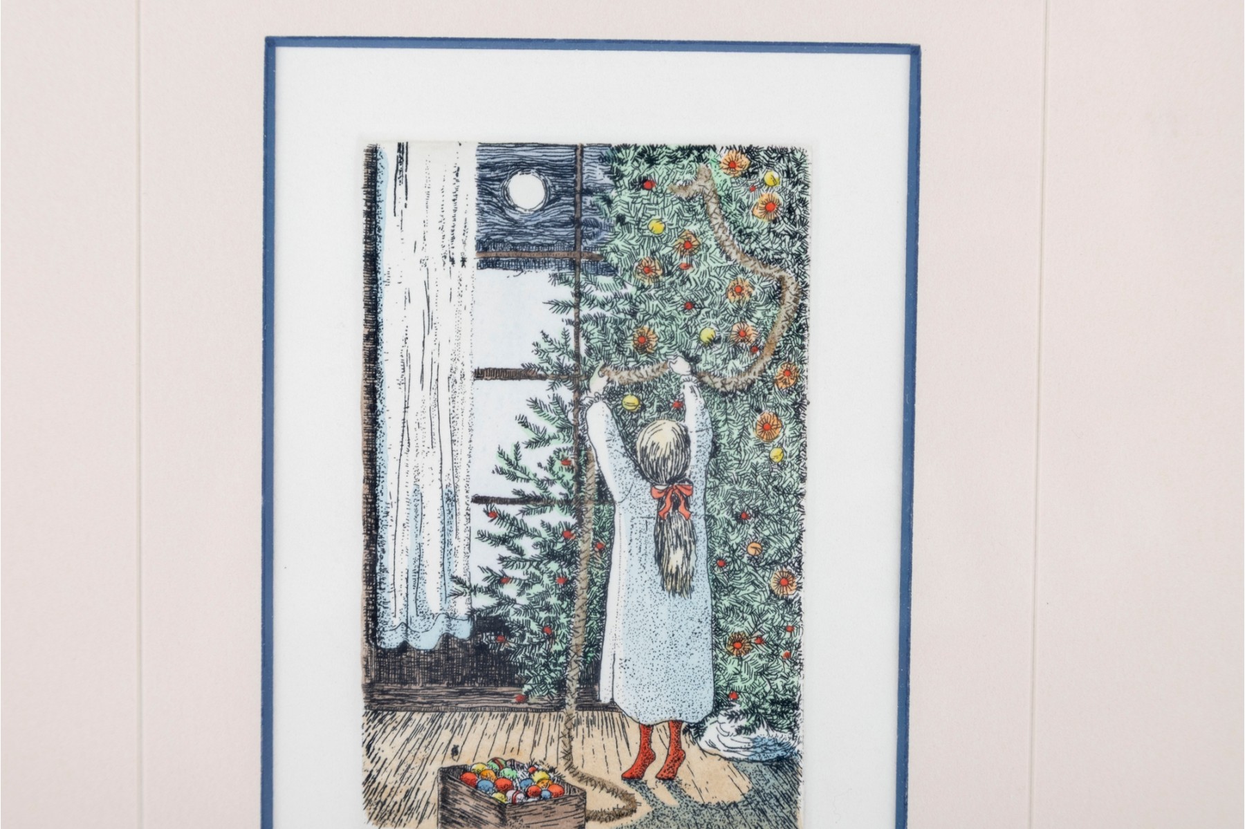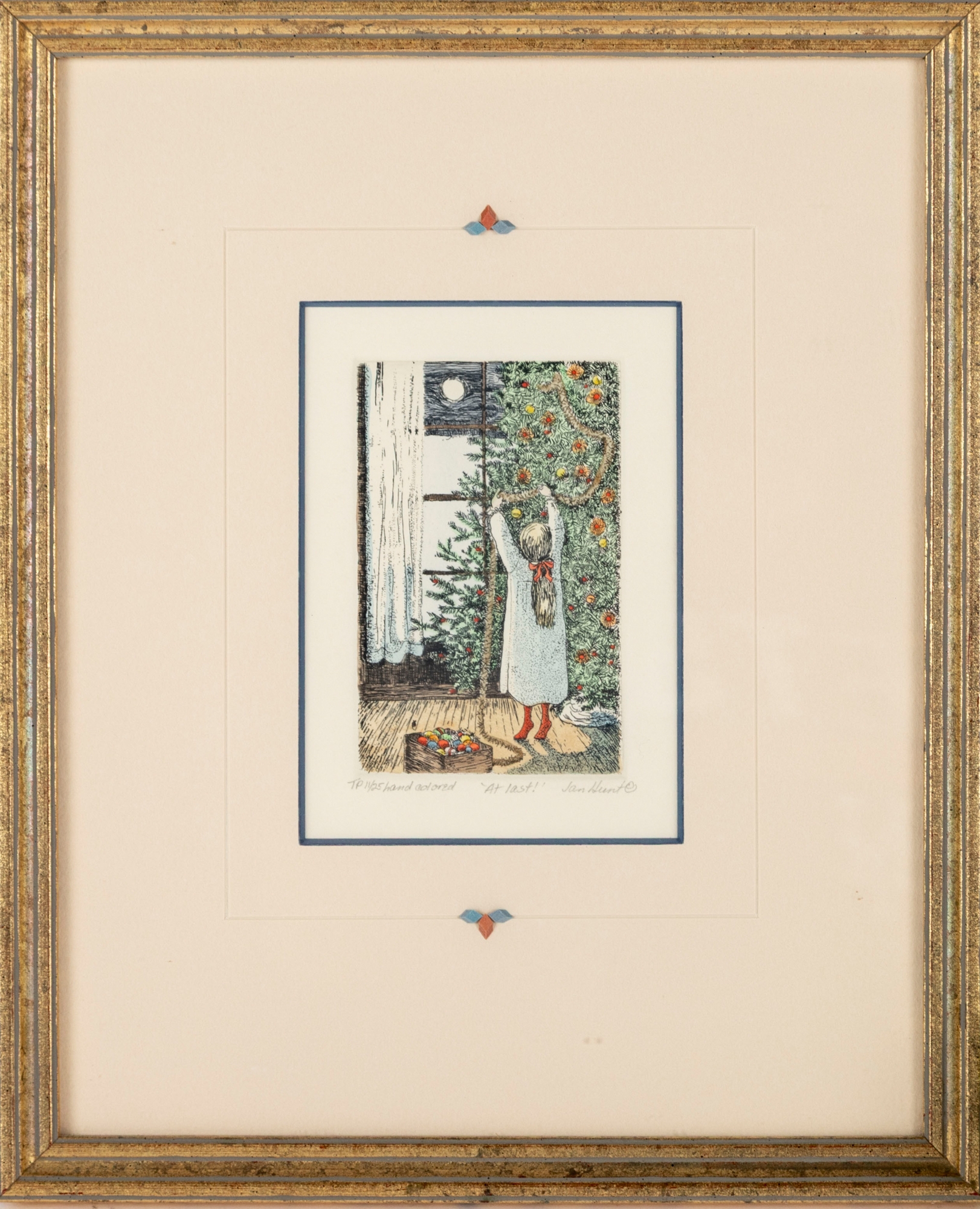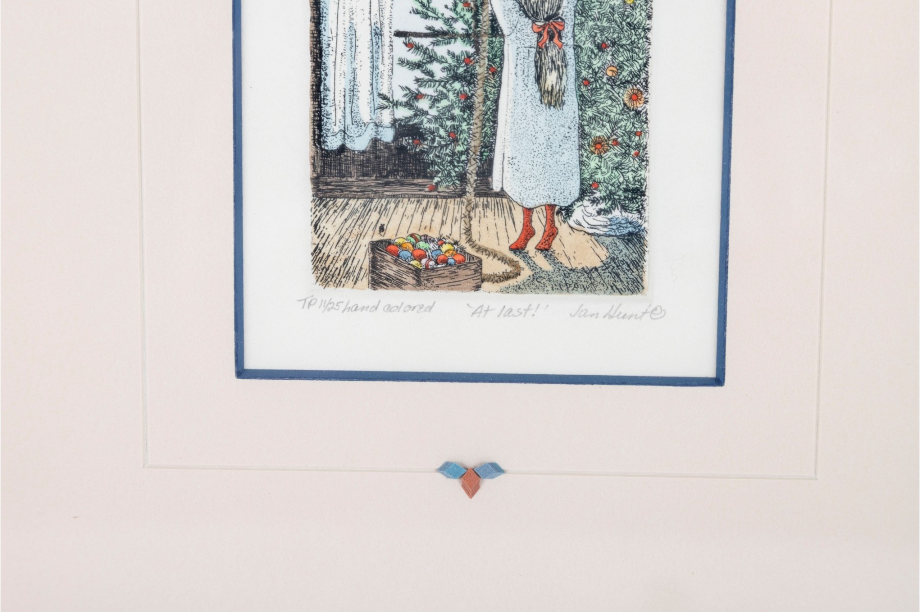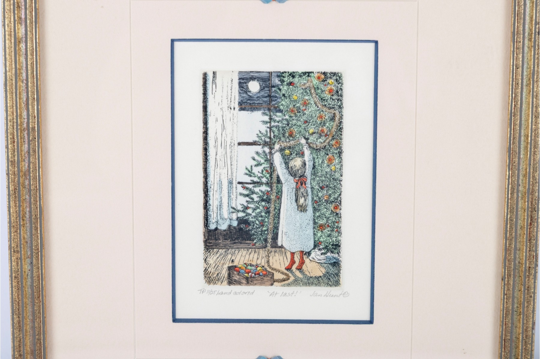 Limited edition hand-colored and pencil signed lithograph titled At Last by Jan Hunt, numbered 11/25. Depicts a whimsical scene of a child reaching up to decorate a Christmas tree, presented in a gold-tone frame with double matting.