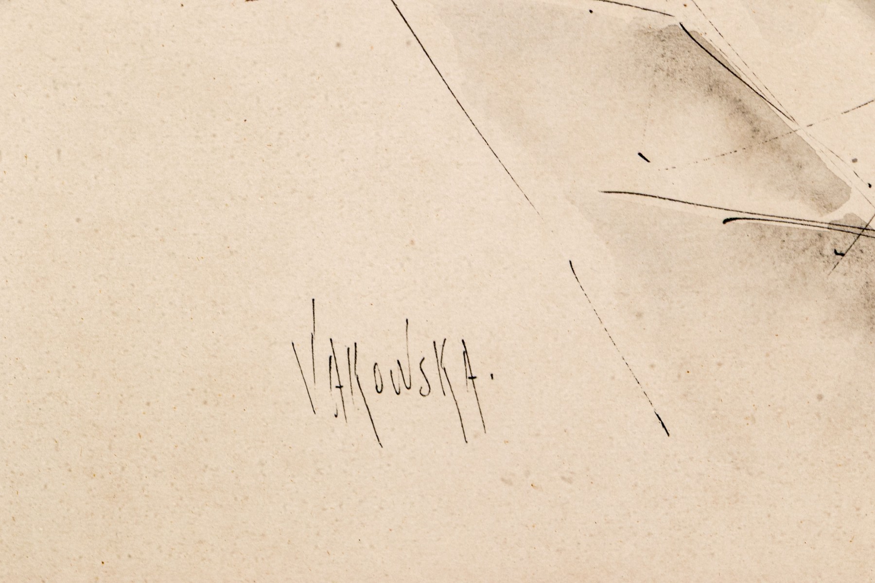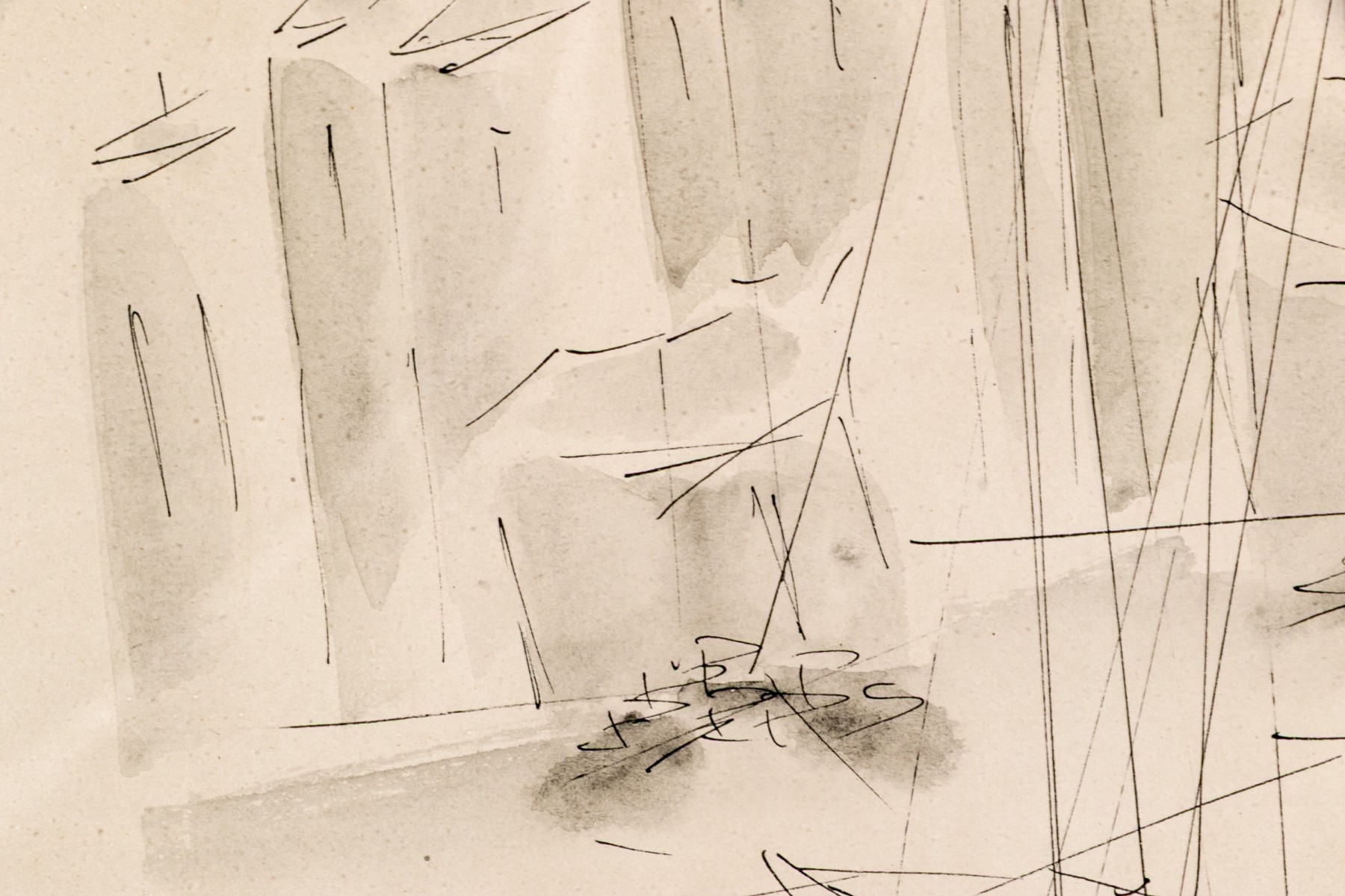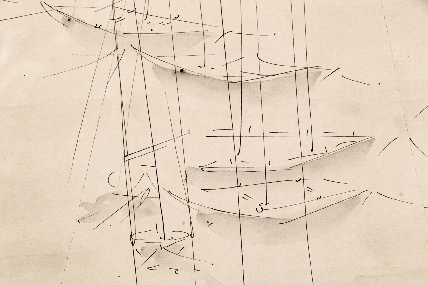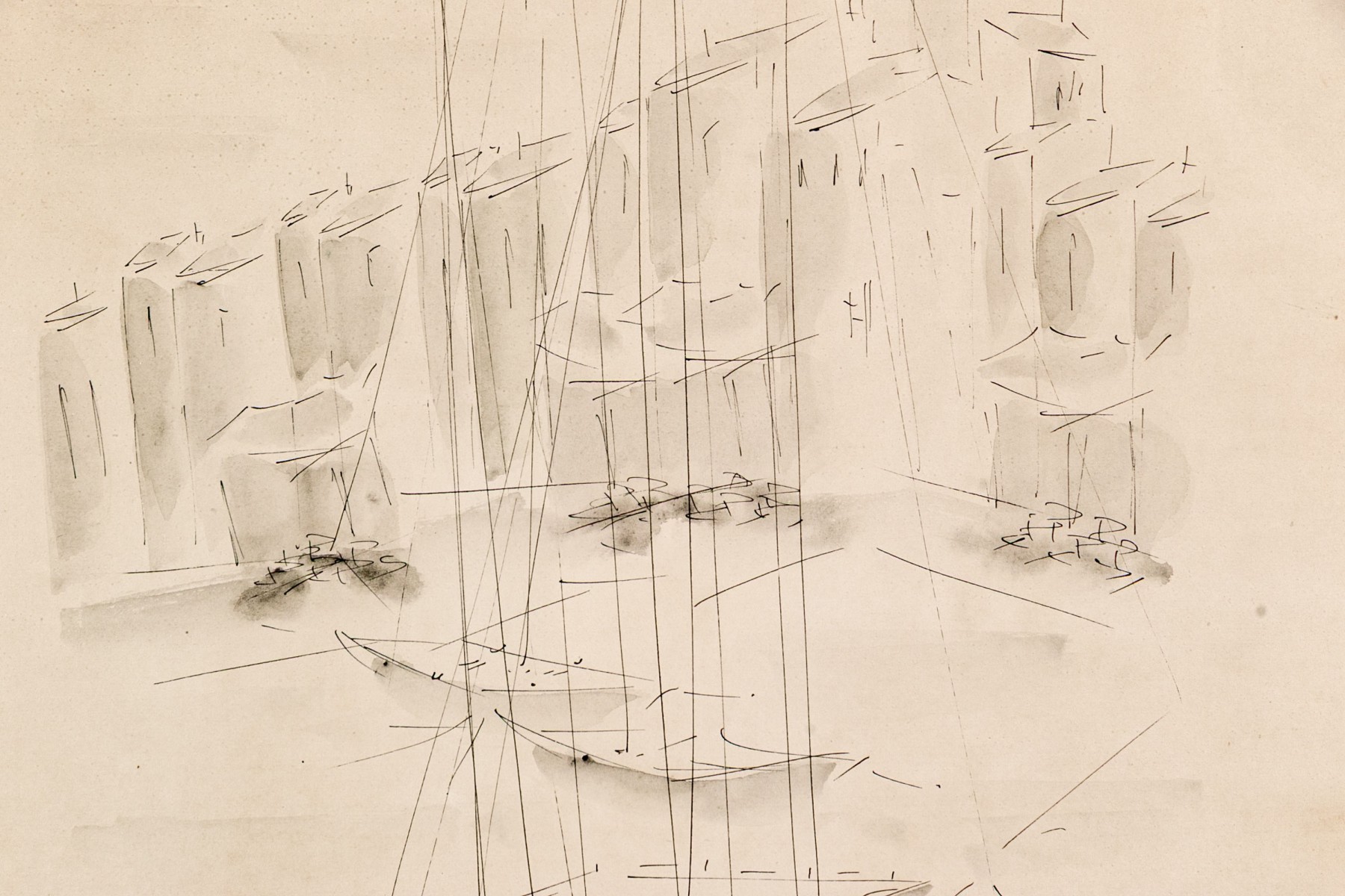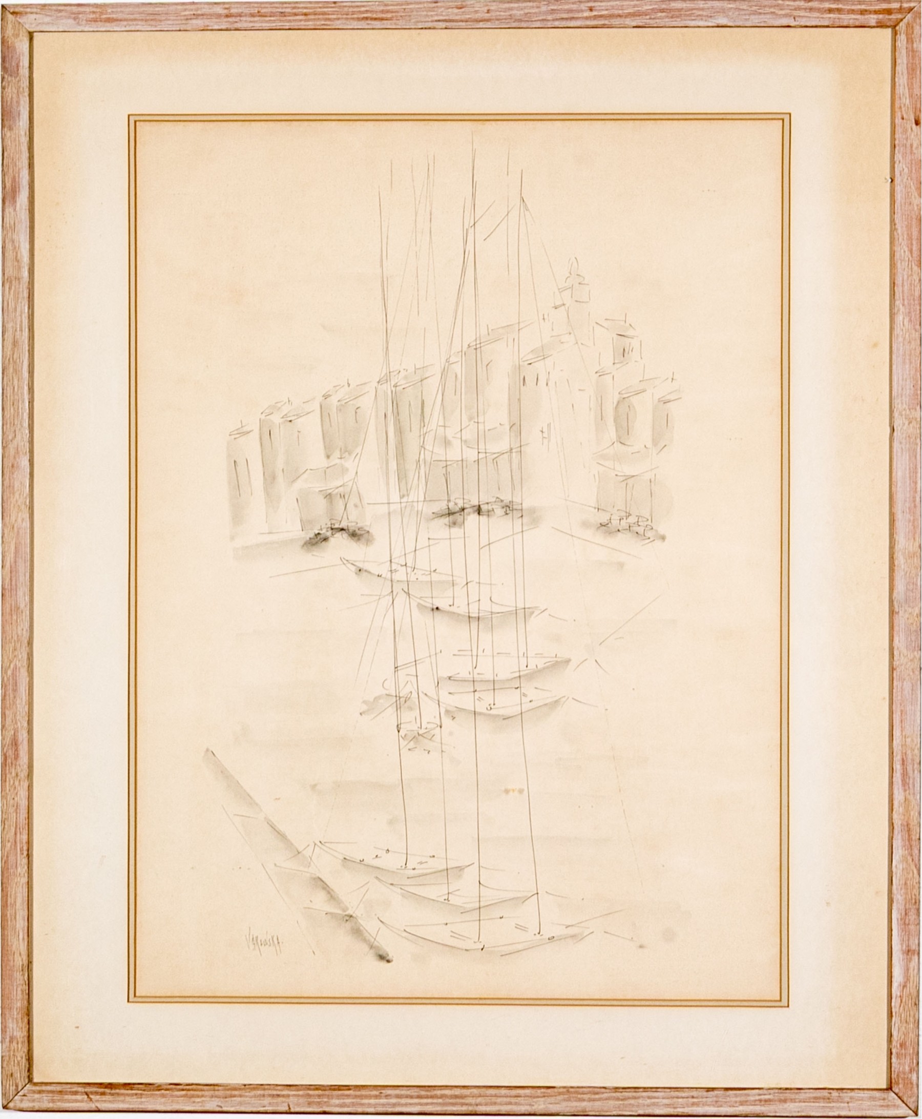 Signed Vakowska lower left. The ink on paper work depicts an abstracted, minimalist image of a harbor with docked sailboats in the foreground with their tall masts rising upwards with smaller boats in the mid ground.