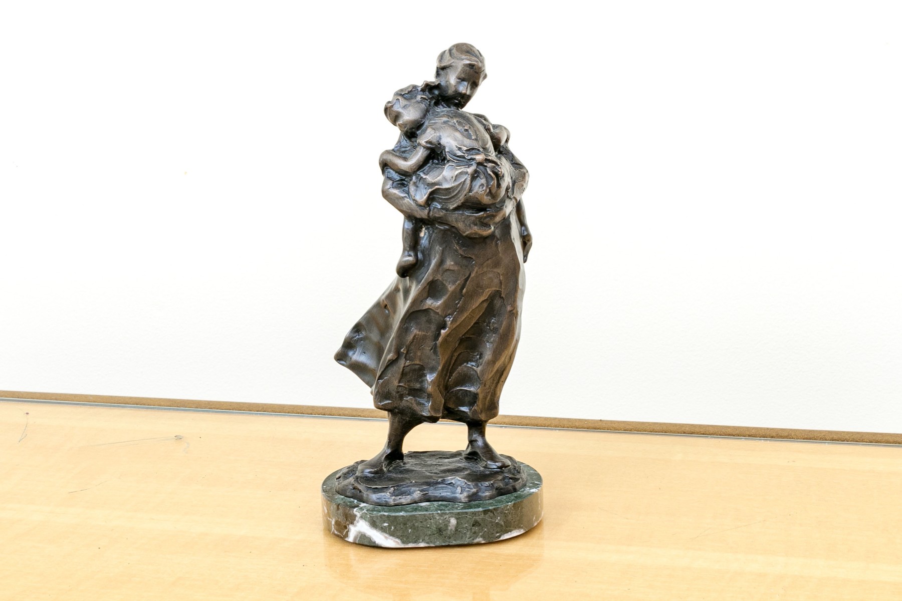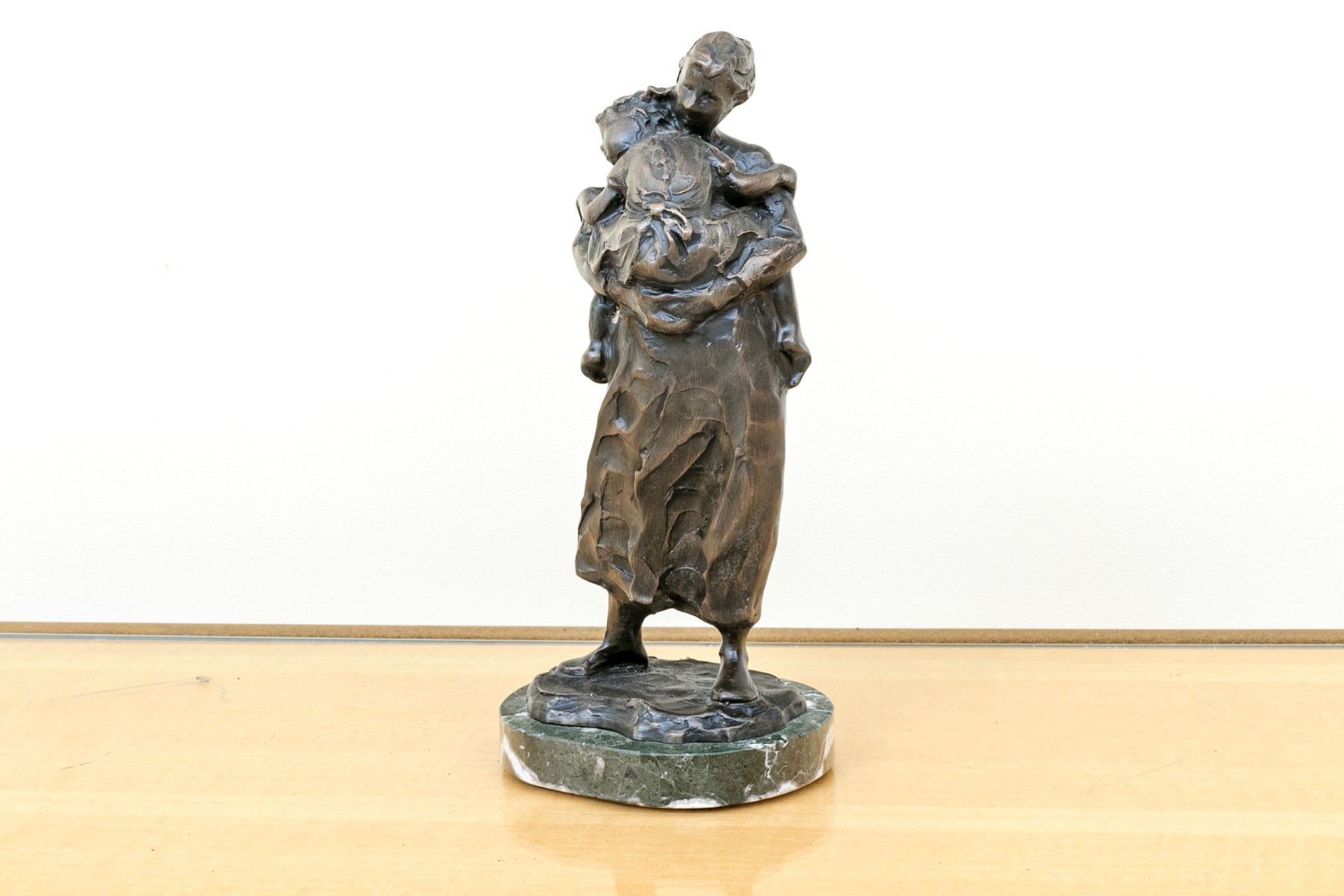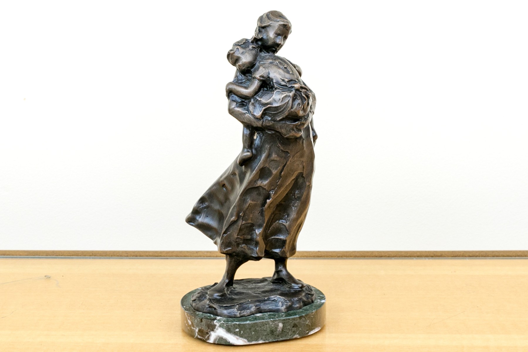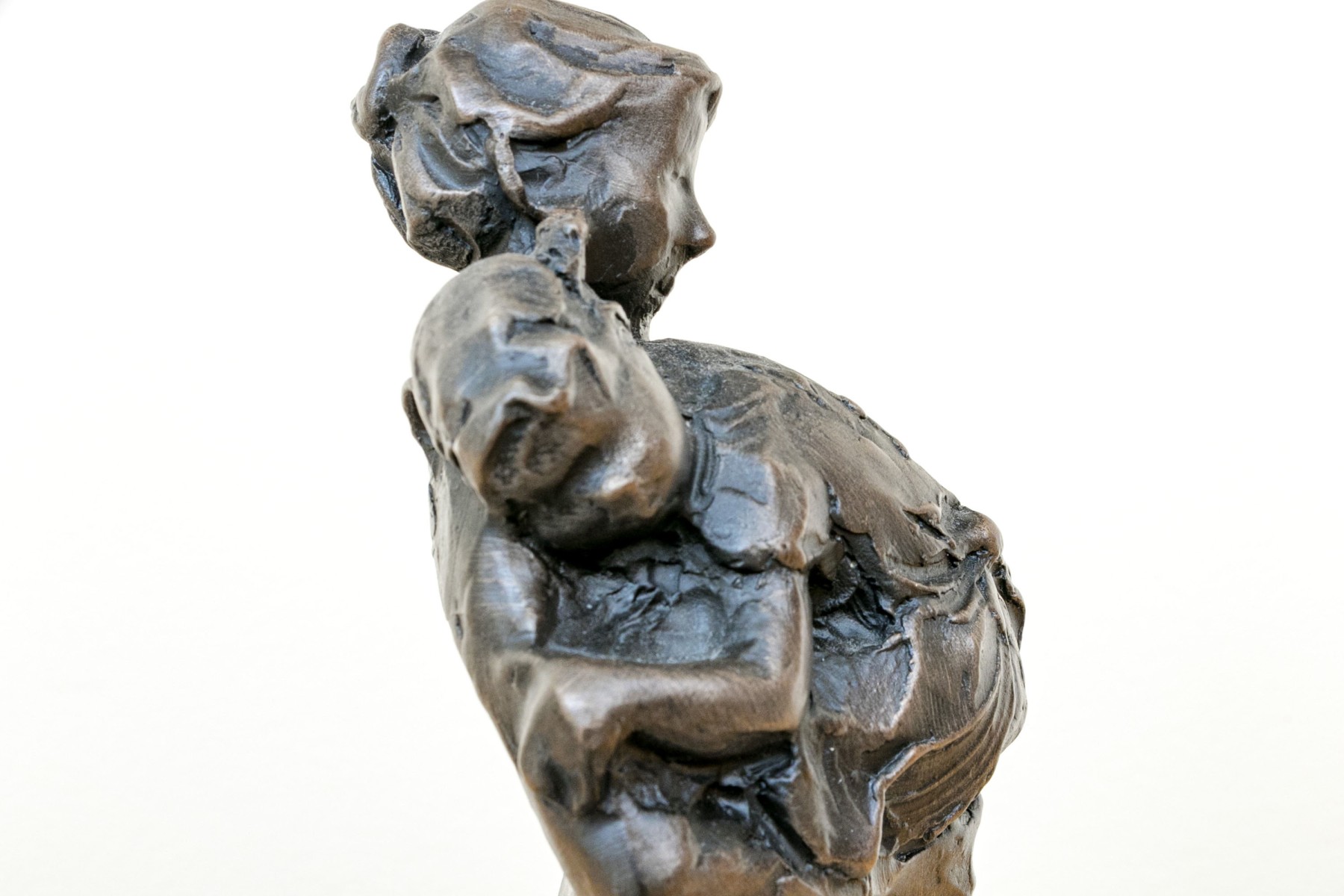 Jane DeDecker (American [IA], b. 1961) "Never Too Big" bronze sculpture depicting an impressionist mother holding a child in a tender carrying embrace, standing together over an oval naturalistic ground mounted to a green marble base. Signed and dated 1998.