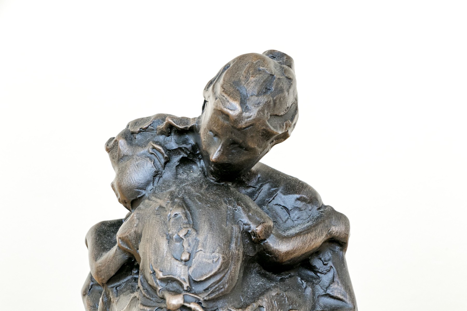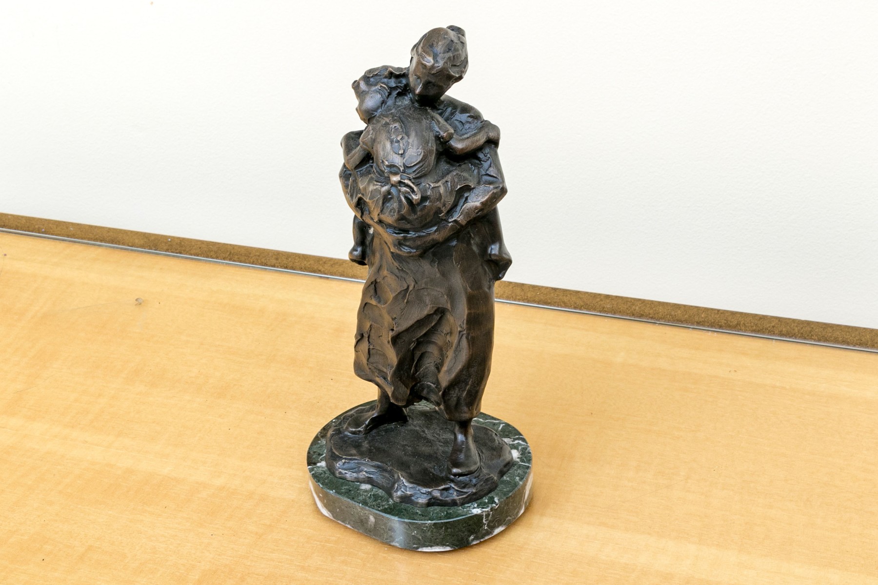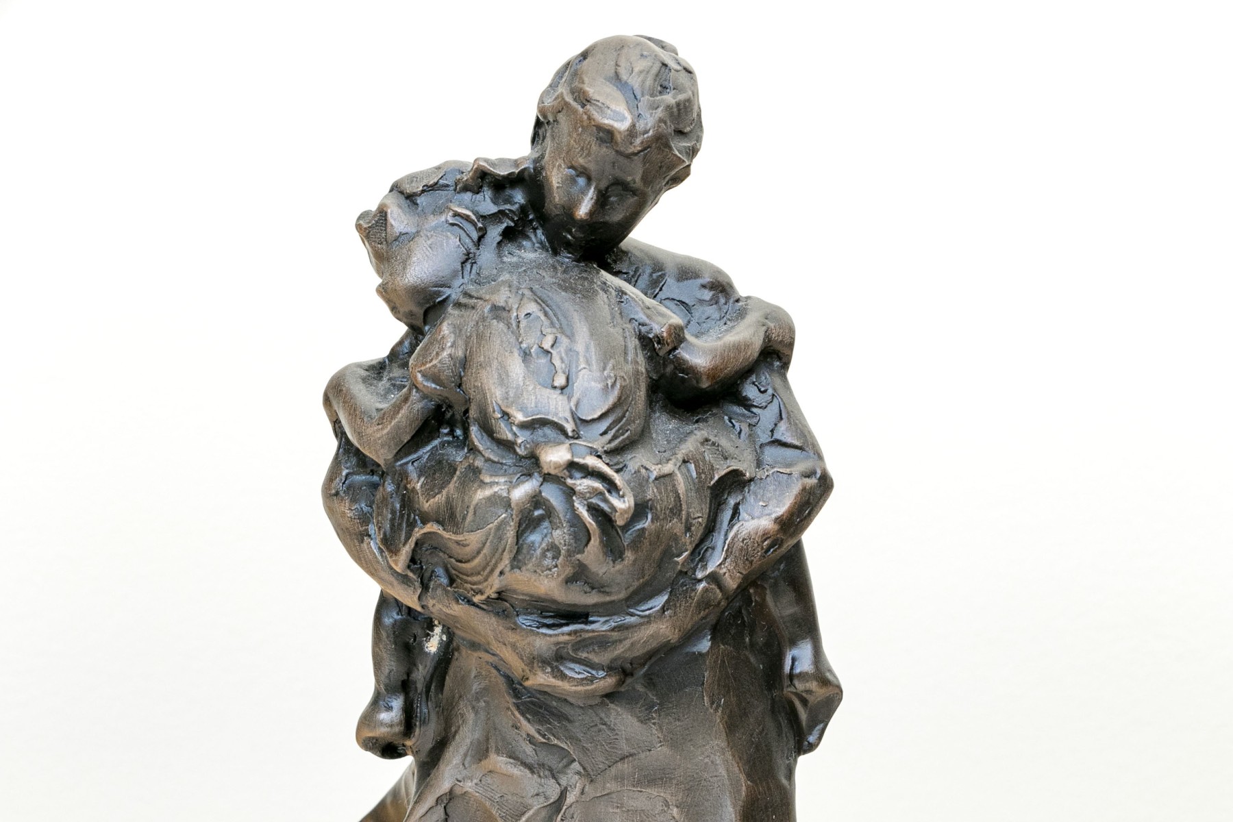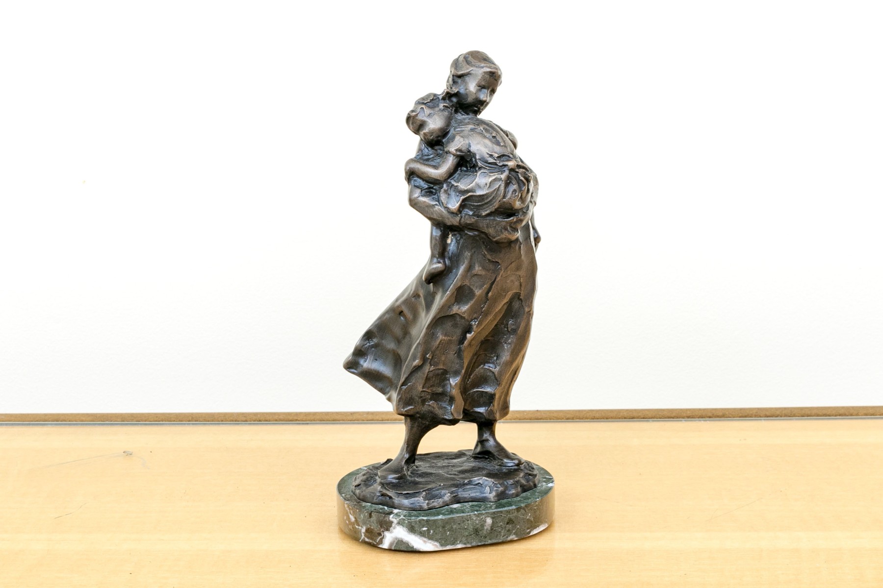 Jane DeDecker (American [IA], b. 1961) "Never Too Big" bronze sculpture depicting an impressionist mother holding a child in a tender carrying embrace, standing together over an oval naturalistic ground mounted to a green marble base. Signed and dated 1998.