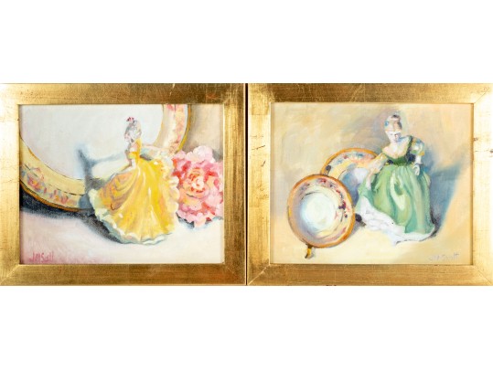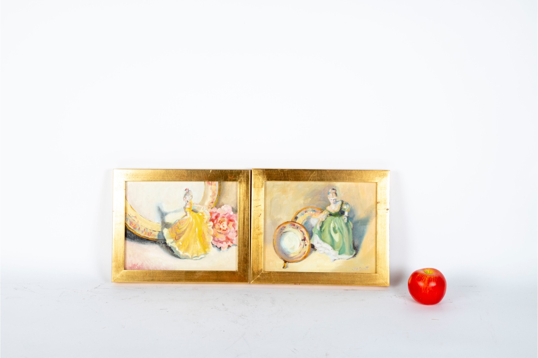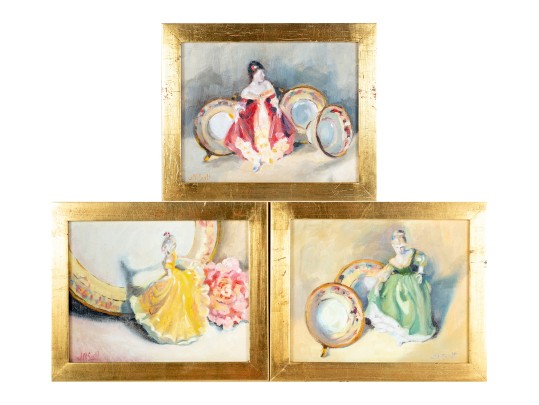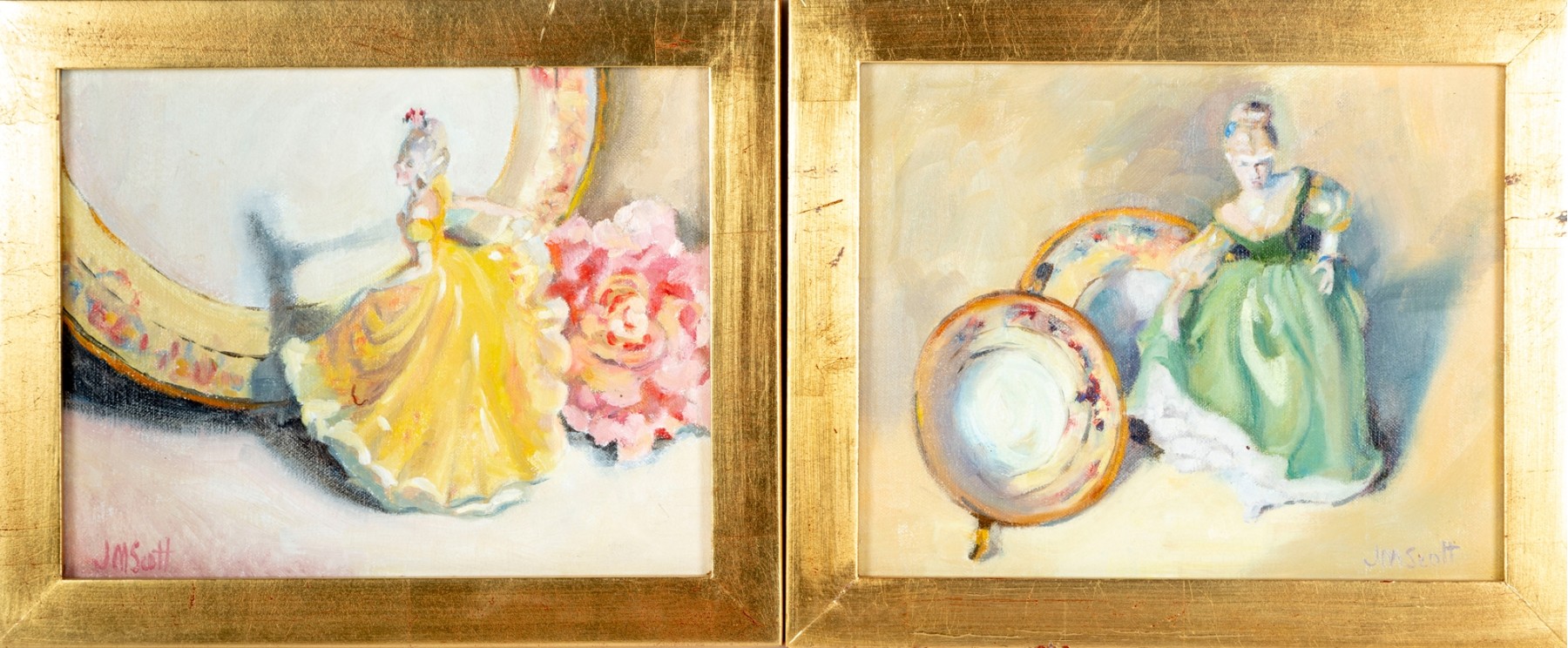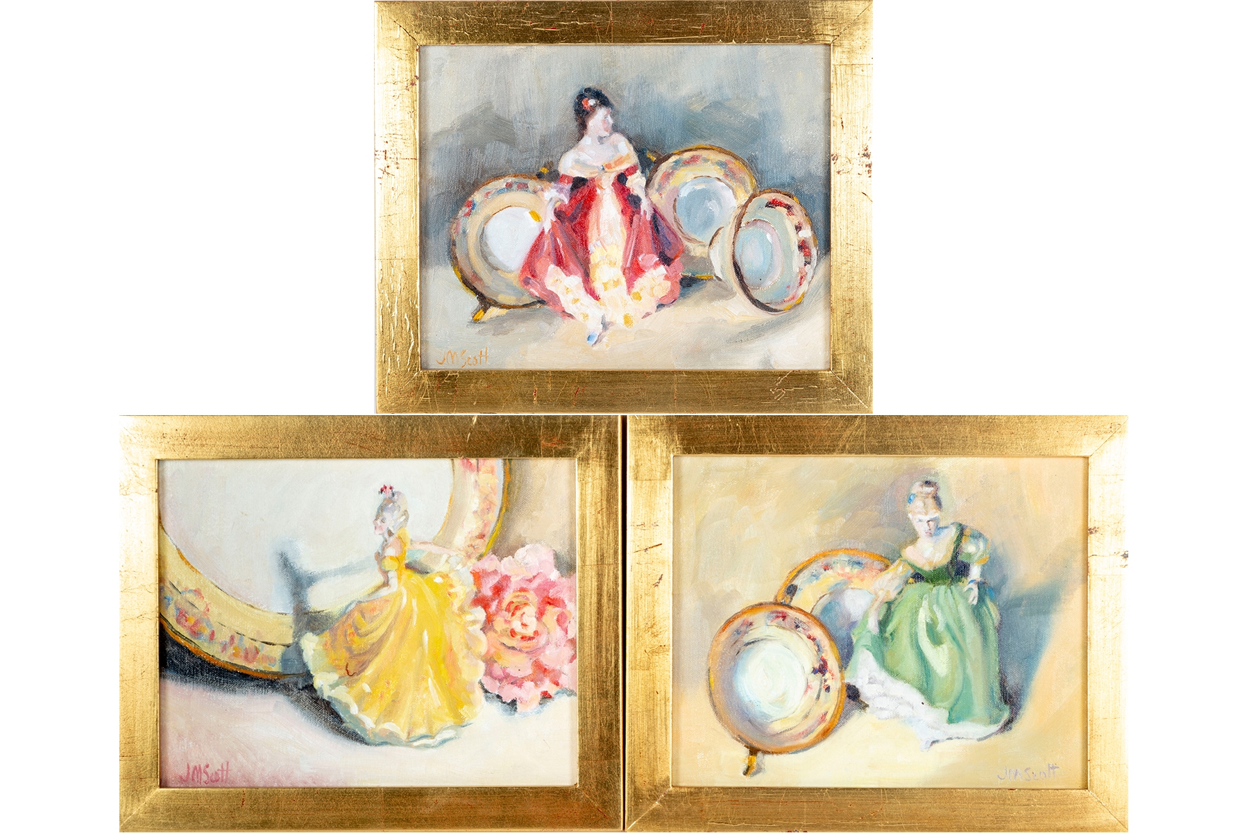 Jane Scott (American, 20th C.) "Southern Belle," "Ninette," and "My Fair Lady" oil paintings on board depicting figurines of elegant ladies in red, yellow, and green ball gowns posed with displayed china. Signed lower right and left, with titles denoted on the verso.