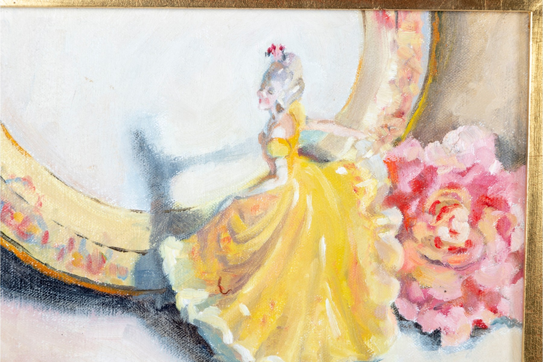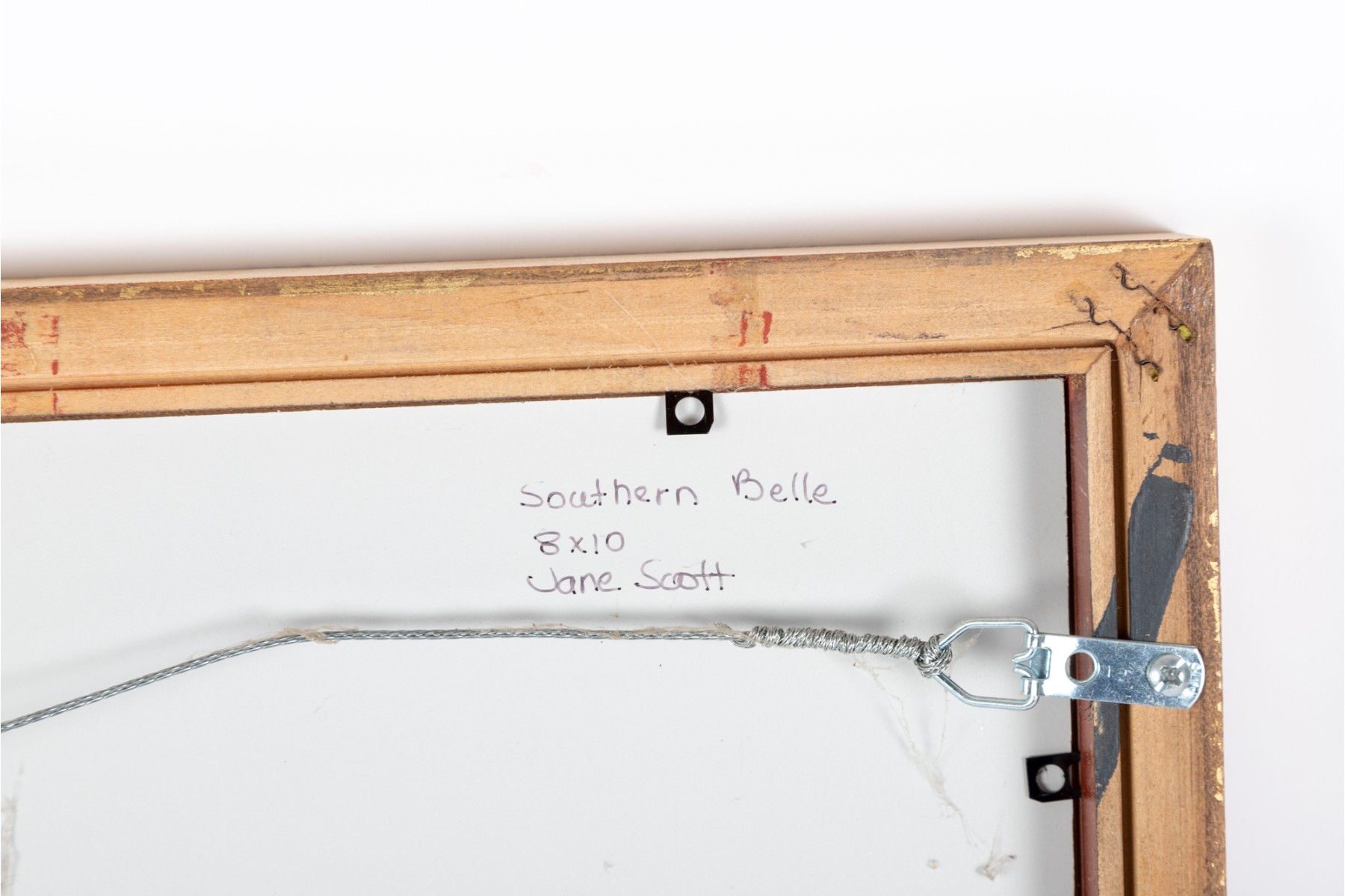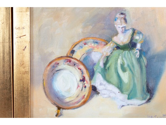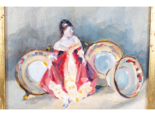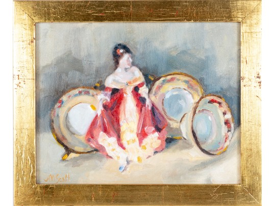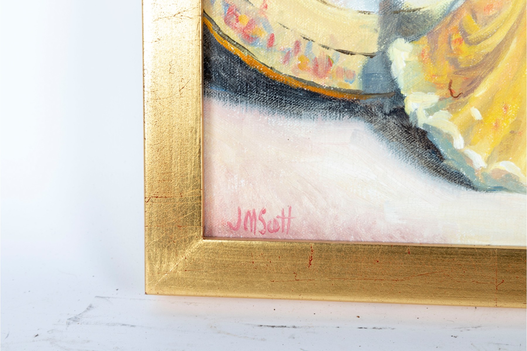 Jane Scott (American, 20th C.) "Southern Belle," "Ninette," and "My Fair Lady" oil paintings on board depicting figurines of elegant ladies in red, yellow, and green ball gowns posed with displayed china. Signed lower right and left, with titles denoted on the verso.