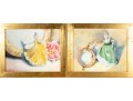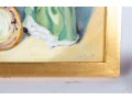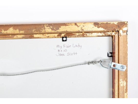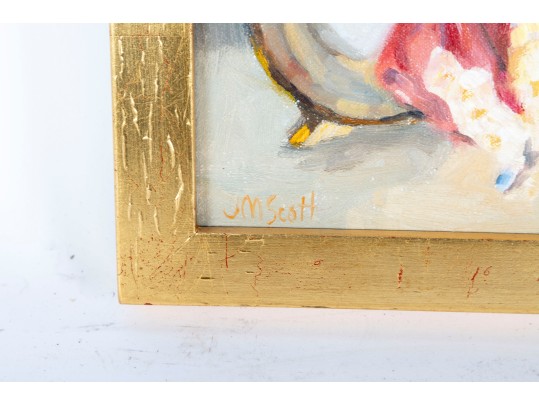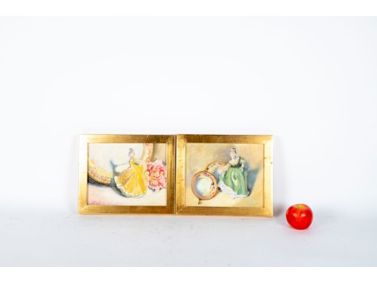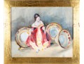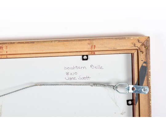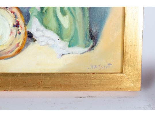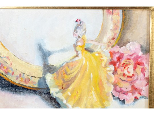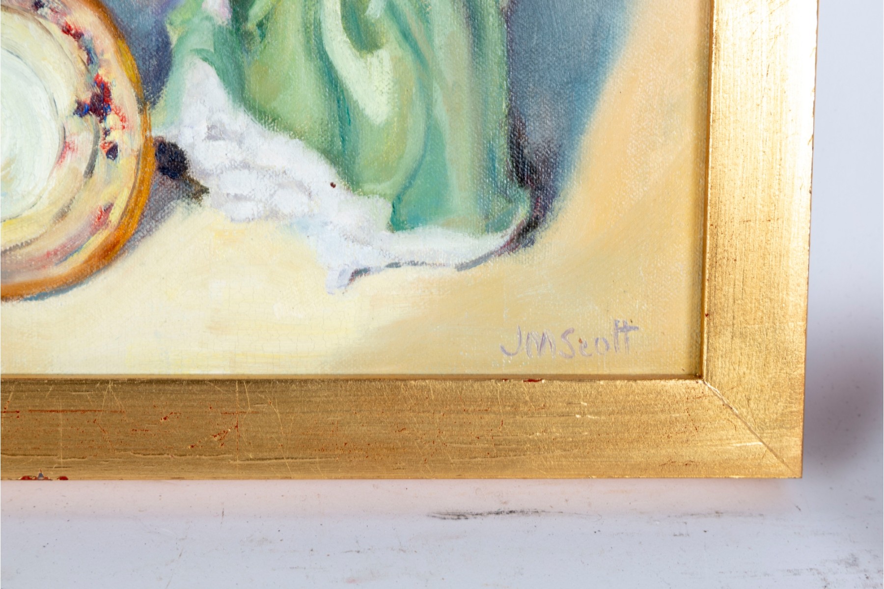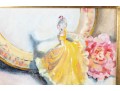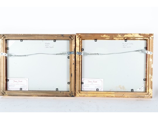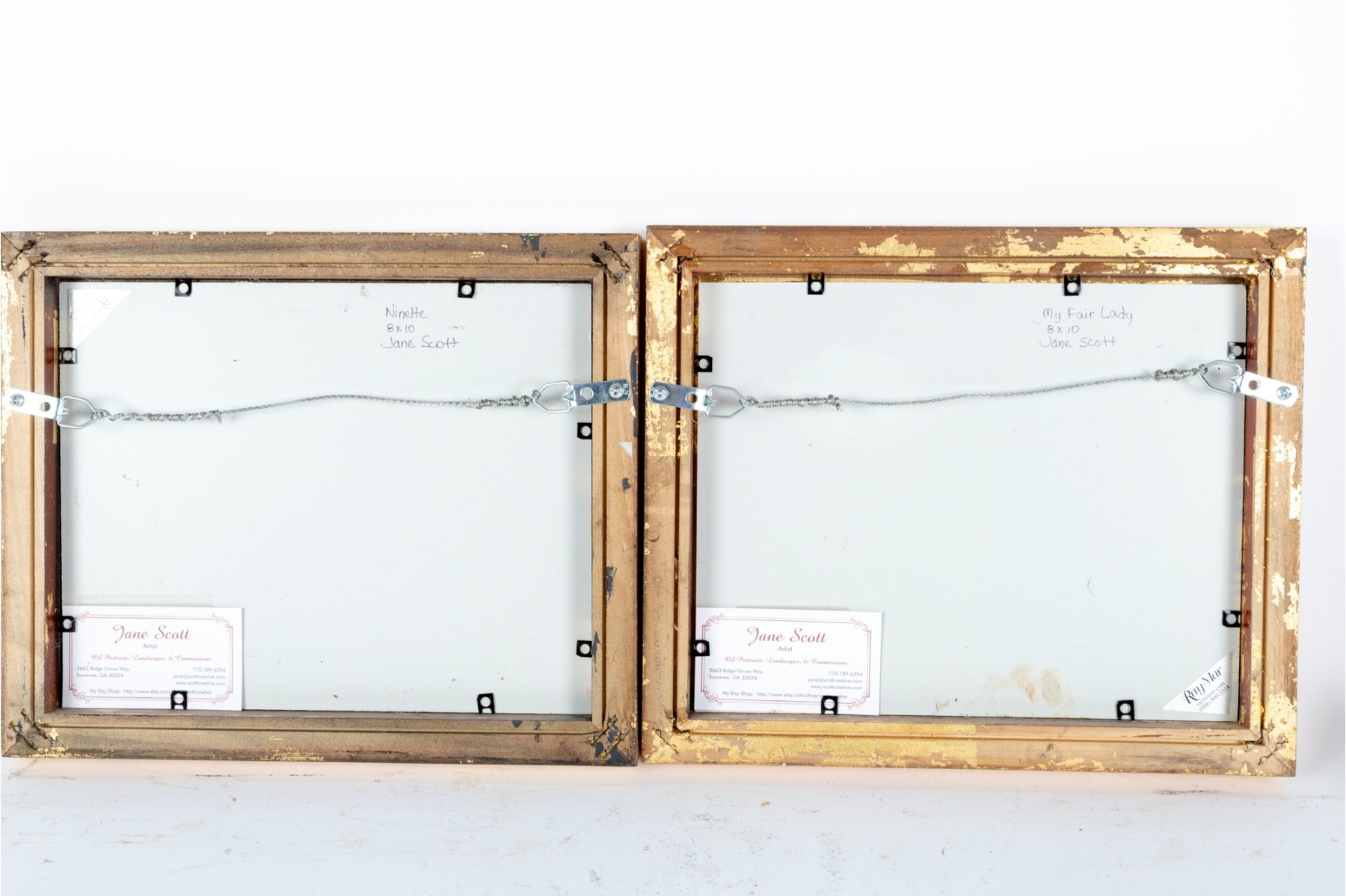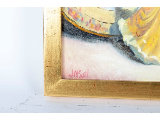 Jane Scott (American, 20th C.) "Southern Belle," "Ninette," and "My Fair Lady" oil paintings on board depicting figurines of elegant ladies in red, yellow, and green ball gowns posed with displayed china. Signed lower right and left, with titles denoted on the verso.
