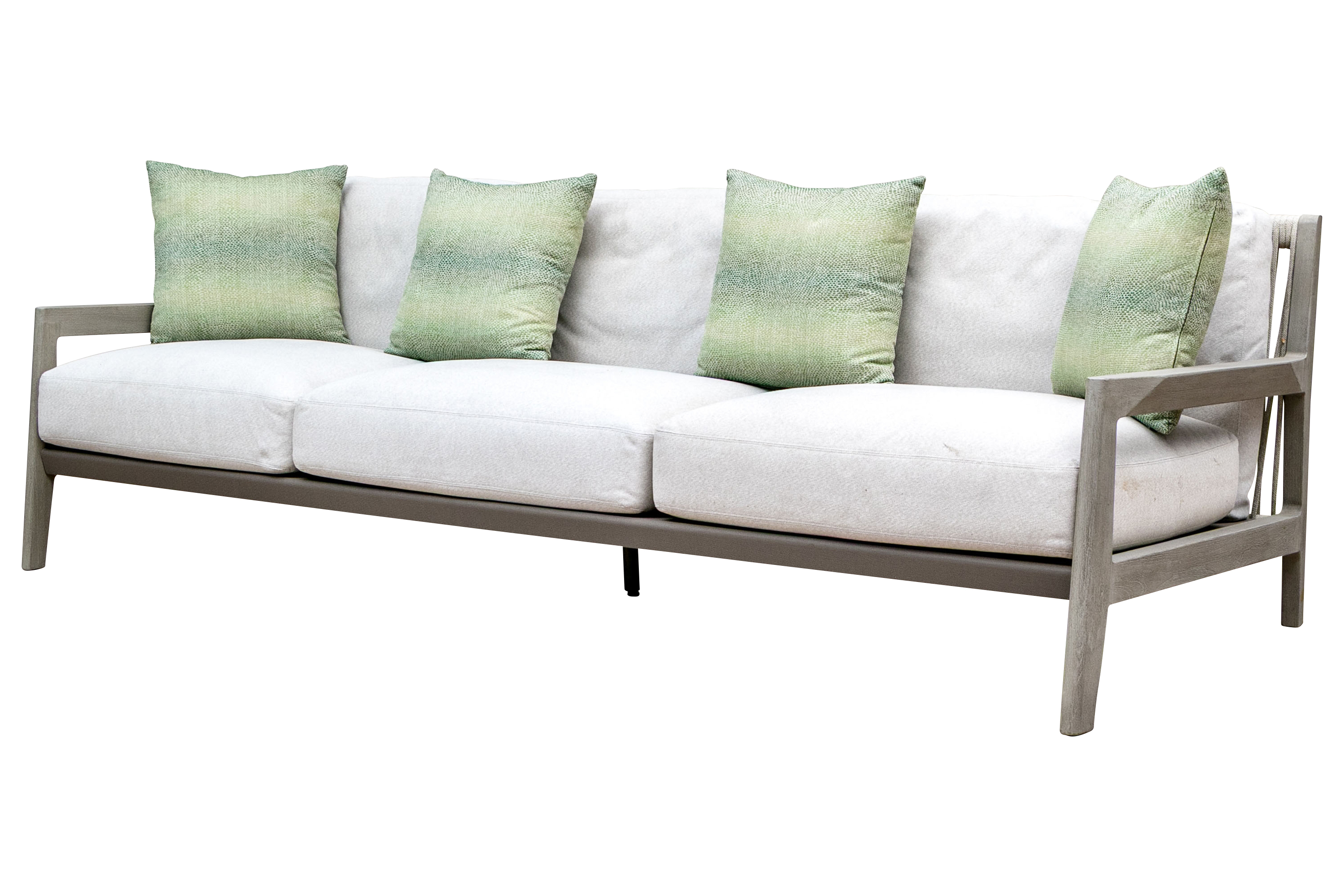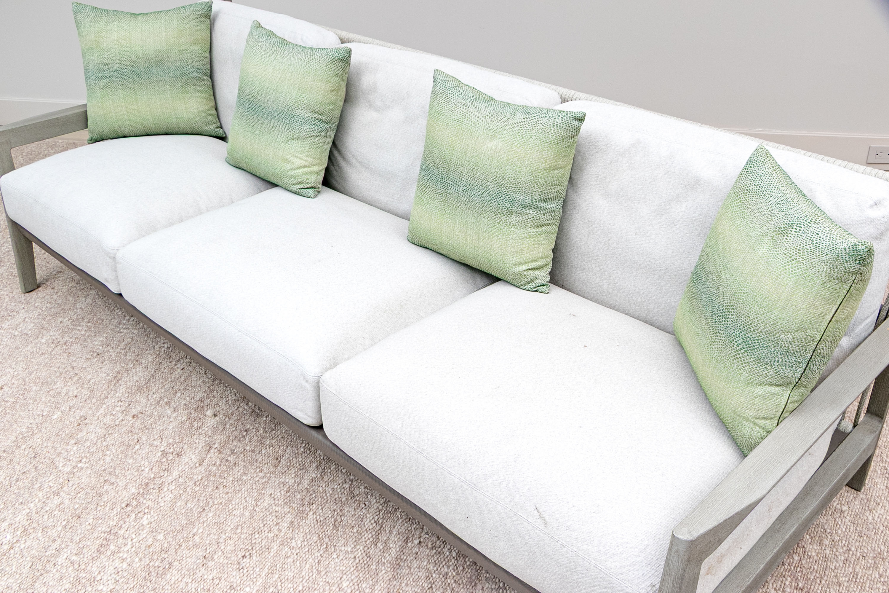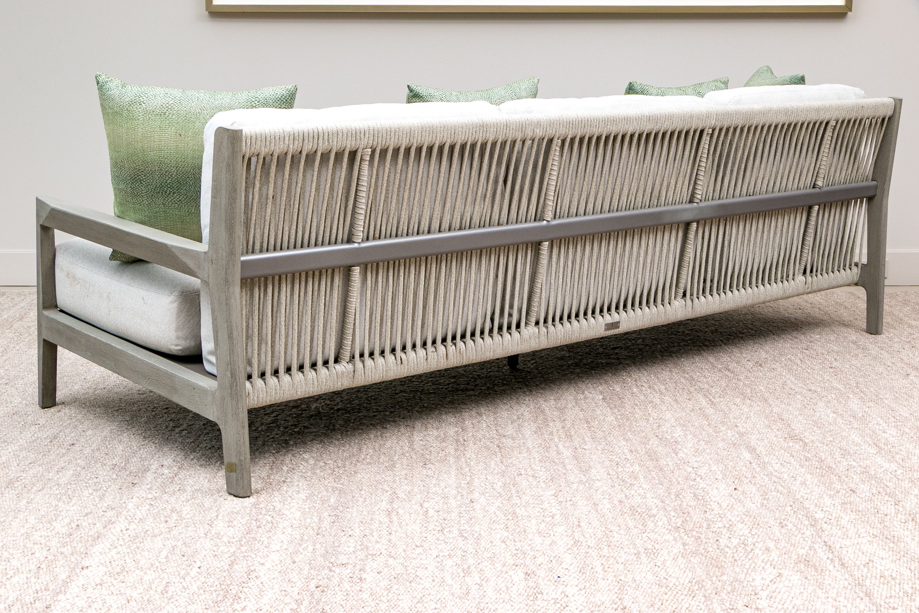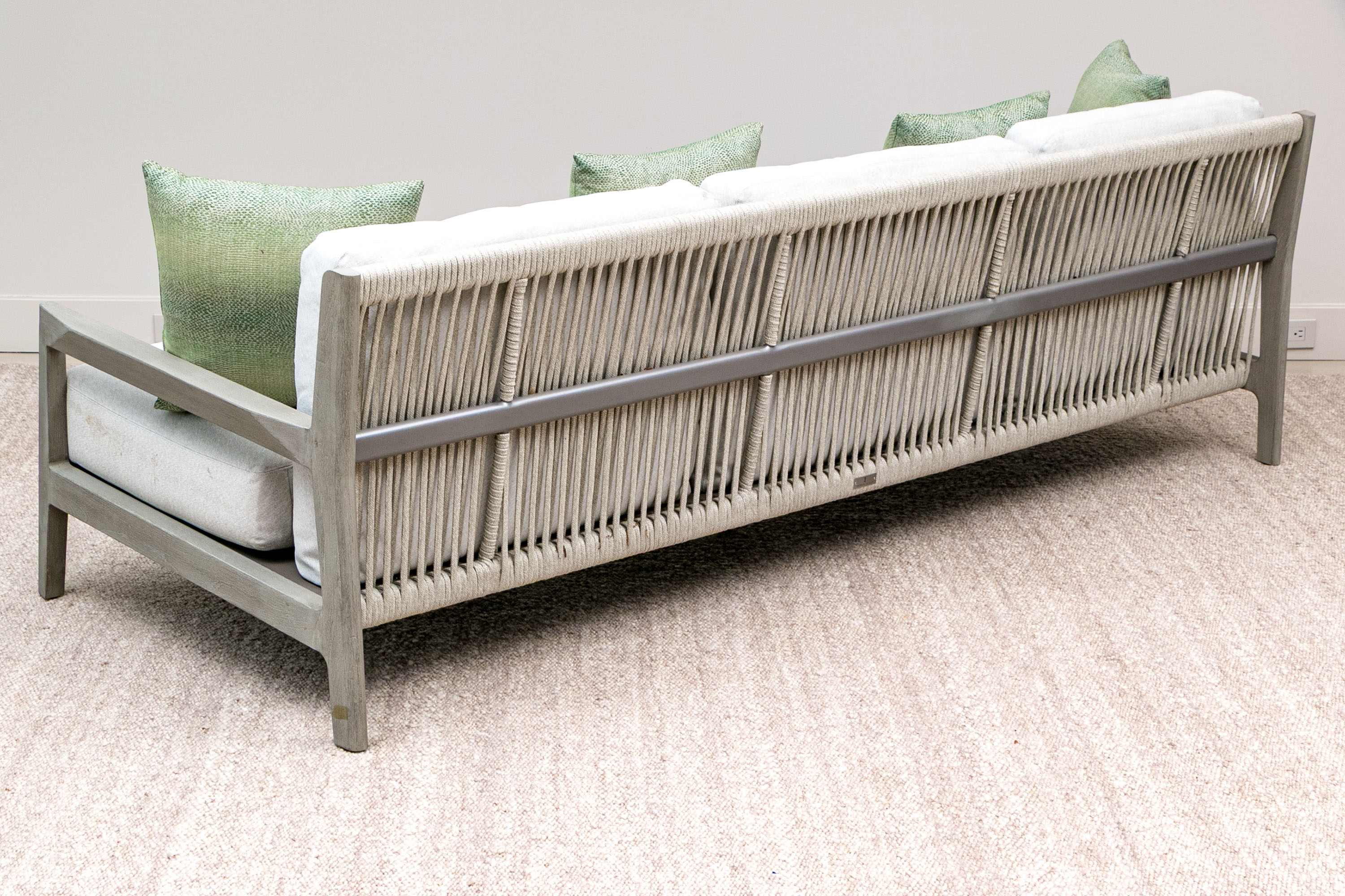 From premier makers of outdoor furniture designs Janus et Cie and from the Ares line. Three seat sofa with Teak frame in Driftwood finish with shaped arms, the back of intricately woven Polypropopylene rope with weather resistant custom cushioning in Oatmeal tone and having four Gray/ Green woven toss pillows. Very comfortable and solid feeling. The Sofa includes a protectant Weather cover.