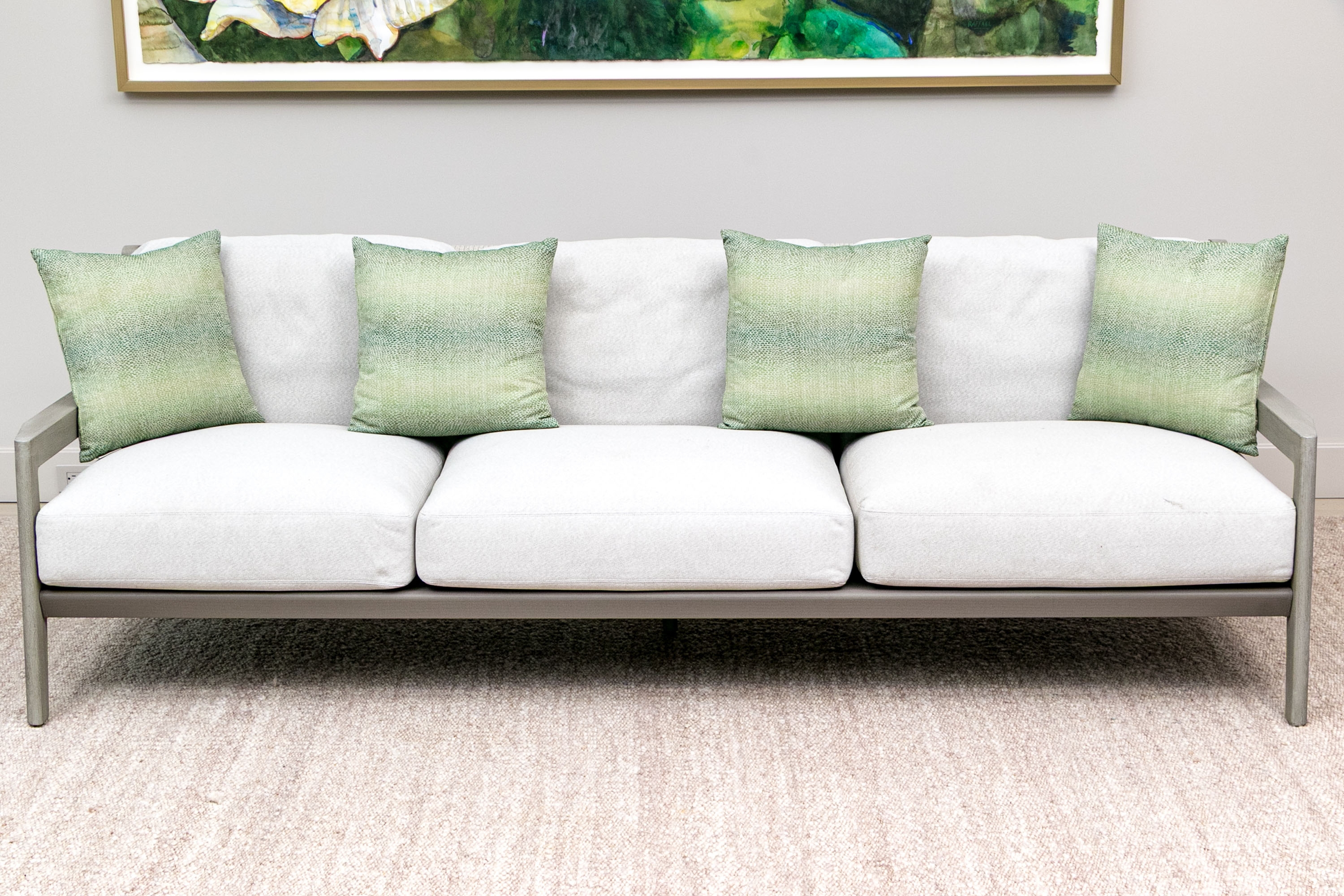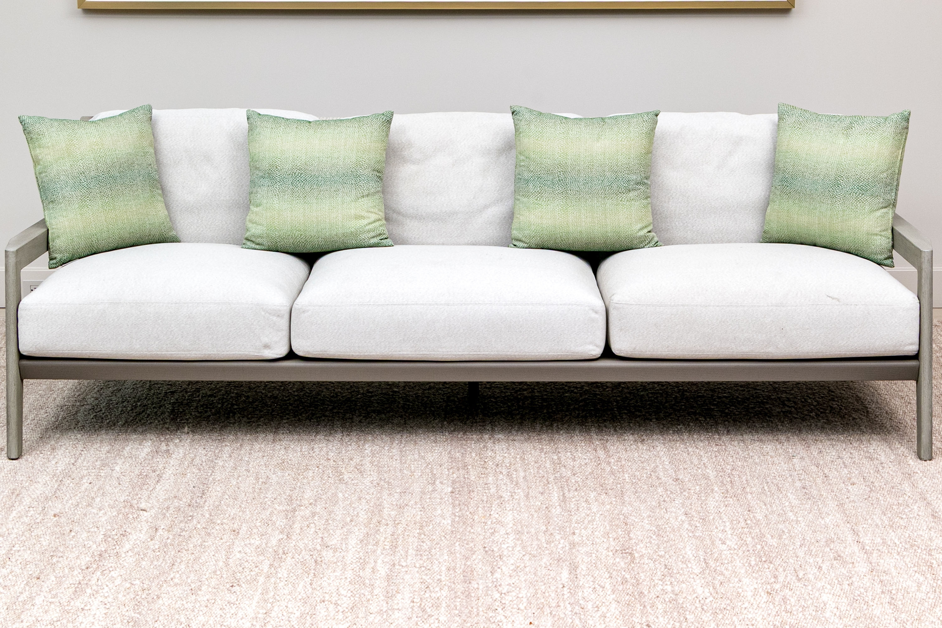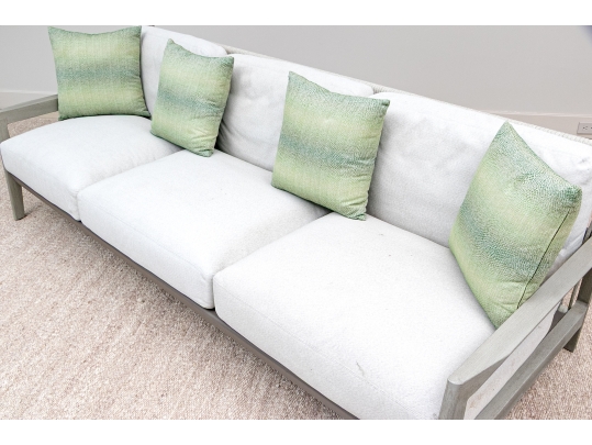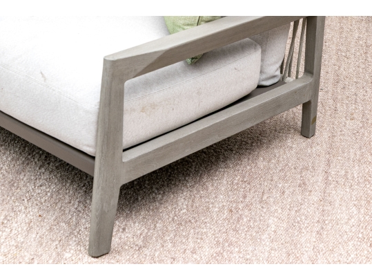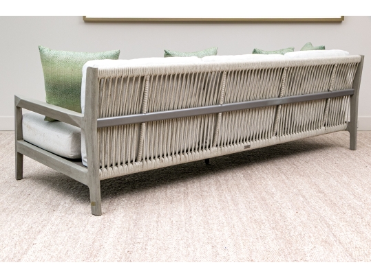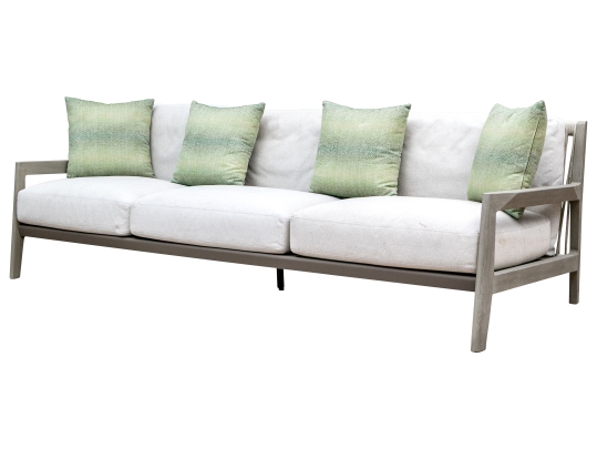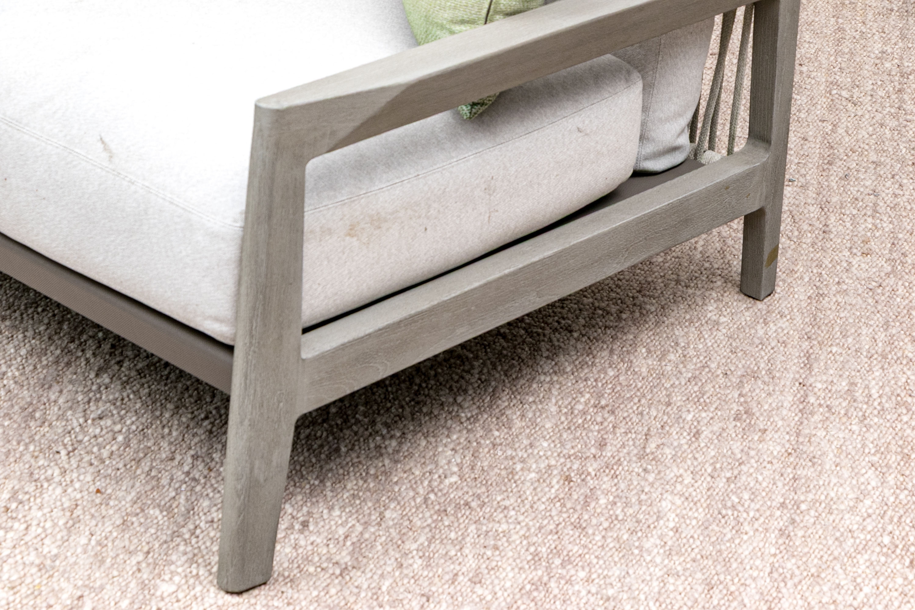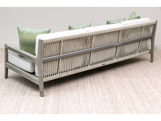 From premier makers of outdoor furniture designs Janus et Cie and from the Ares line. Three seat sofa with Teak frame in Driftwood finish with shaped arms, the back of intricately woven Polypropopylene rope with weather resistant custom cushioning in Oatmeal tone and having four Gray/ Green woven toss pillows. Very comfortable and solid feeling. The Sofa includes a protectant Weather cover.