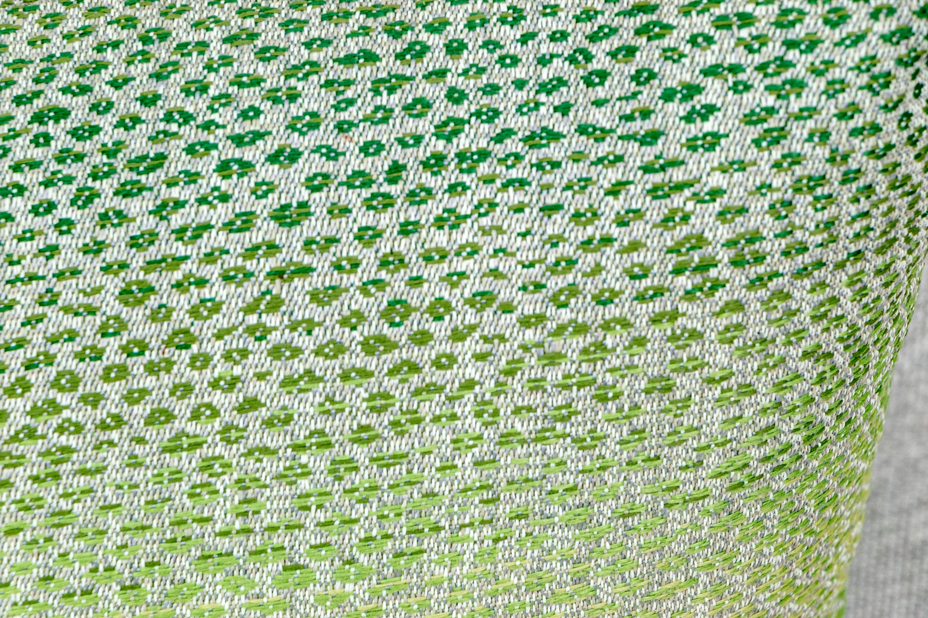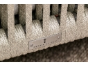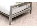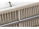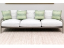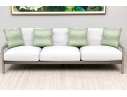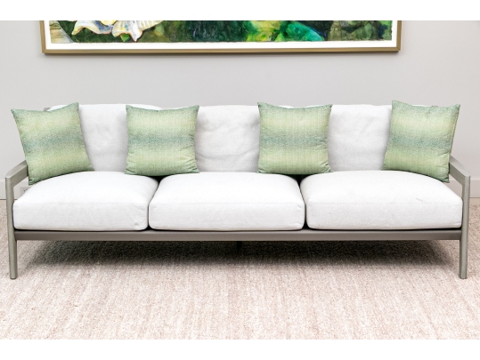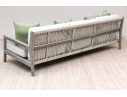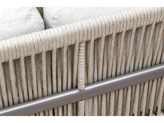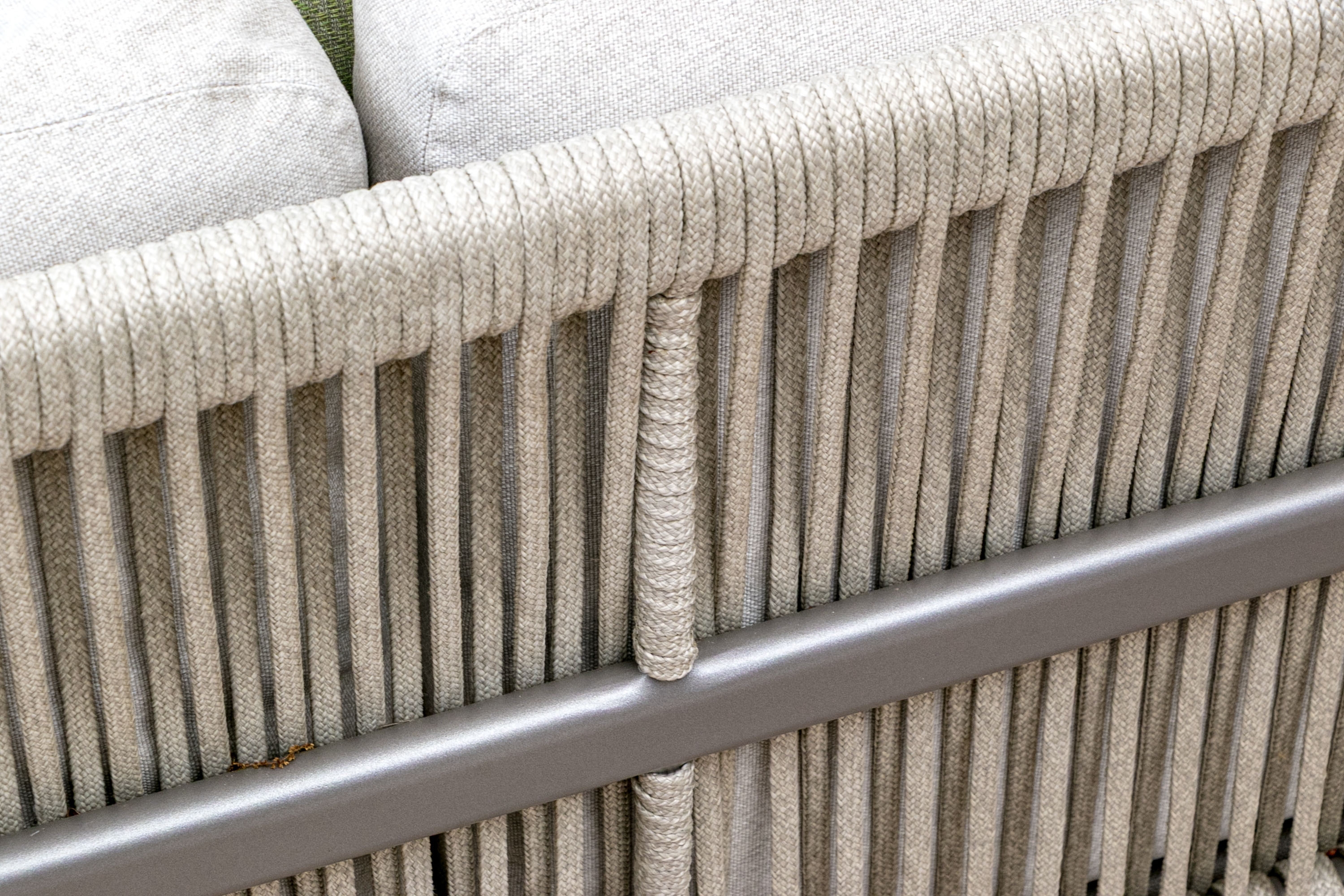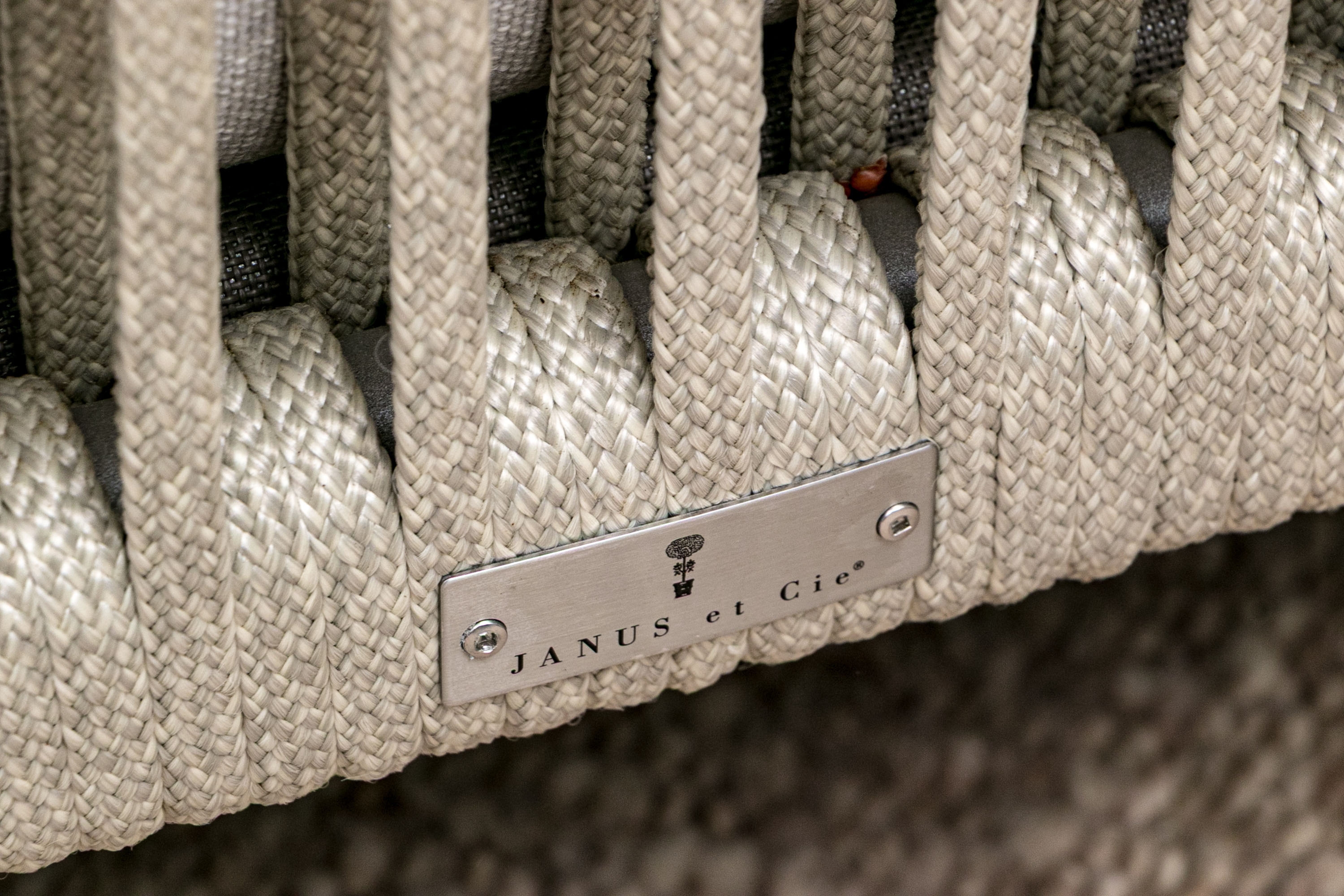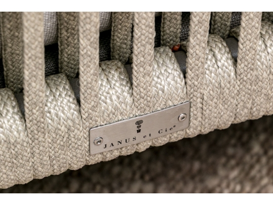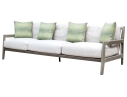 From premier makers of outdoor furniture designs Janus et Cie and from the Ares line. Three seat sofa with Teak frame in Driftwood finish with shaped arms, the back of intricately woven Polypropopylene rope with weather resistant custom cushioning in Oatmeal tone and having four Gray/ Green woven toss pillows. Very comfortable and solid feeling. The Sofa includes a protectant Weather cover.