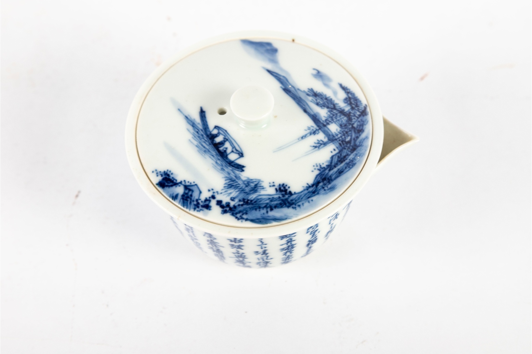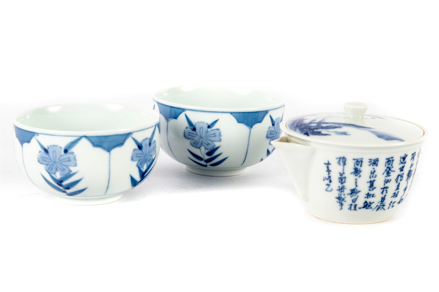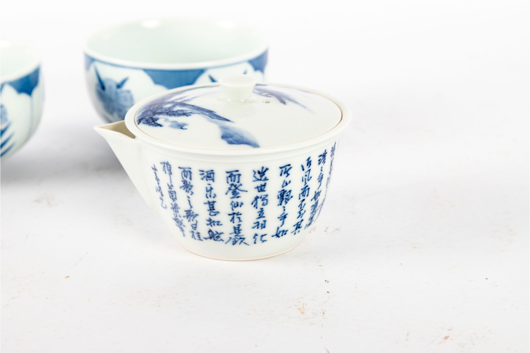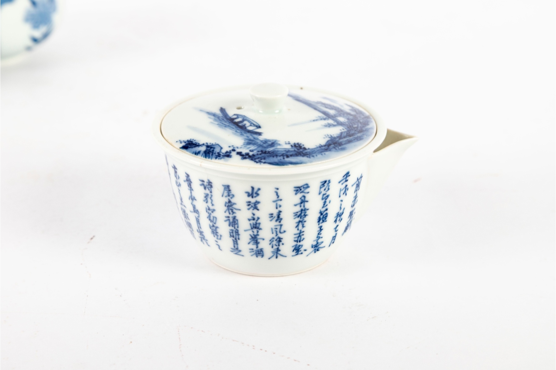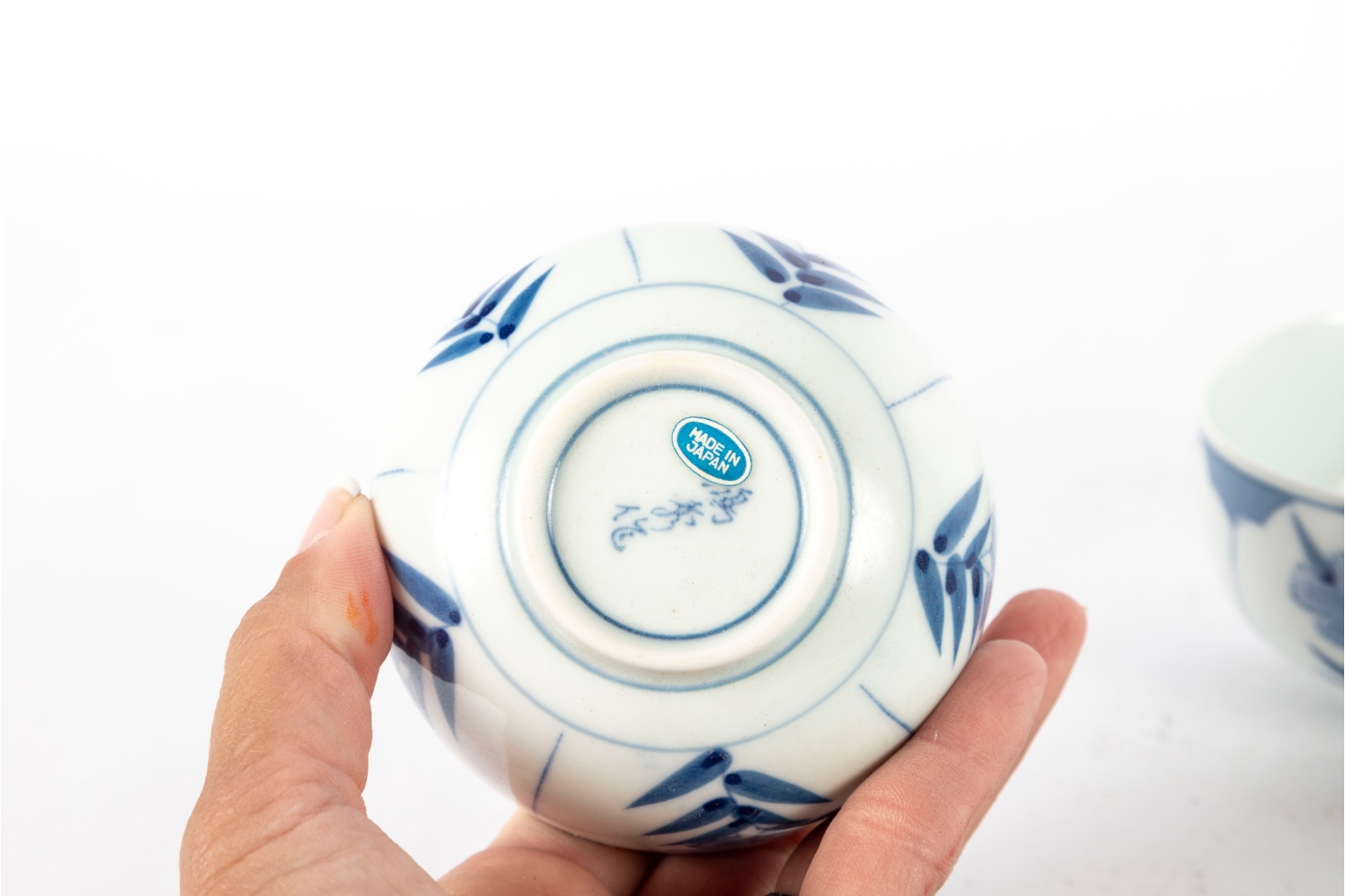Charming three-piece Japanese porcelain tea set including one small lidded sugar and two teacups. The sugar pot is decorated with hand-painted cobalt blue calligraphy and a scenic landscape featuring a boat and mountains on the lid. The two matching teacups feature stylized blue floral motifs framed by a scalloped band design. Each piece is marked and labeled Made in Japan.