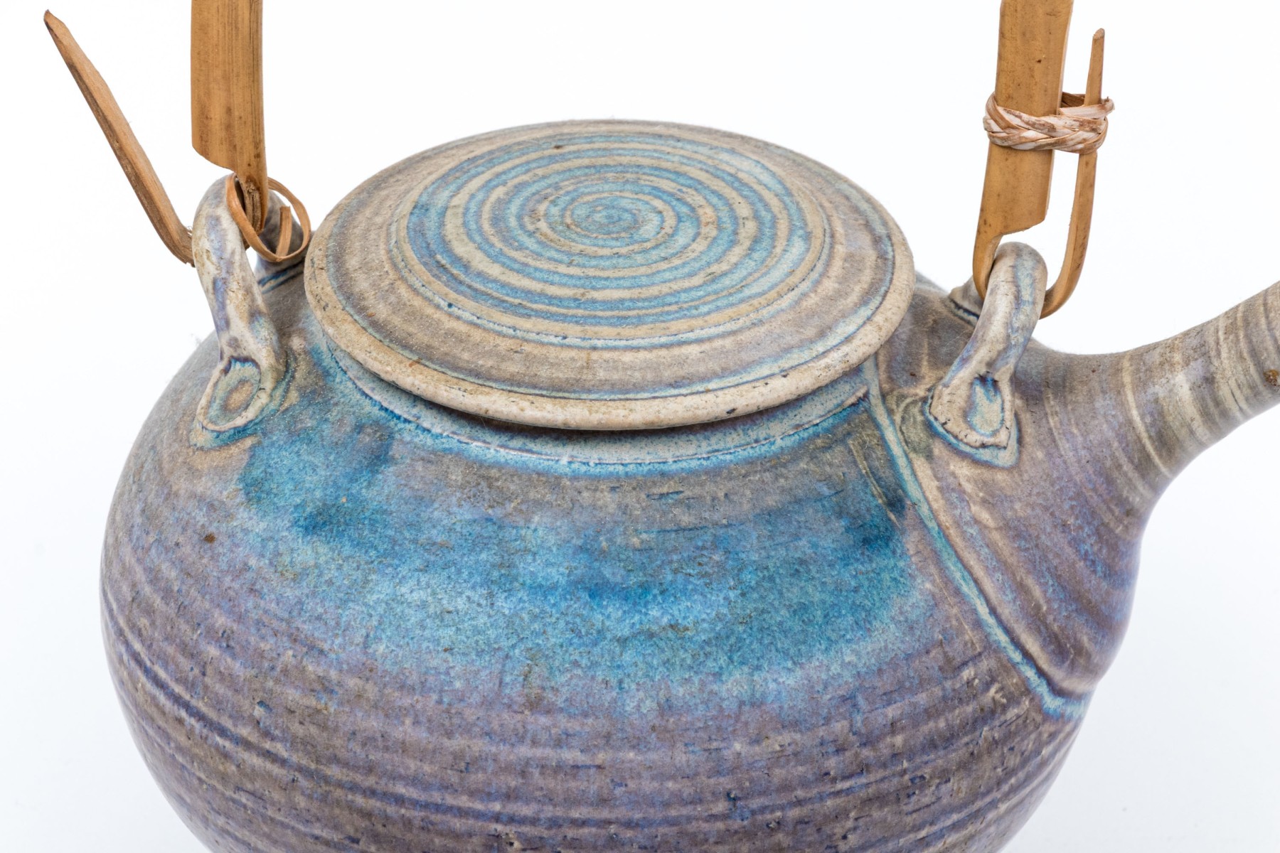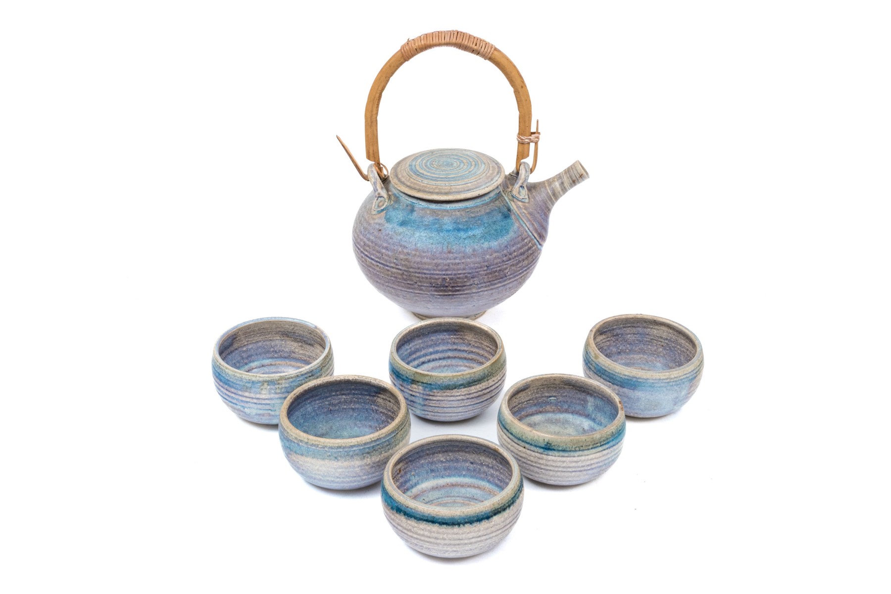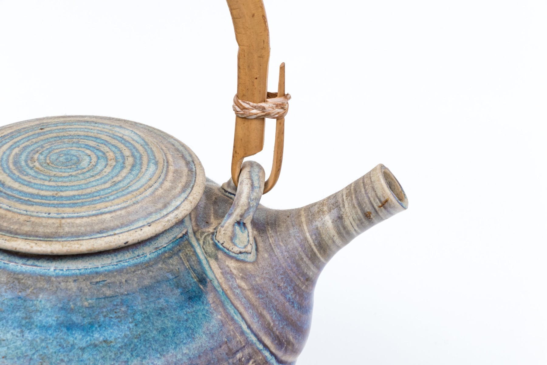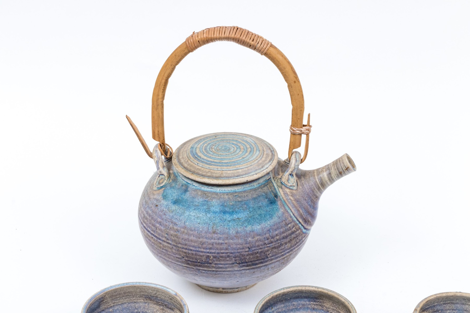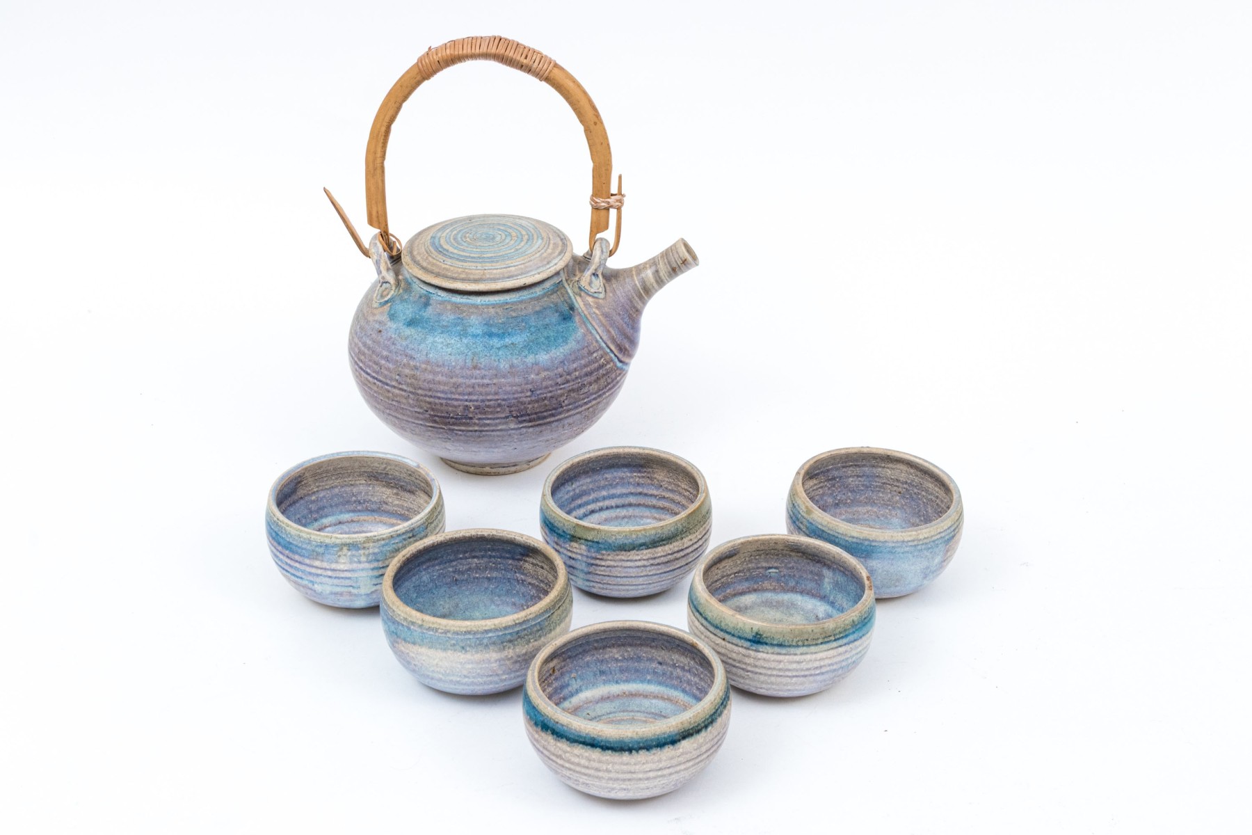 Wonderfully potted and glazed with a blue and white finish with bamboo handle to the lidded teapot. Cups and teapot are marked underfoot.