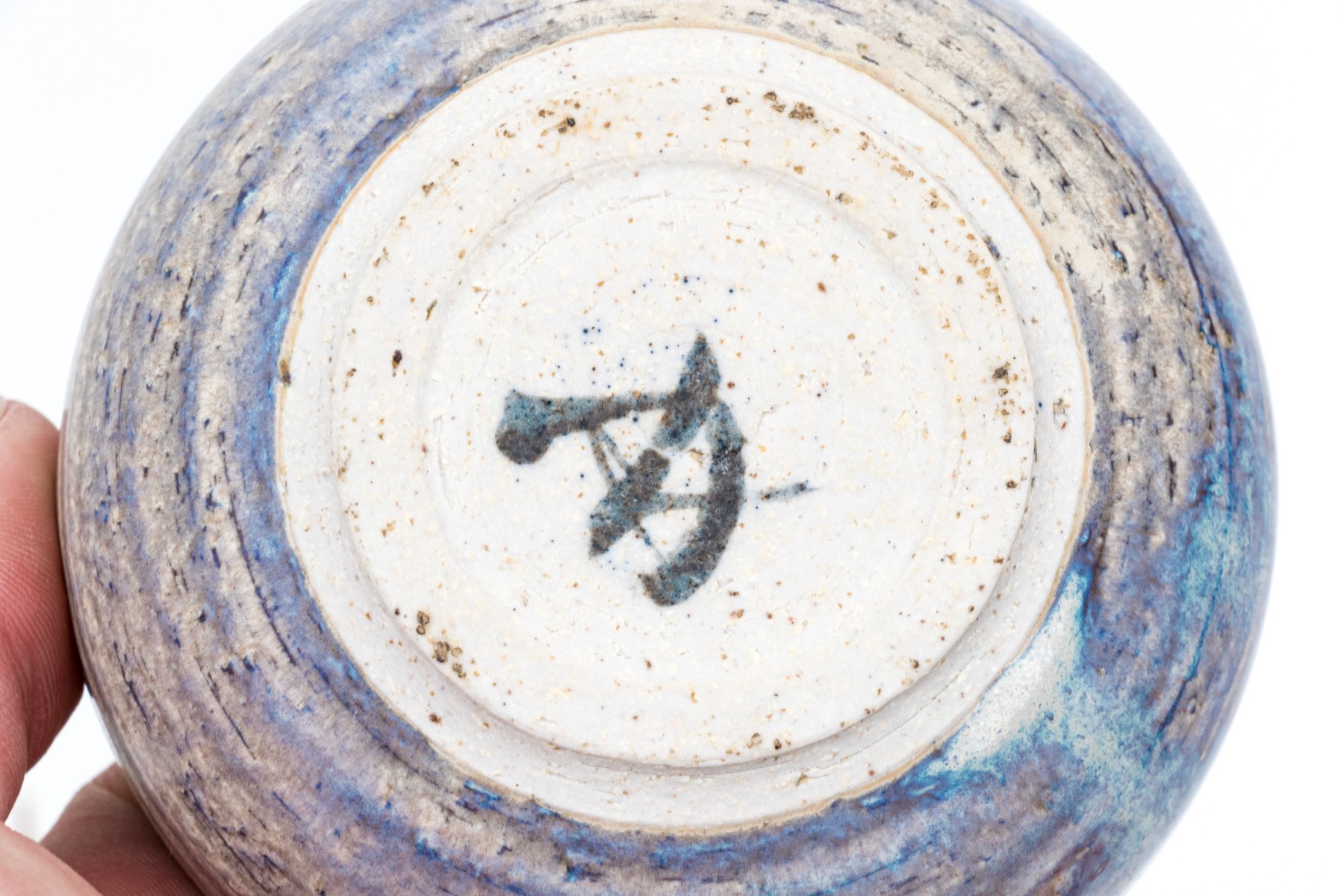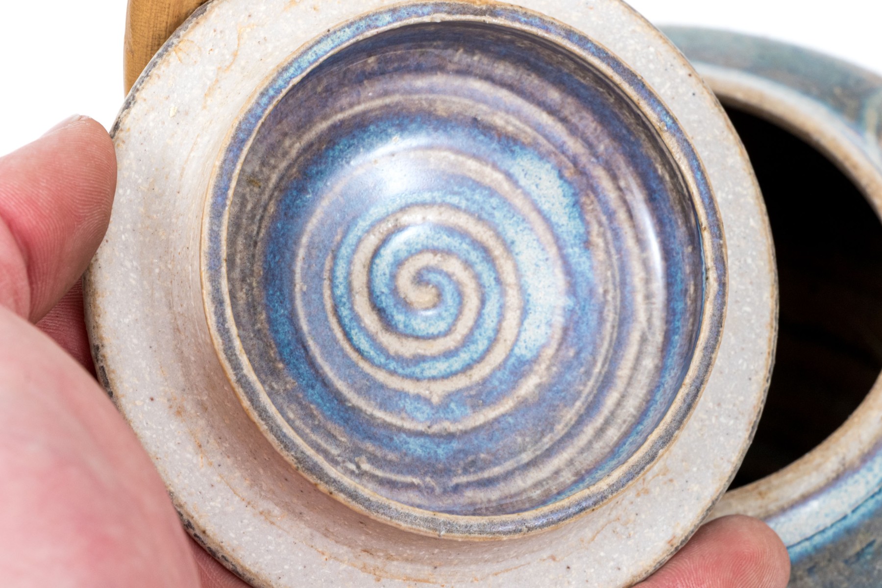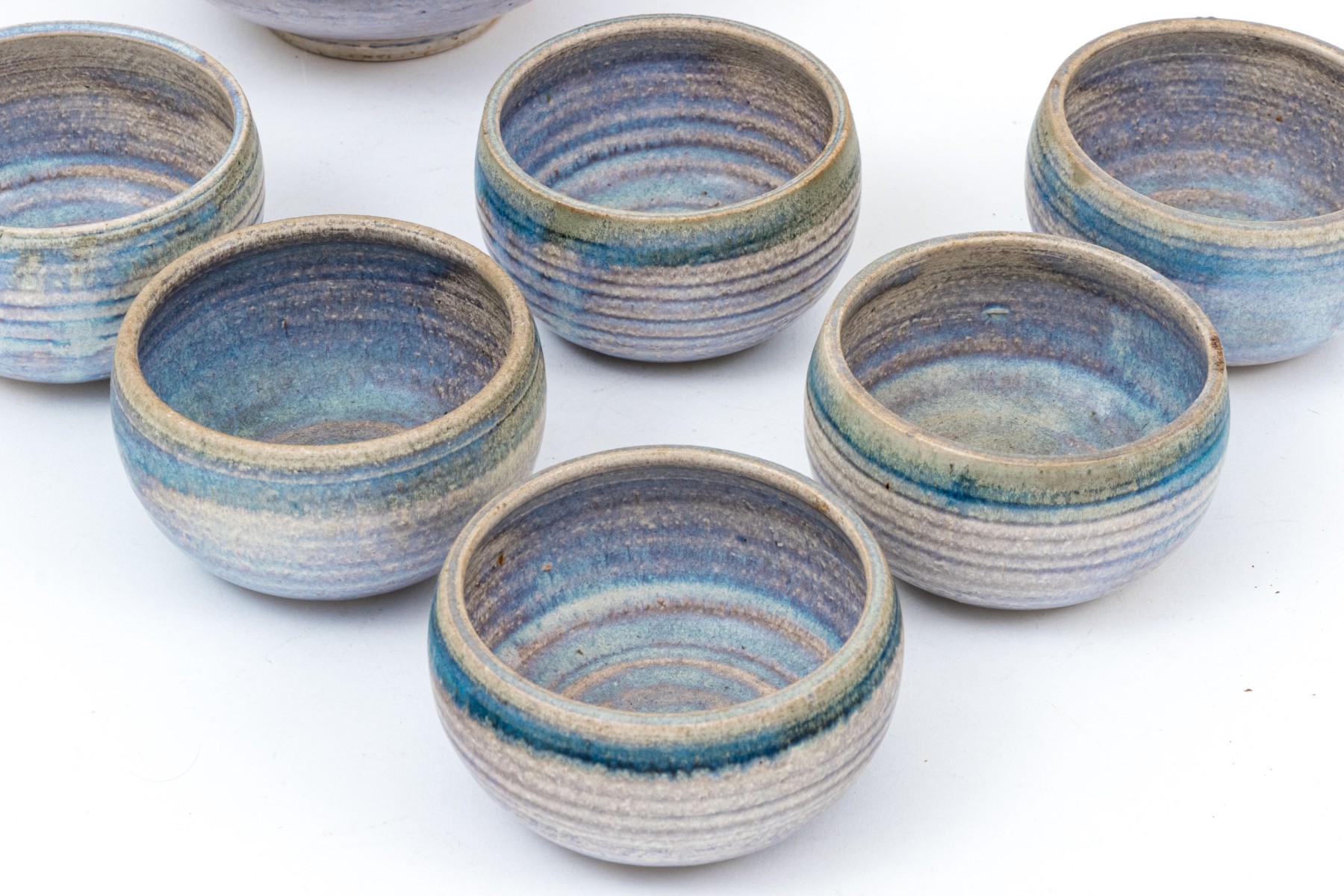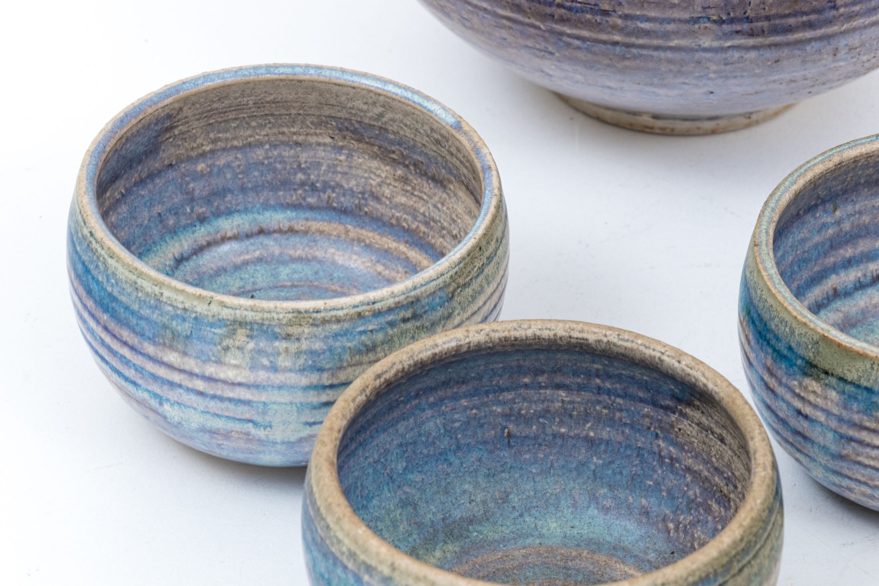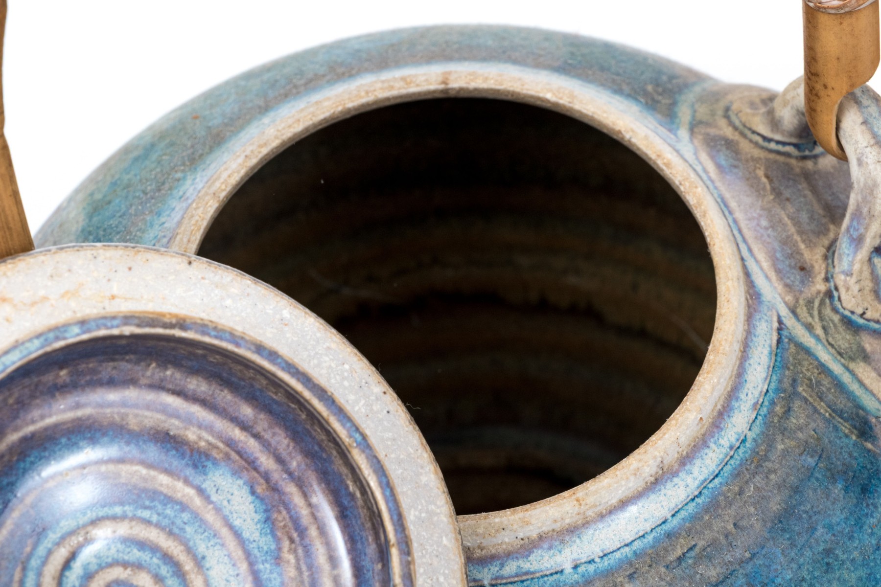 Wonderfully potted and glazed with a blue and white finish with bamboo handle to the lidded teapot. Cups and teapot are marked underfoot.