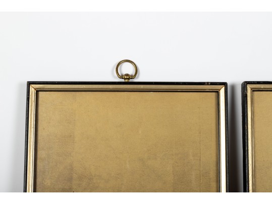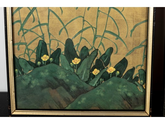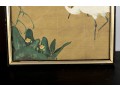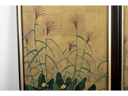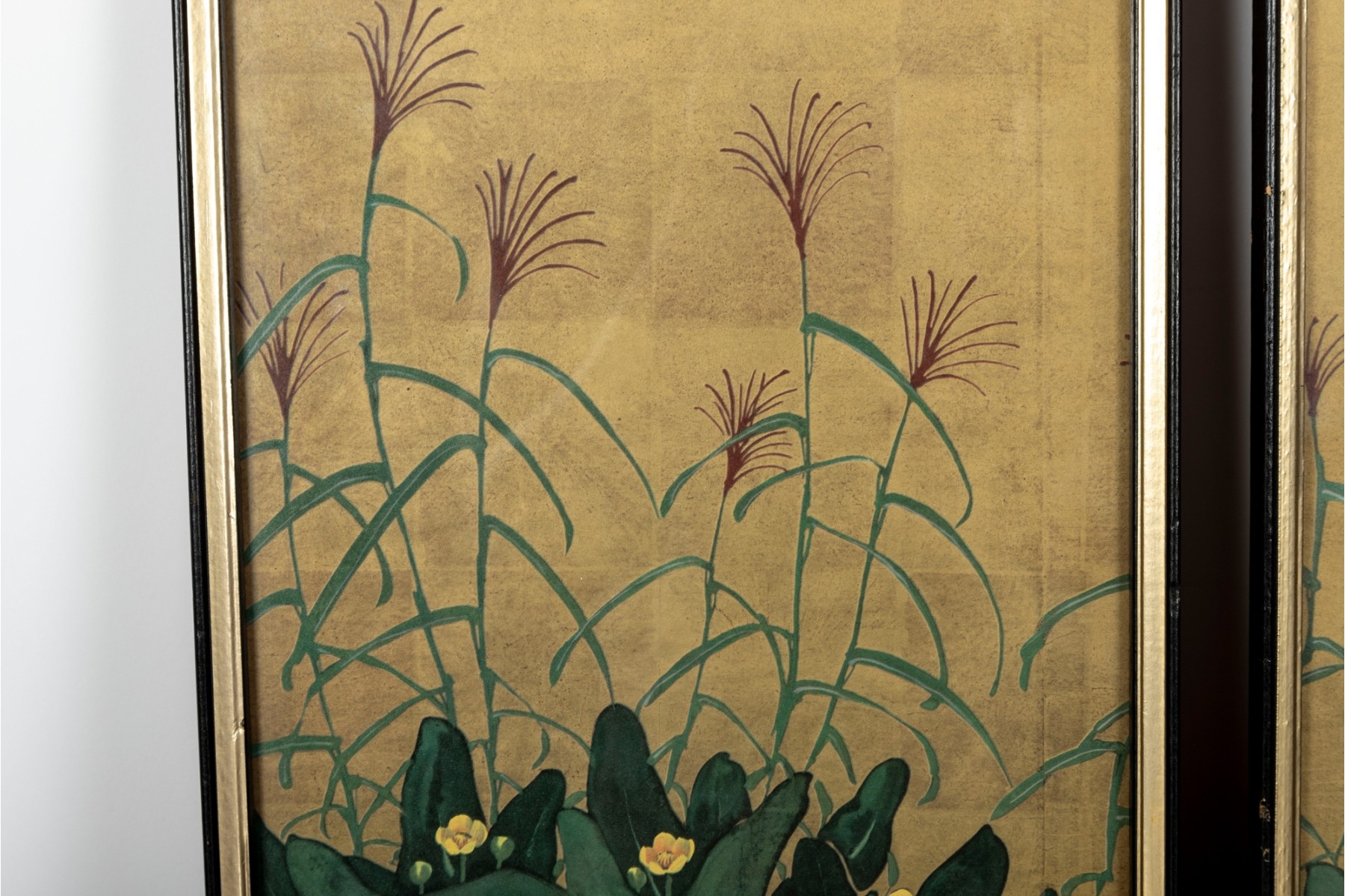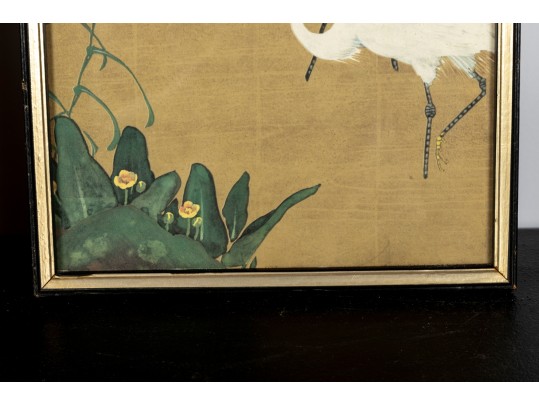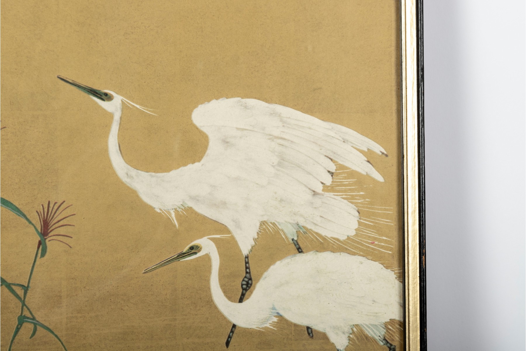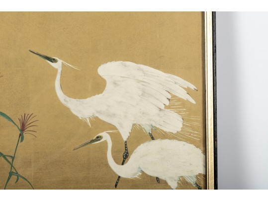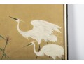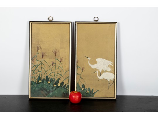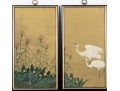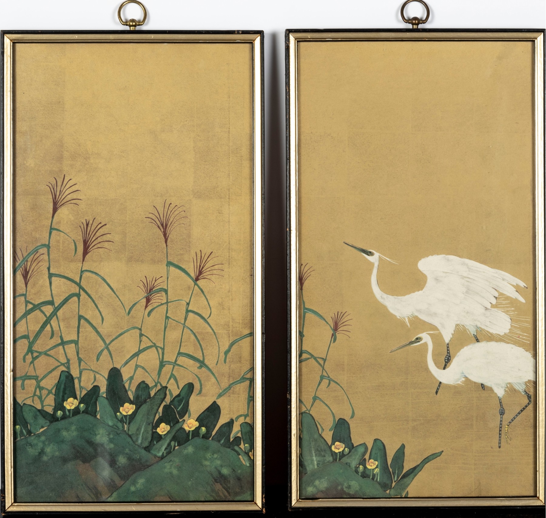 A lovely Japanese diptych of painted panels depicting white cranes or egrets walking along vibrant green, yellow, and red foliage against a gilt yellow background. Displayed without glass in silvered frames with hoops at the top for hanging.