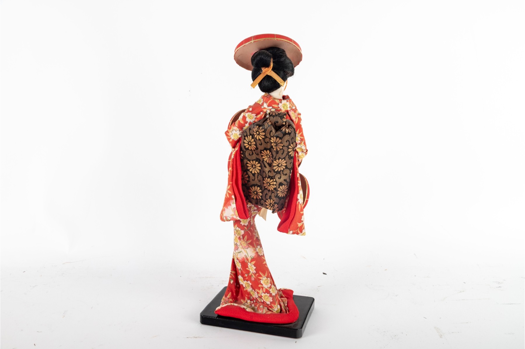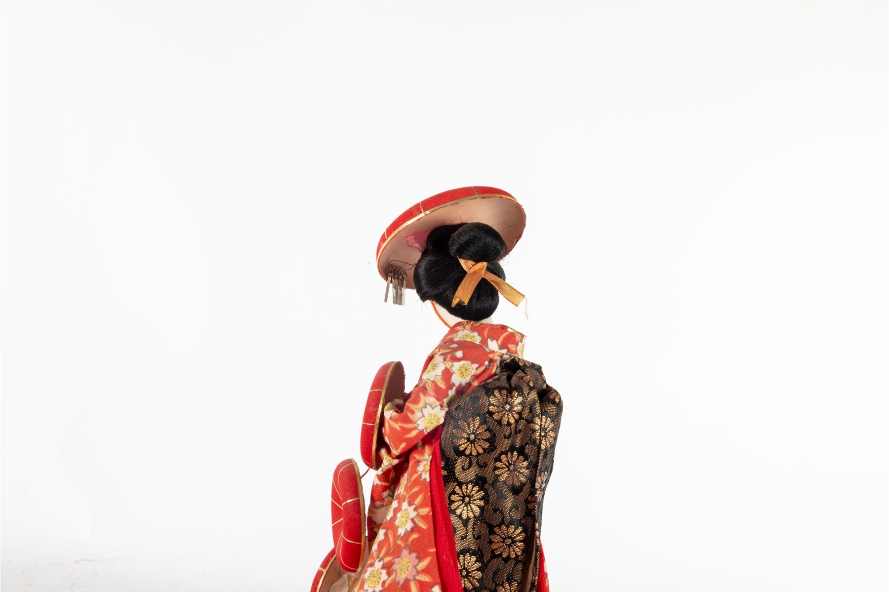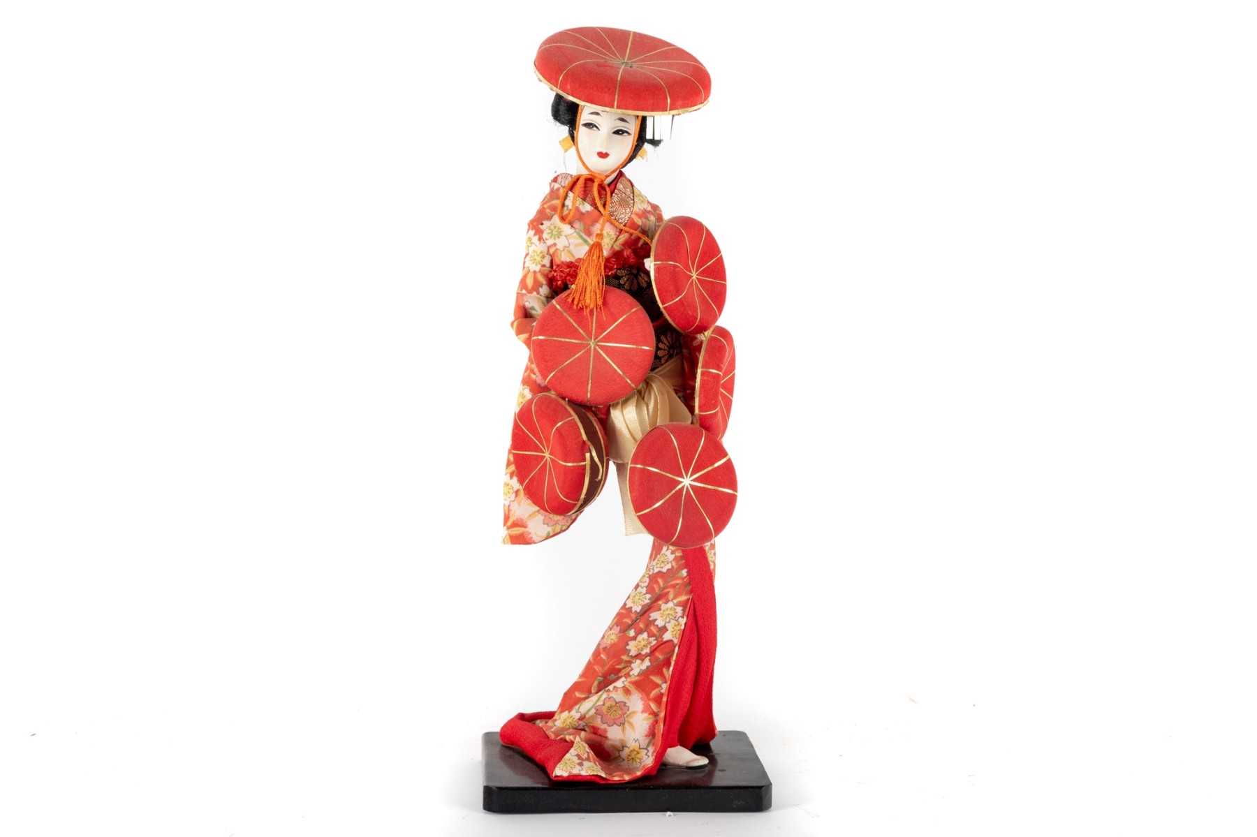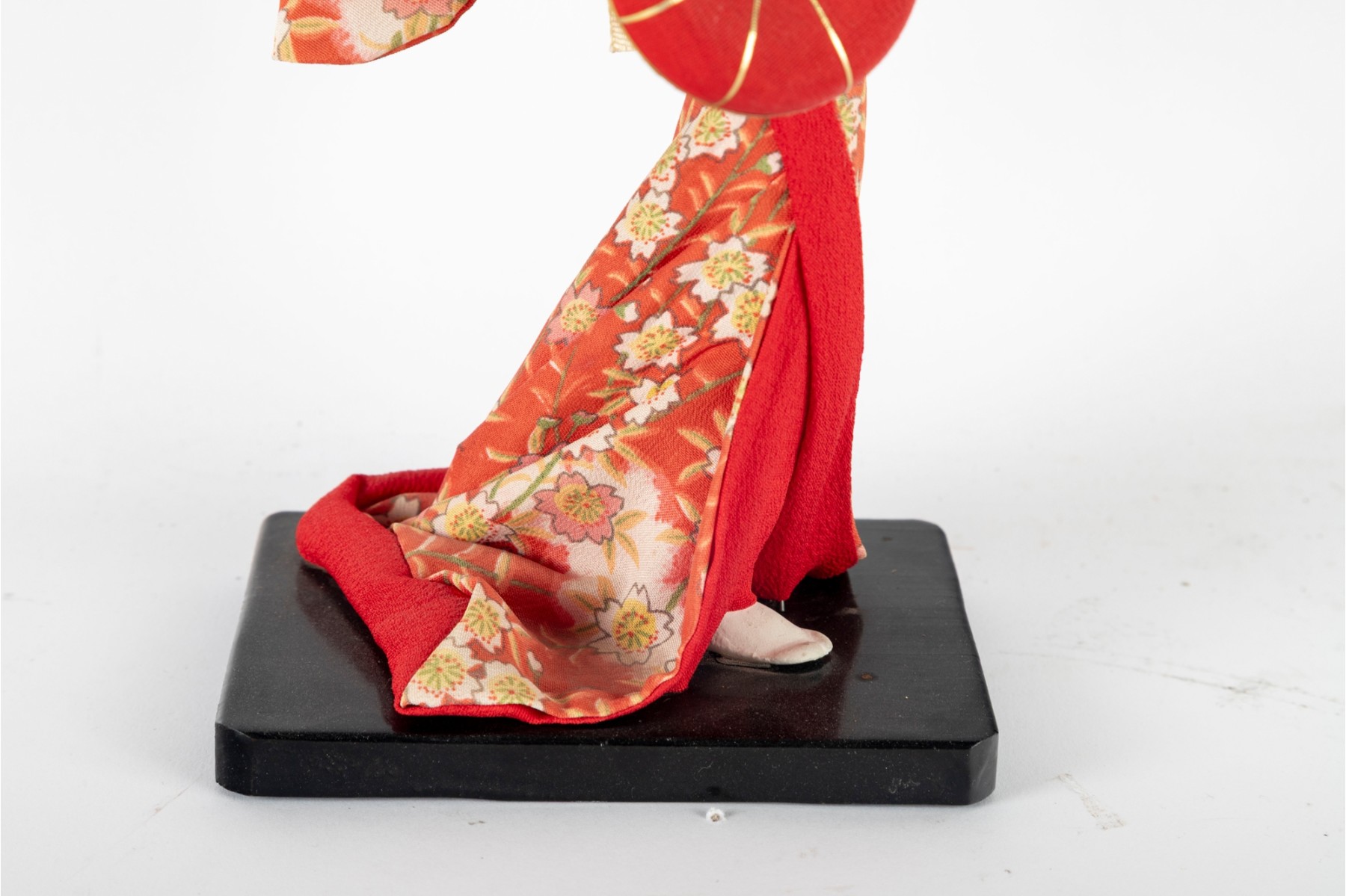 A traditional Japanese Geisha doll dressed in a vibrant red floral kimono, adorned with multiple miniature umbrellas as part of her performance attire. Mounted on a black display base, this handcrafted figure features delicate facial details and fine textile work.