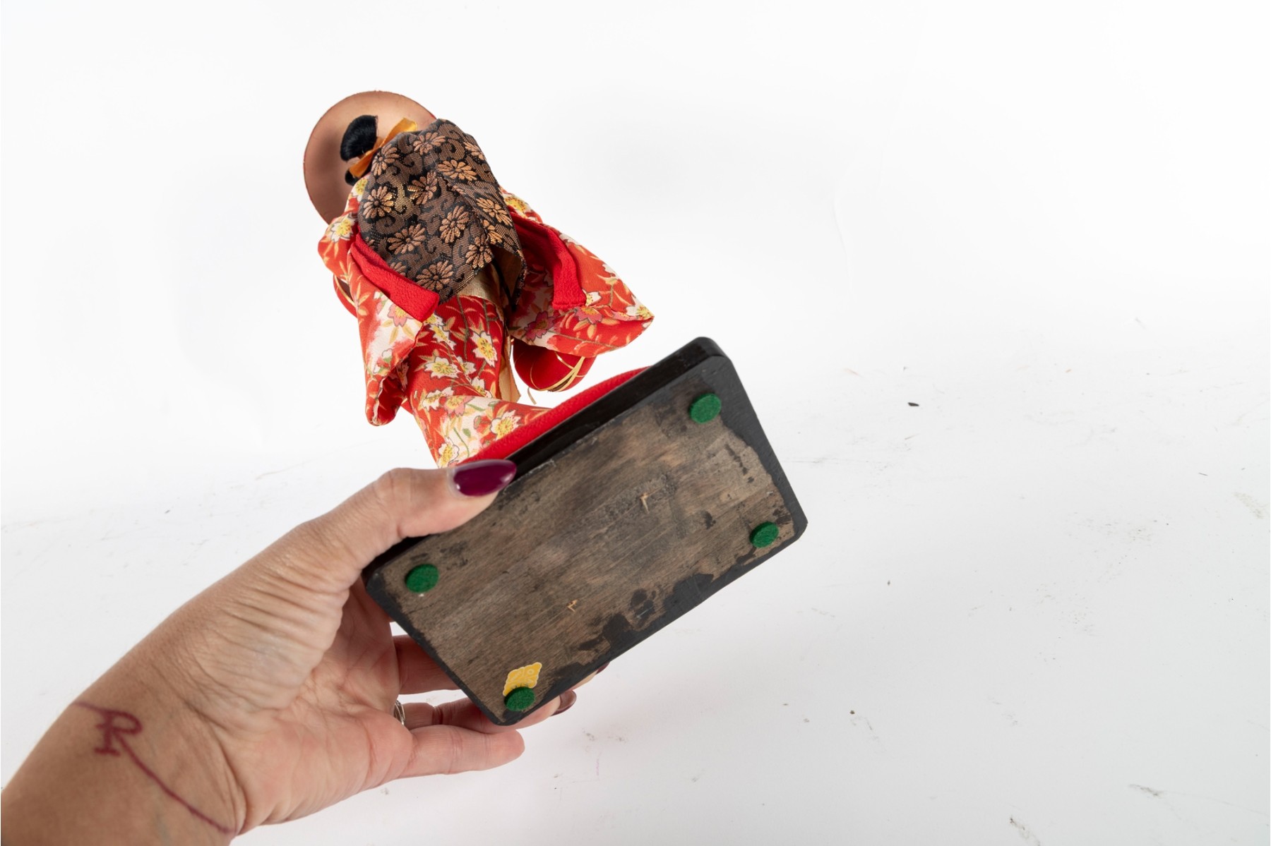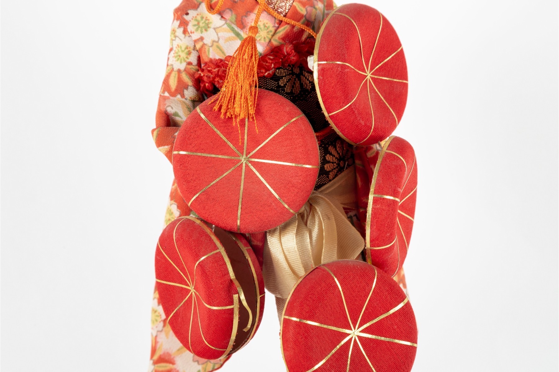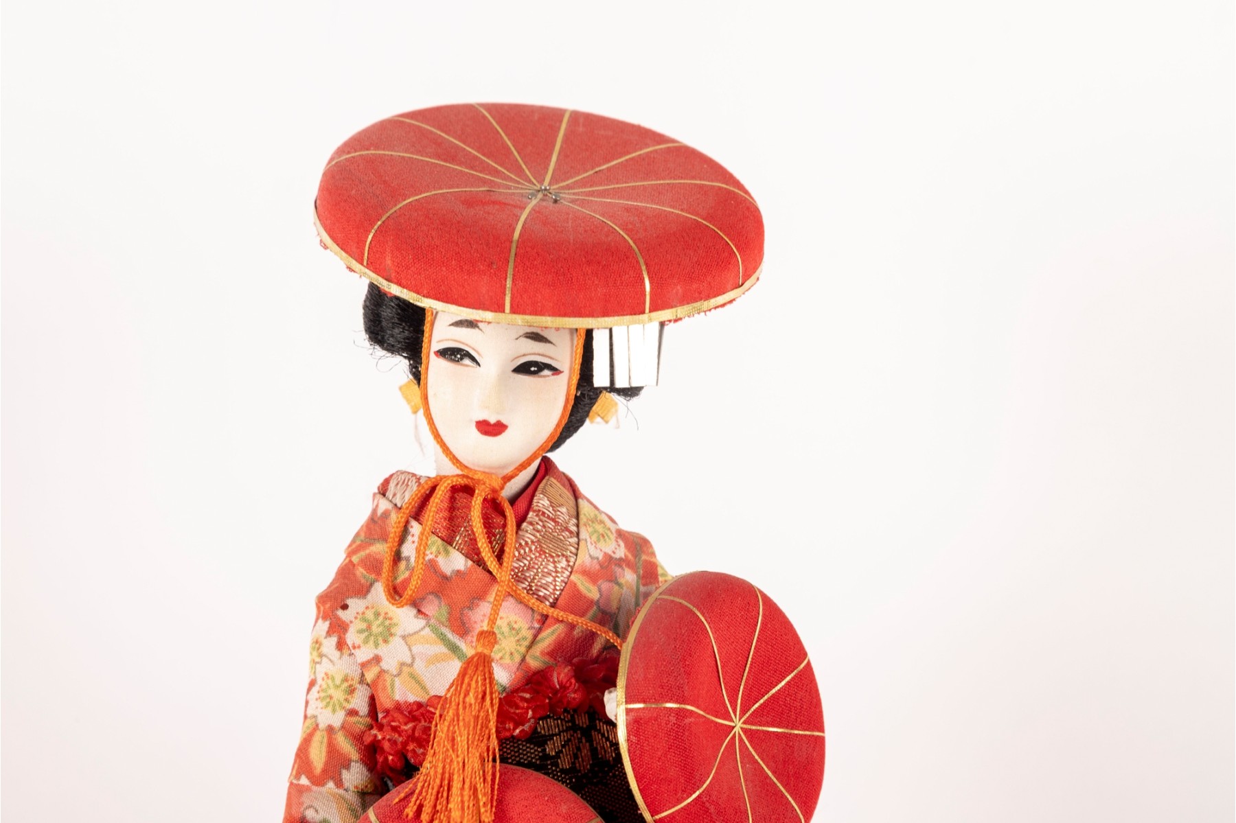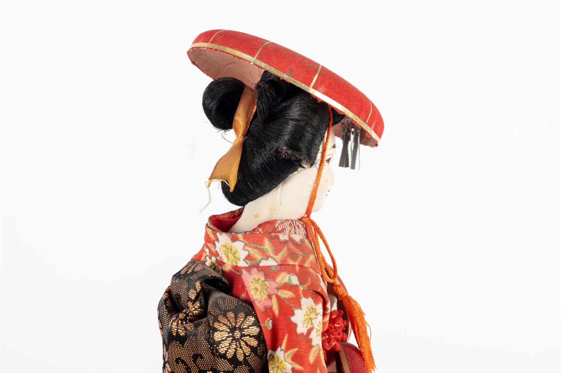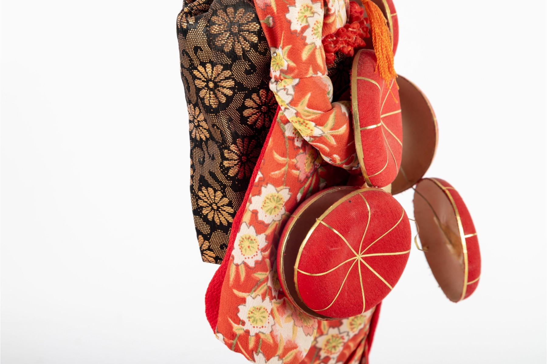 A traditional Japanese Geisha doll dressed in a vibrant red floral kimono, adorned with multiple miniature umbrellas as part of her performance attire. Mounted on a black display base, this handcrafted figure features delicate facial details and fine textile work.