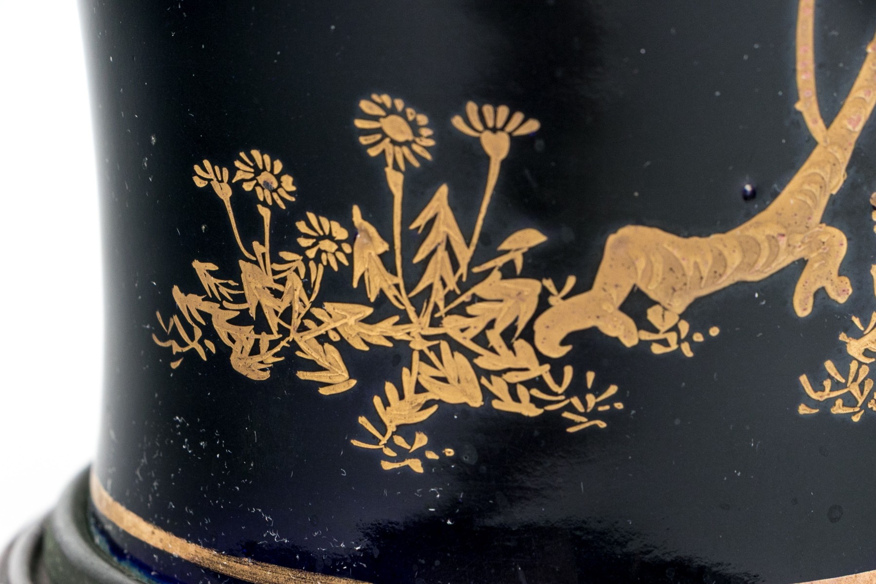 Mounted on carved wood base the cobalt ground lamp with gilt finished foliate and bird motifs with geometric decorated band around the mouth rim.
