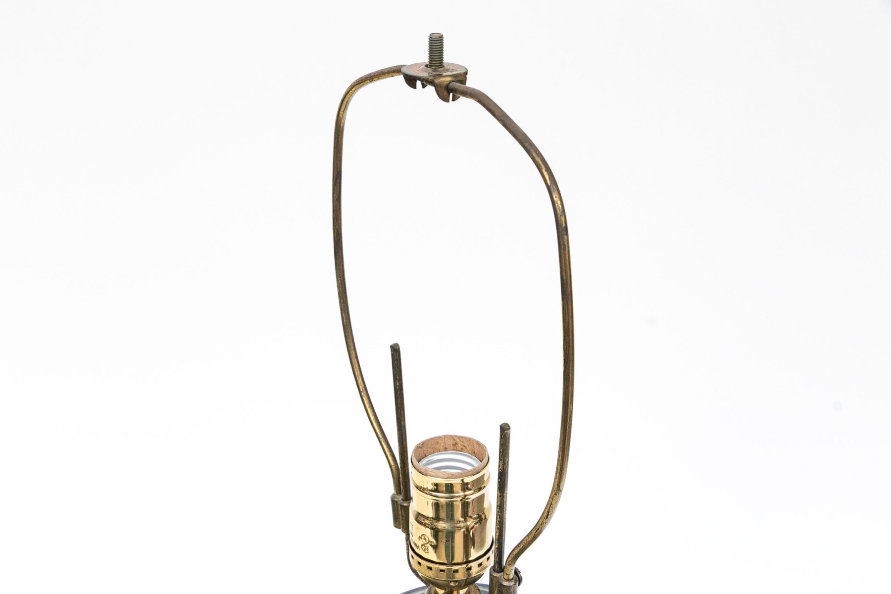 No shade, or finial is present. Harp may be slightly bent, and a new harp with shade would help. Vase is slightly loose in stand. Vase is drilled underfoot when mounted as a table lamp.