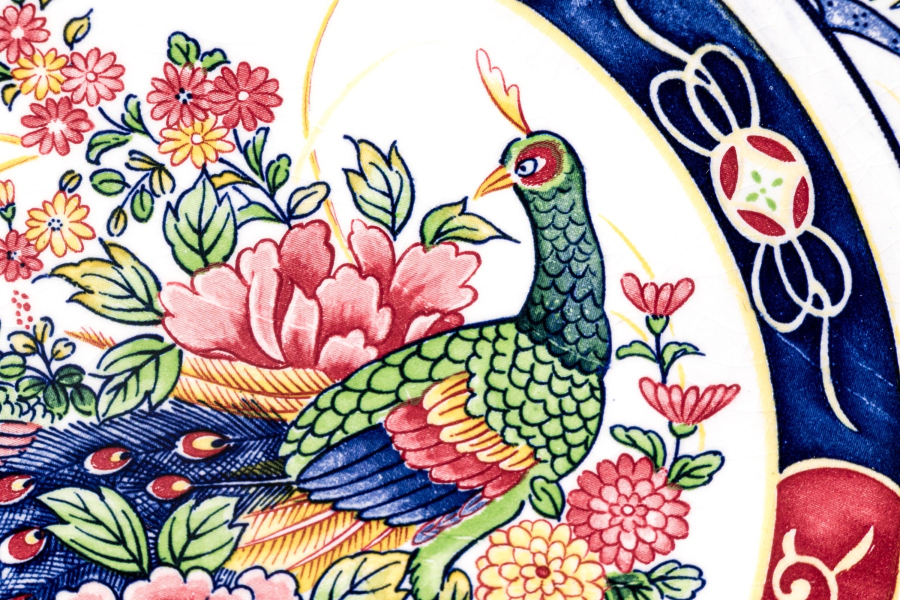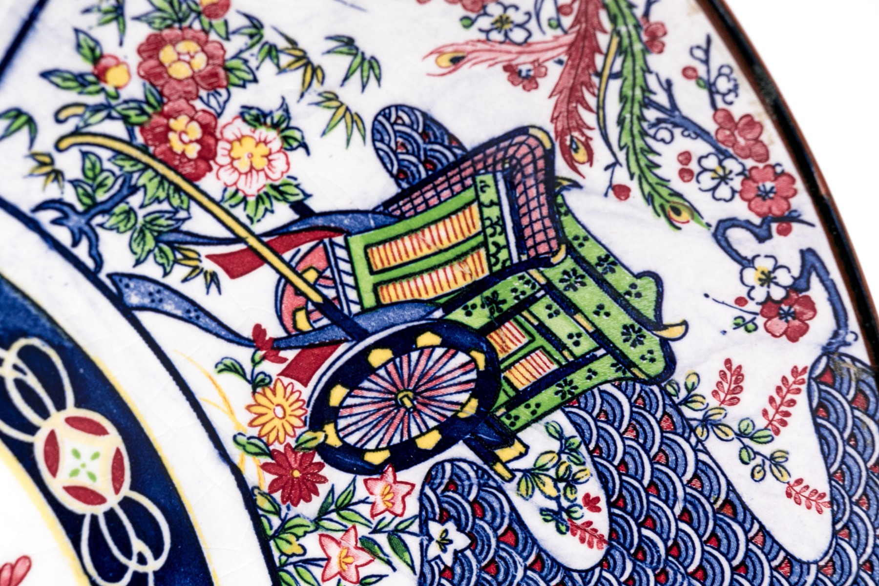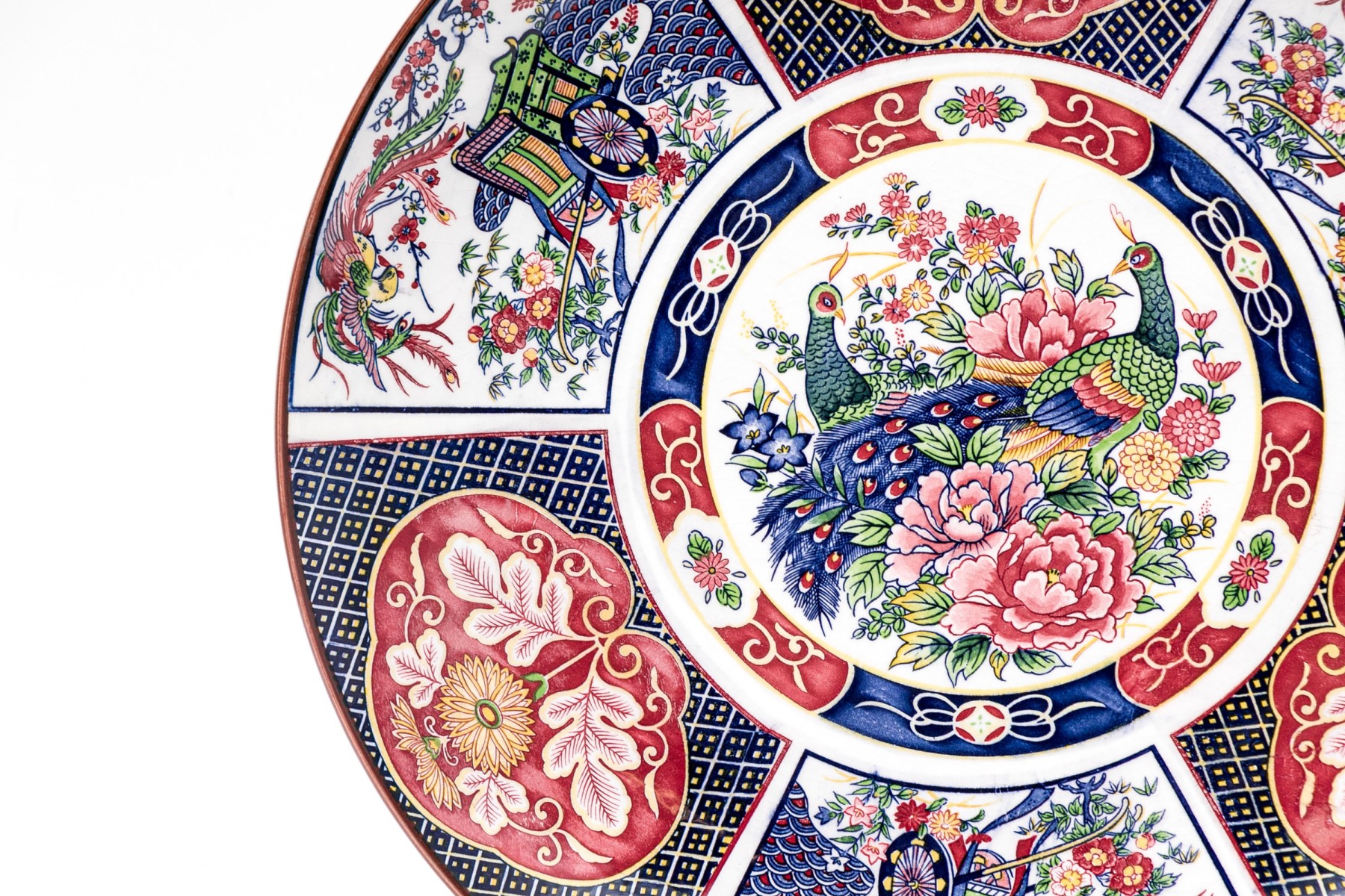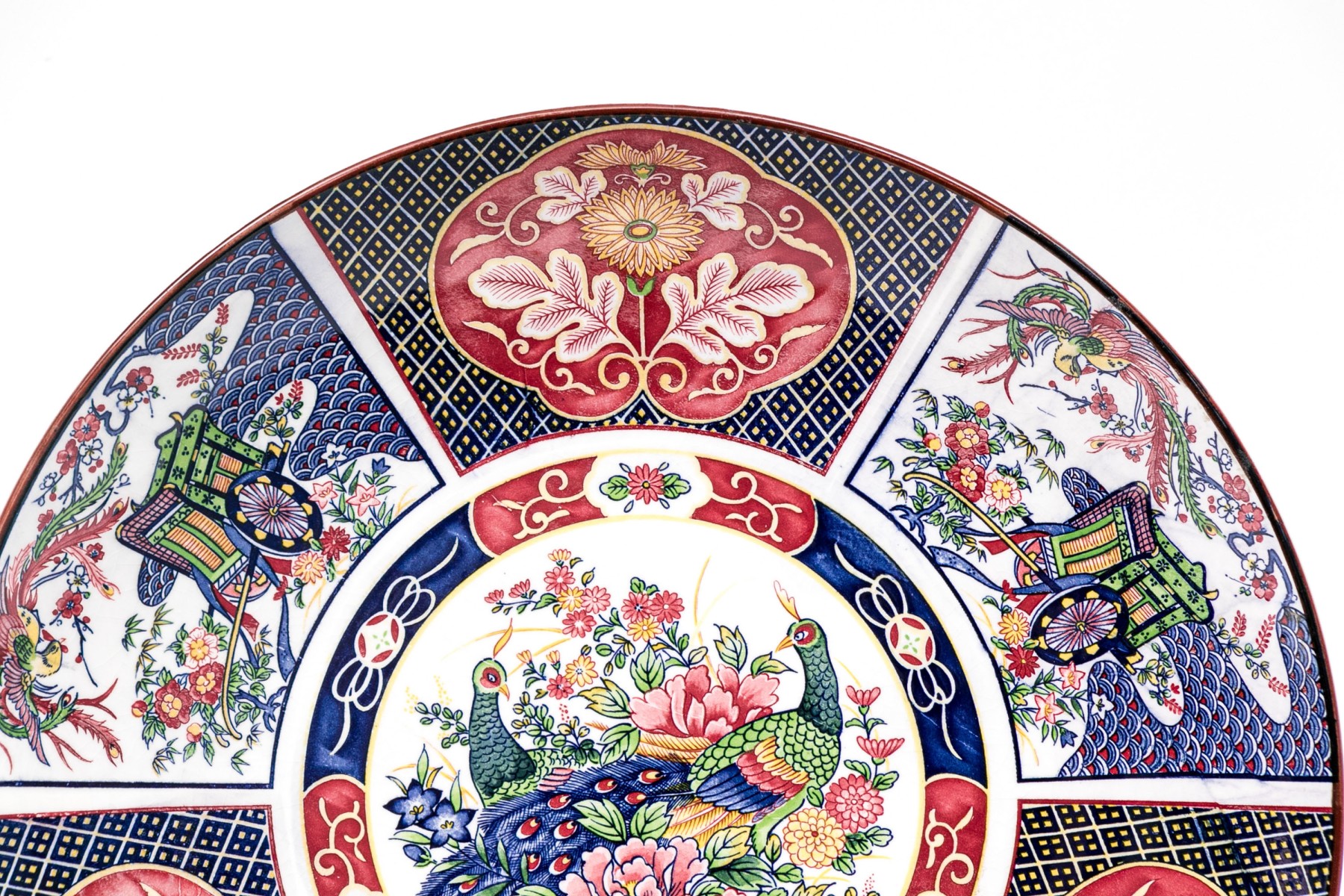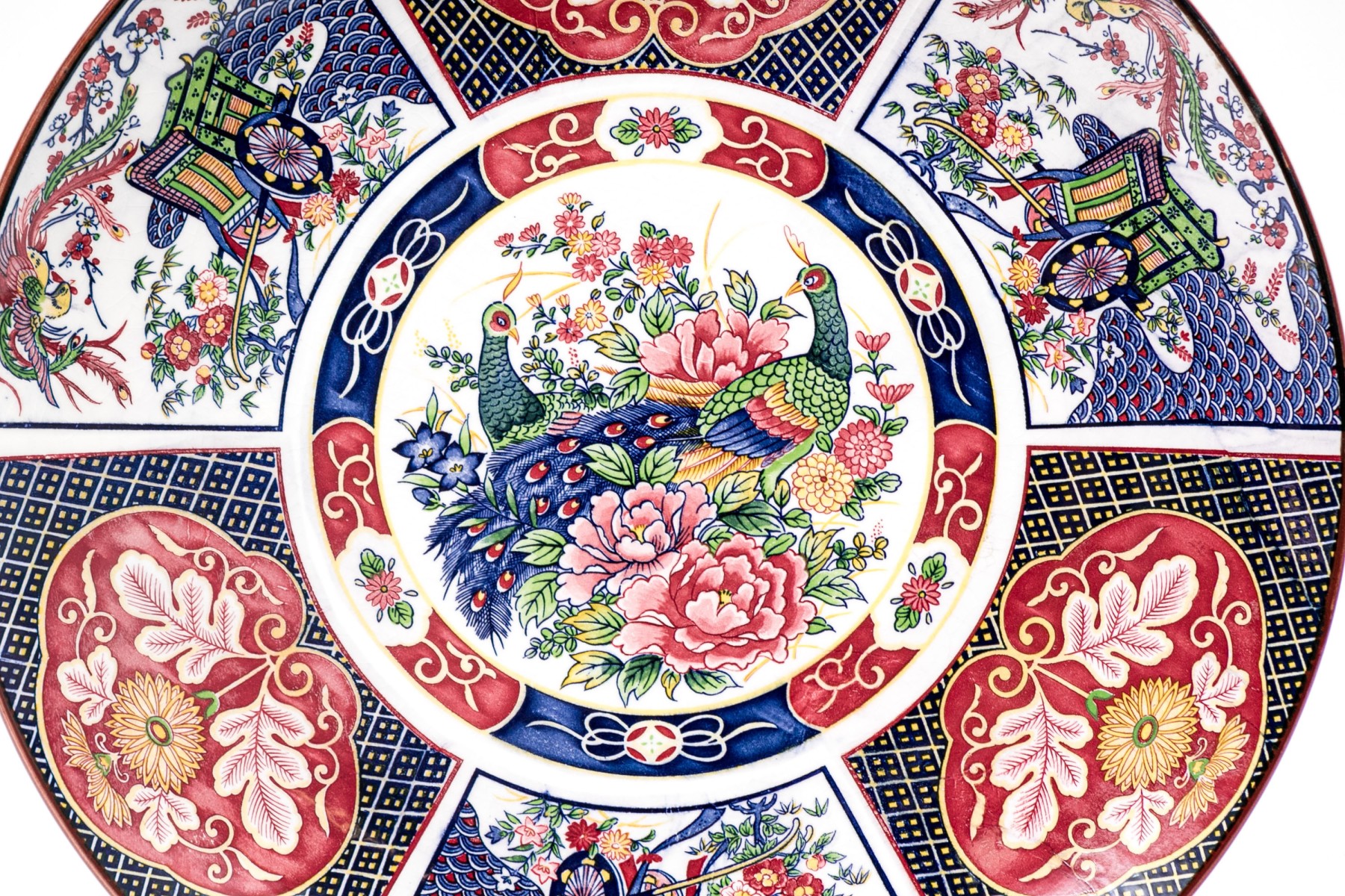 Transfer decorated with a medallion with a pair of peacocks and flowers. And panels with a phoenix bird and a carriage alternating with pink floral shaped panels. With white crackle glazed back and a ring base.