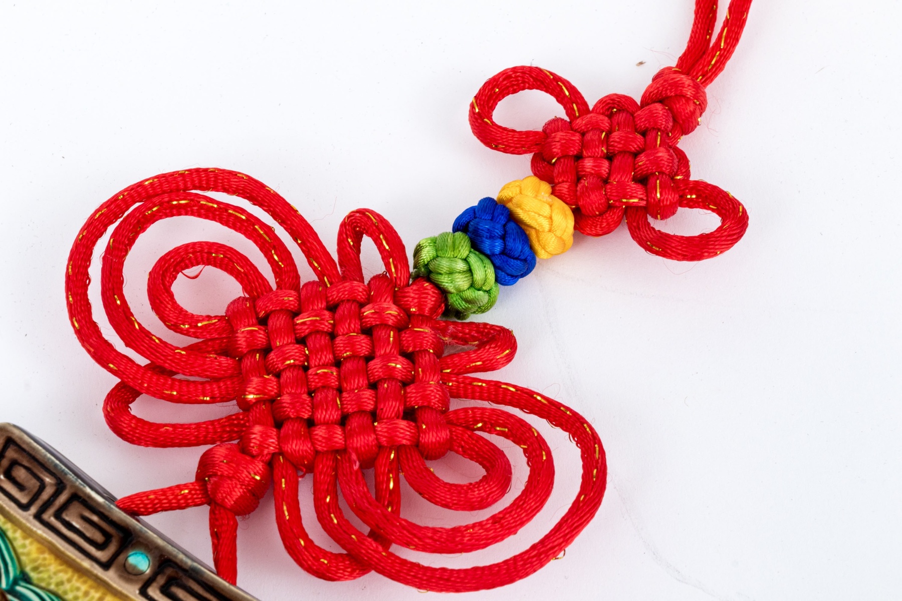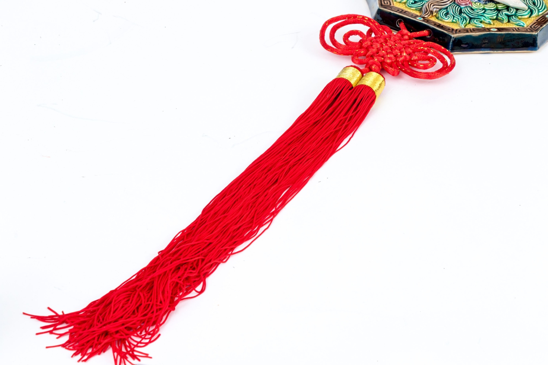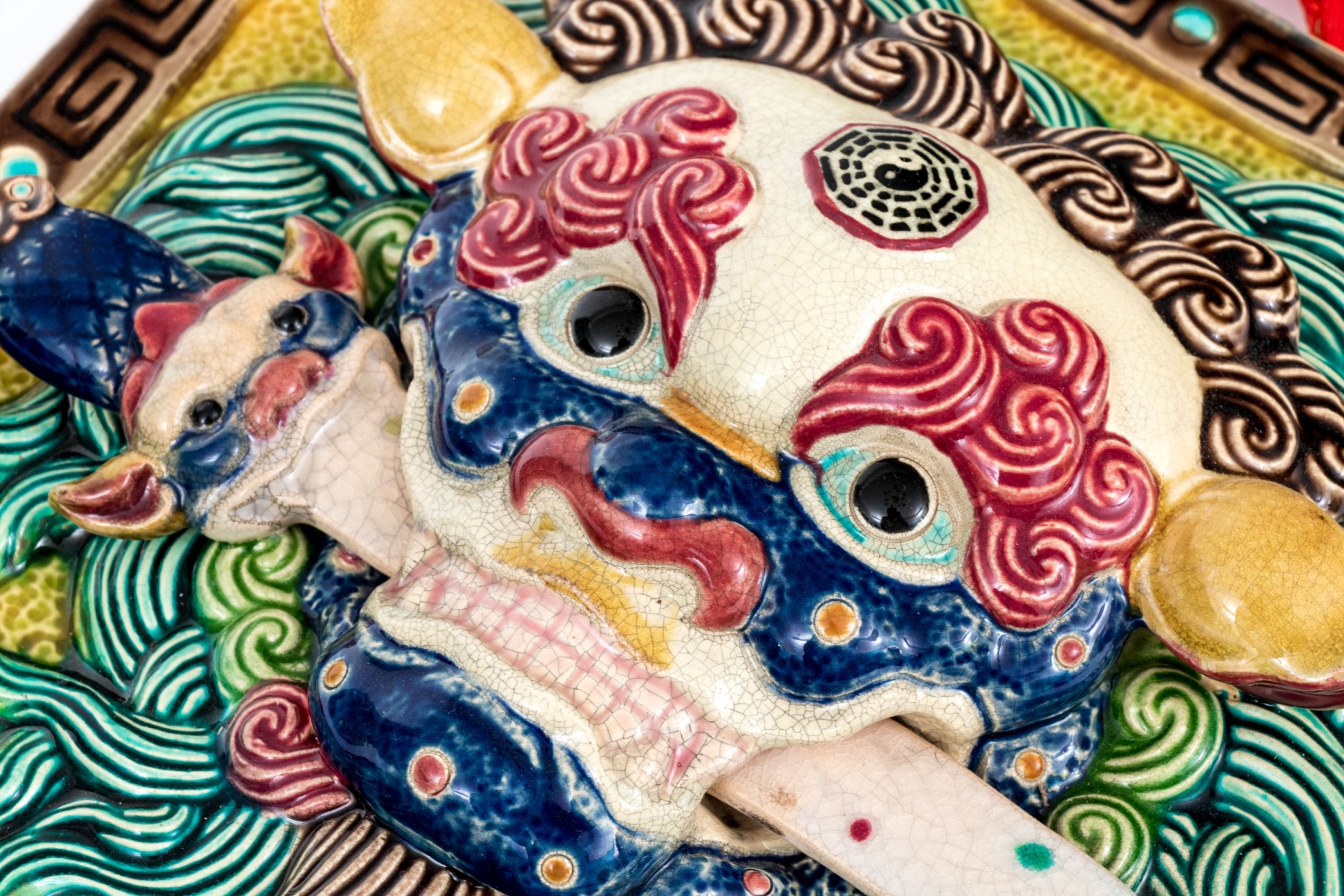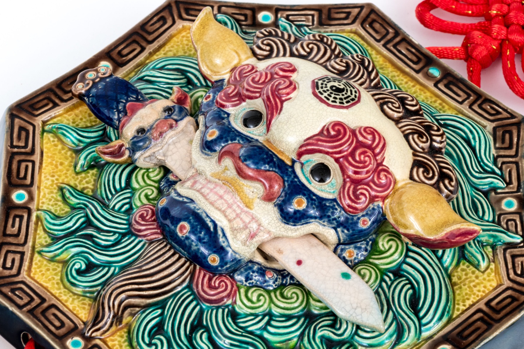 Octagonal tile with foo dog or shi shi head with dagger in its mouth in relief. With Red endless knot to hang and as finial with tassels. Marked on reverse.