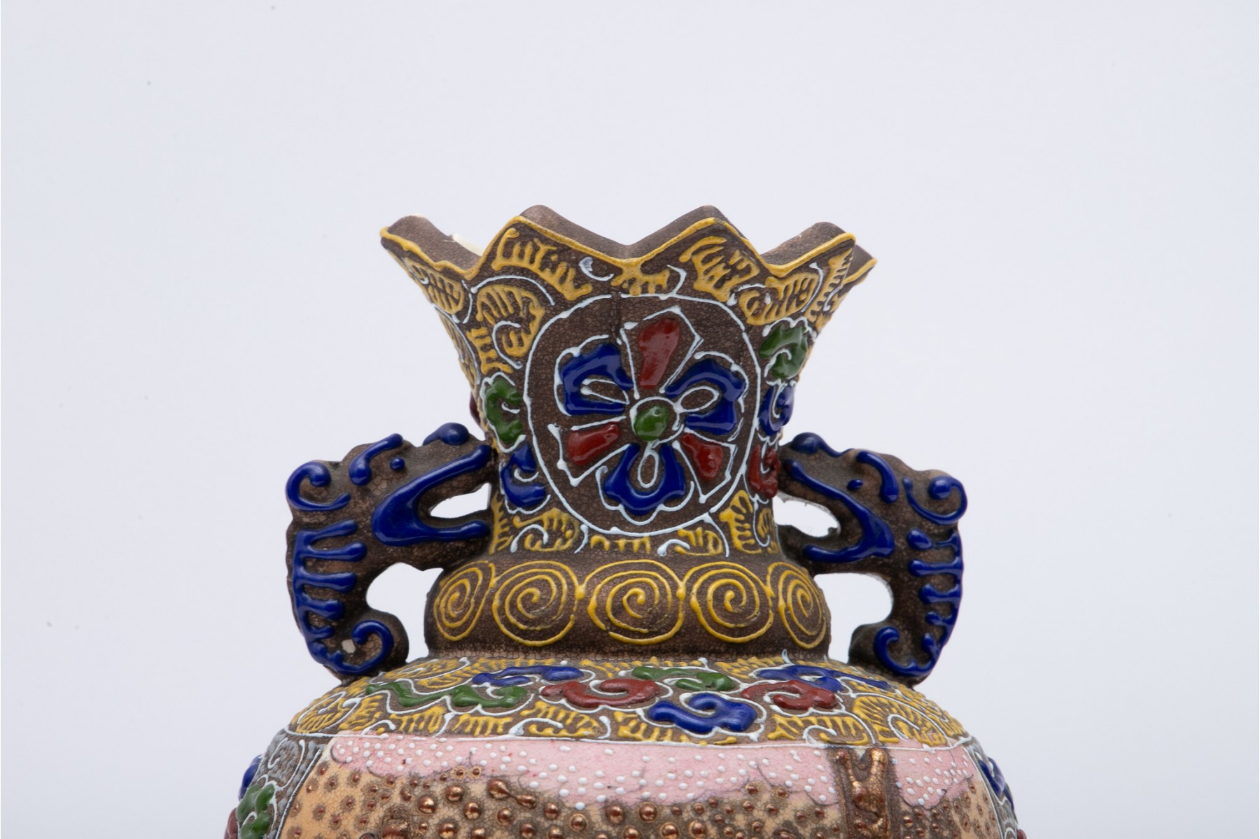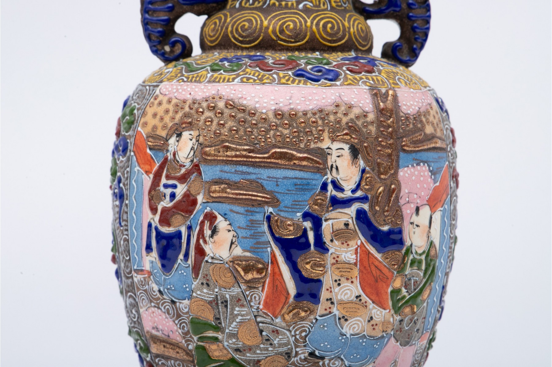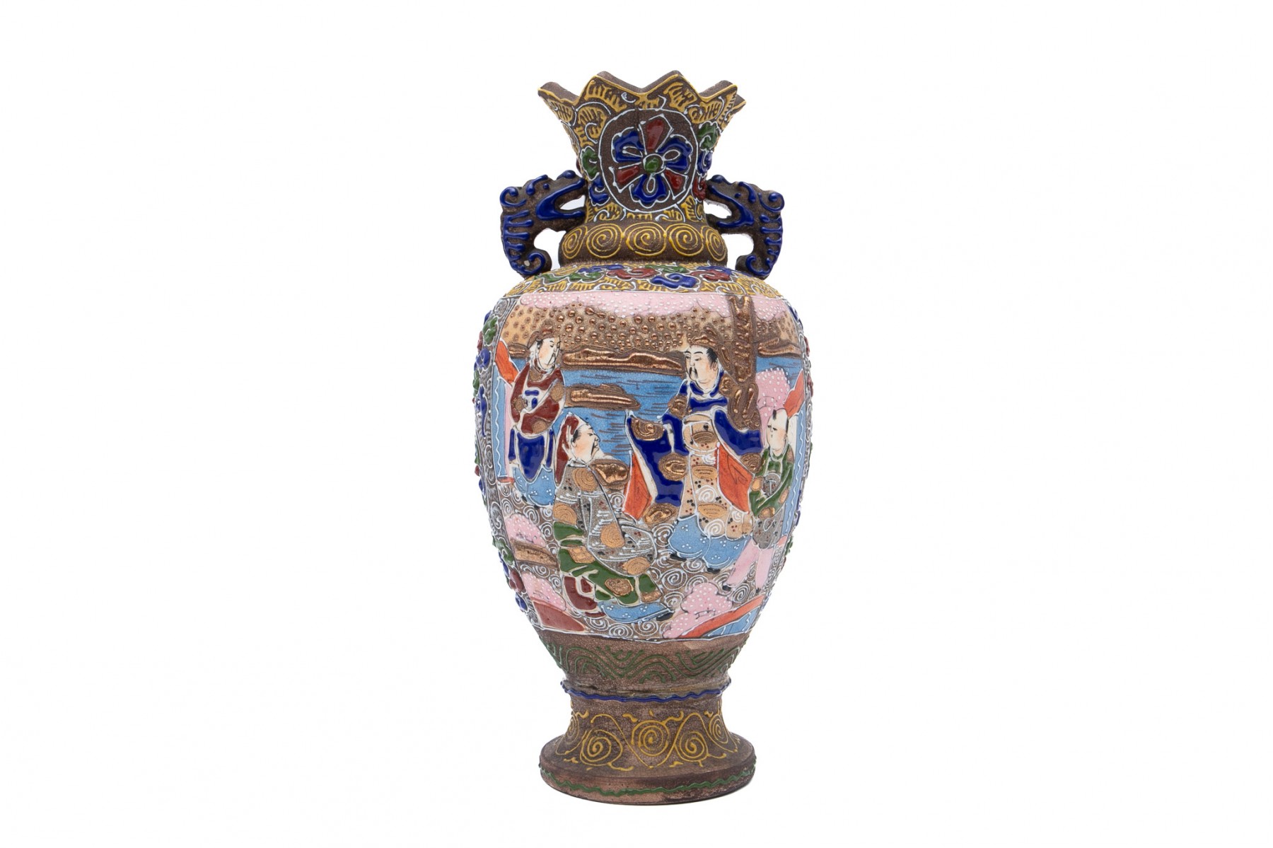 A beautiful Japanese moriage vase with intricate hand-detailed designs. Features a triangular-scalloped rim flanked by dragon head handles over an egg-shaped body sporting scenes of figures gathering under cherry blossom trees. The scenes are surrounded by patterned enameling in hues of red, green, blue, and yellow with swirling clouds, striated waves, spirals, and stipples. Potentially marked on the underside.