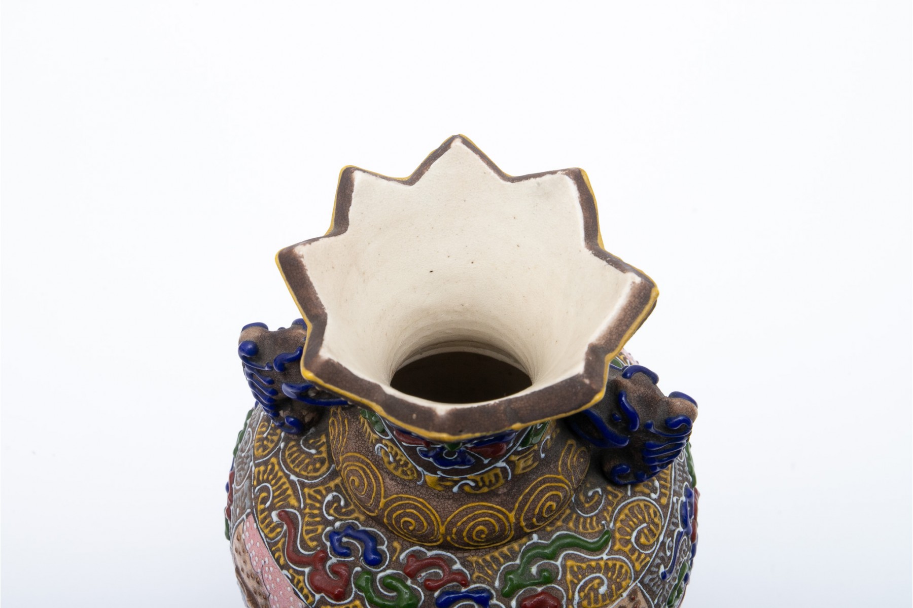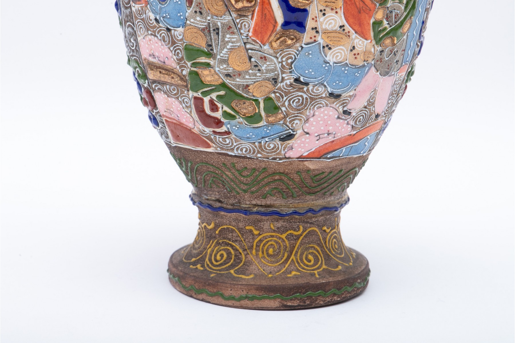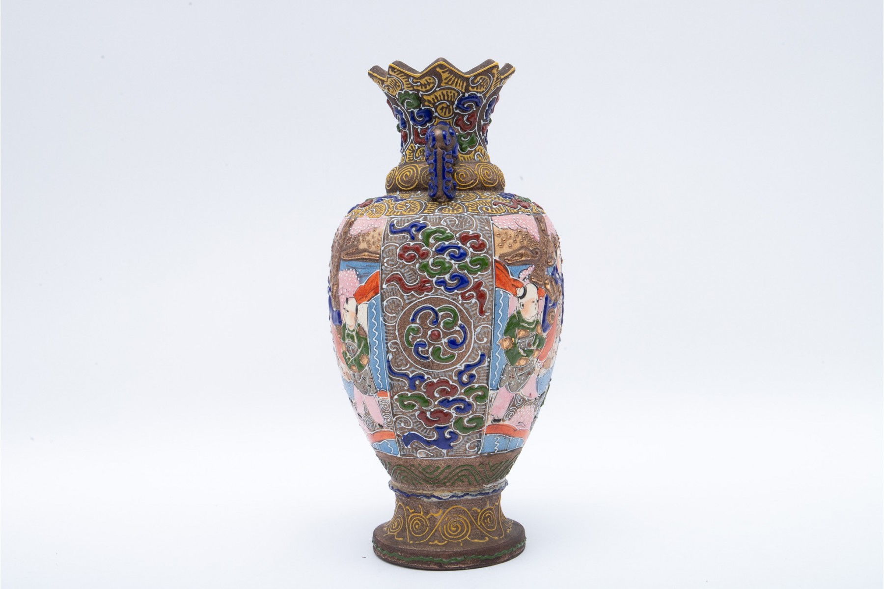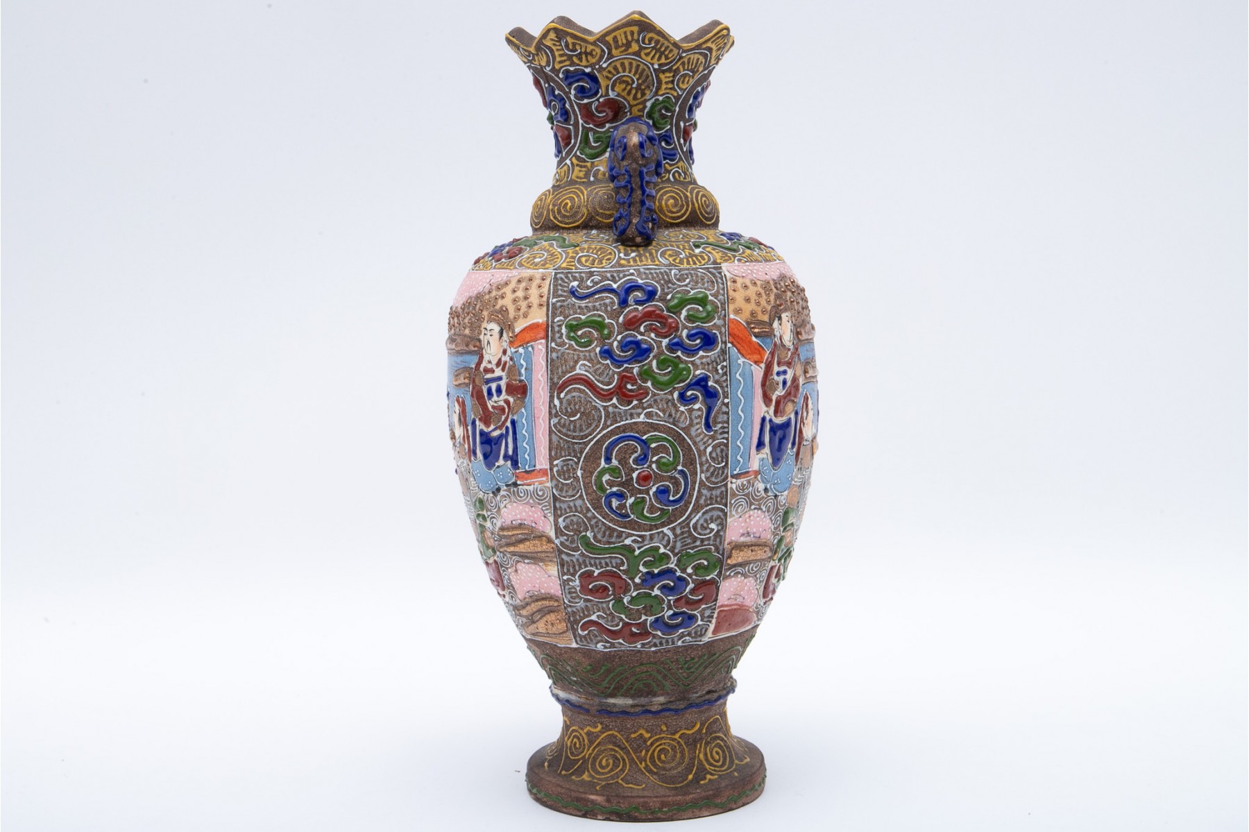 A beautiful Japanese moriage vase with intricate hand-detailed designs. Features a triangular-scalloped rim flanked by dragon head handles over an egg-shaped body sporting scenes of figures gathering under cherry blossom trees. The scenes are surrounded by patterned enameling in hues of red, green, blue, and yellow with swirling clouds, striated waves, spirals, and stipples. Potentially marked on the underside.