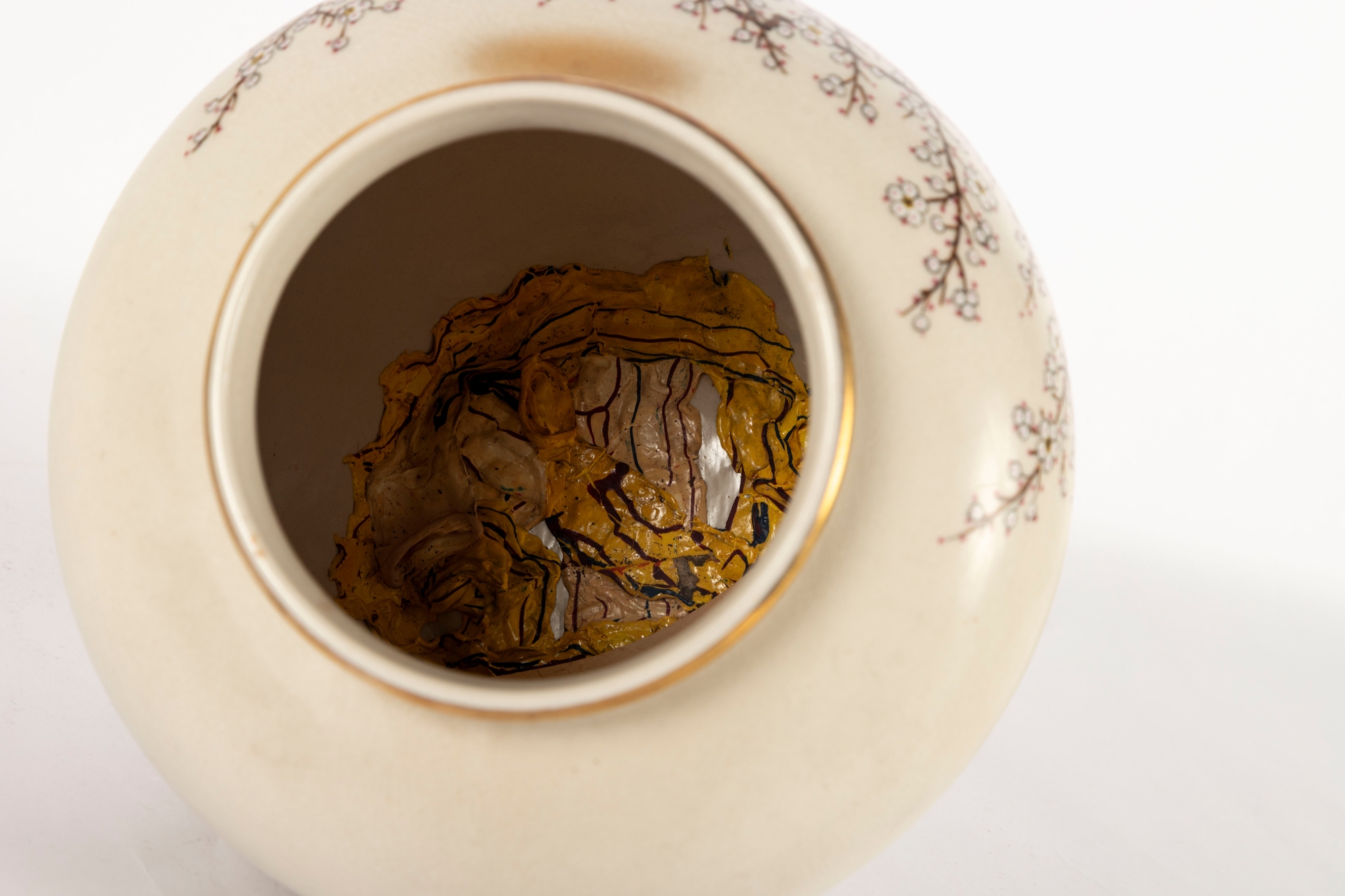 Overall good condition with light surface wear and toning. Notable area of discoloration to one side, as shown. No visible chips or cracks. Interior has dried paint residue.