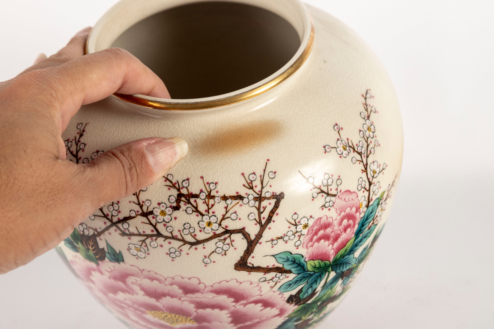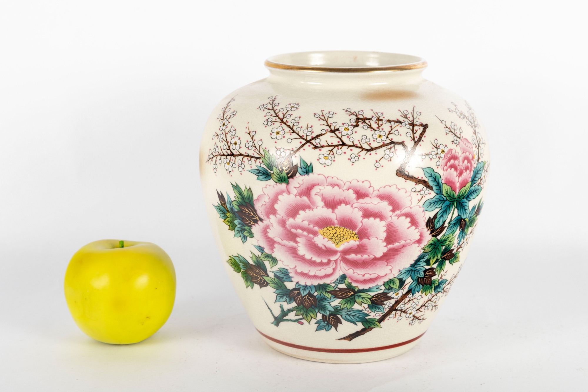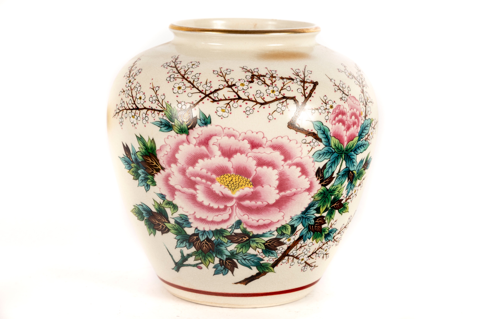 Charming Japanese hand-painted ceramic vase featuring a large central pink peony blossom surrounded by green foliage and delicate white flowering branches. The cream crackle-glazed body is accented with a fine gilt rim and a subtle red band along the base.