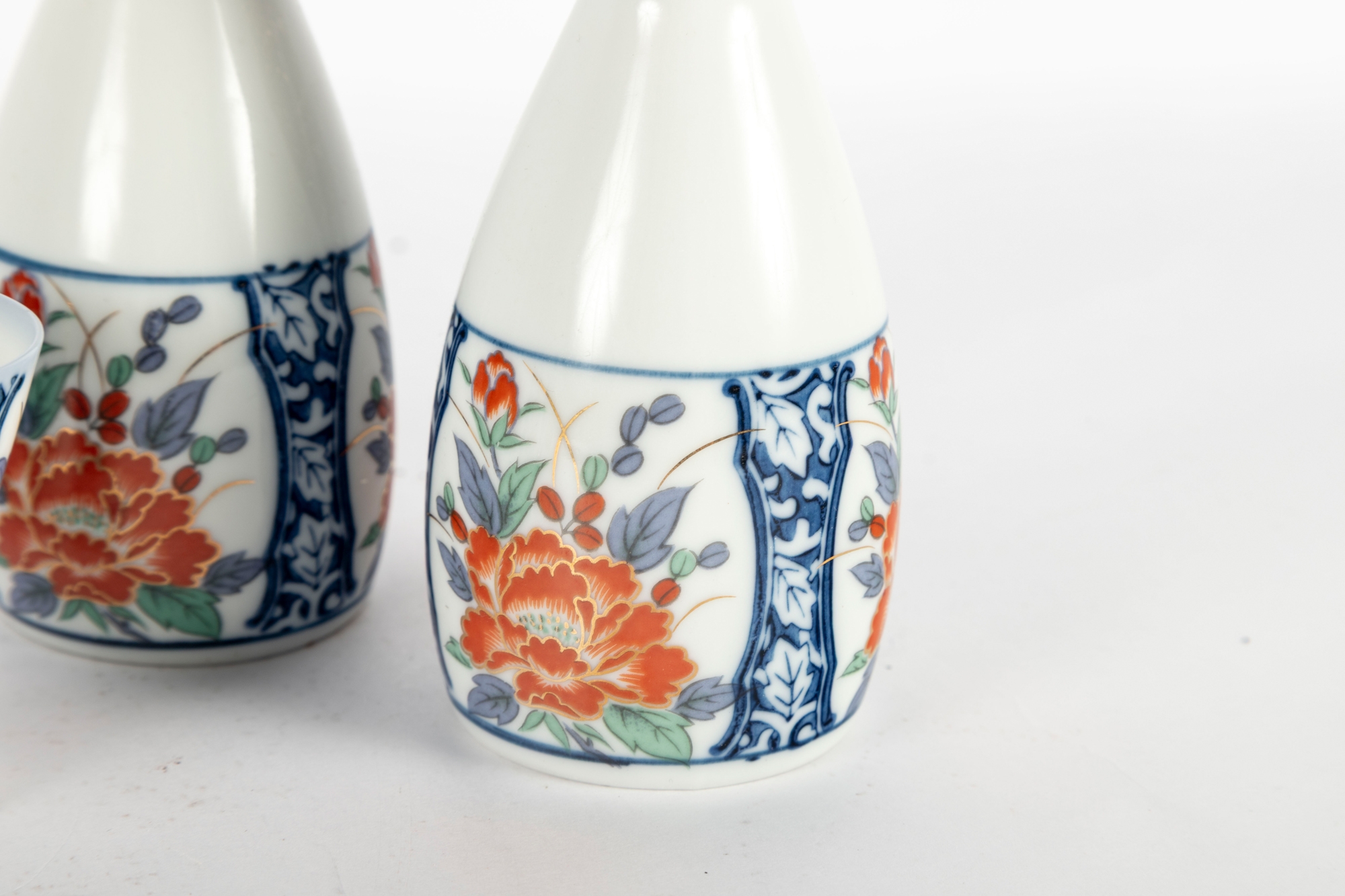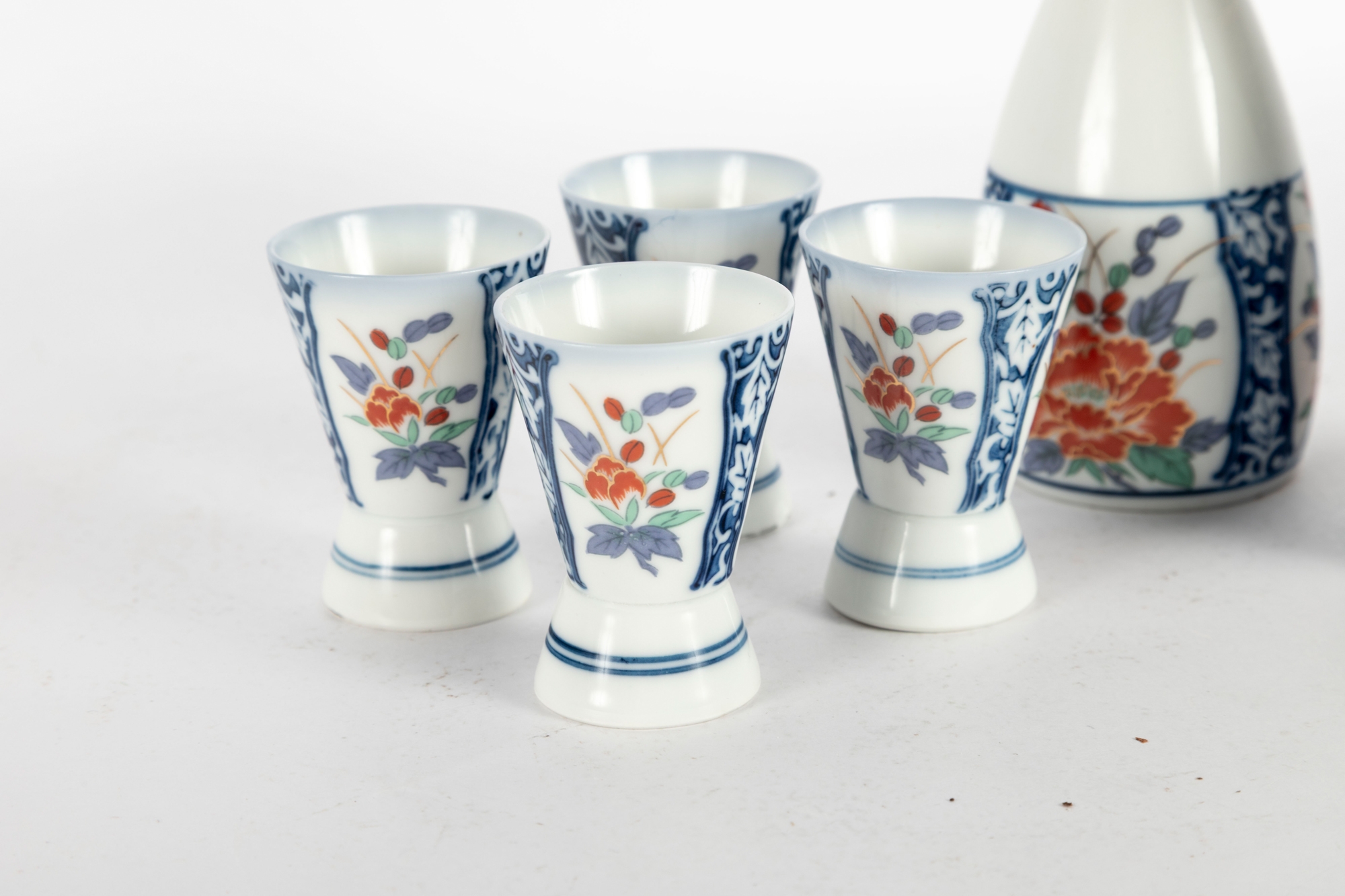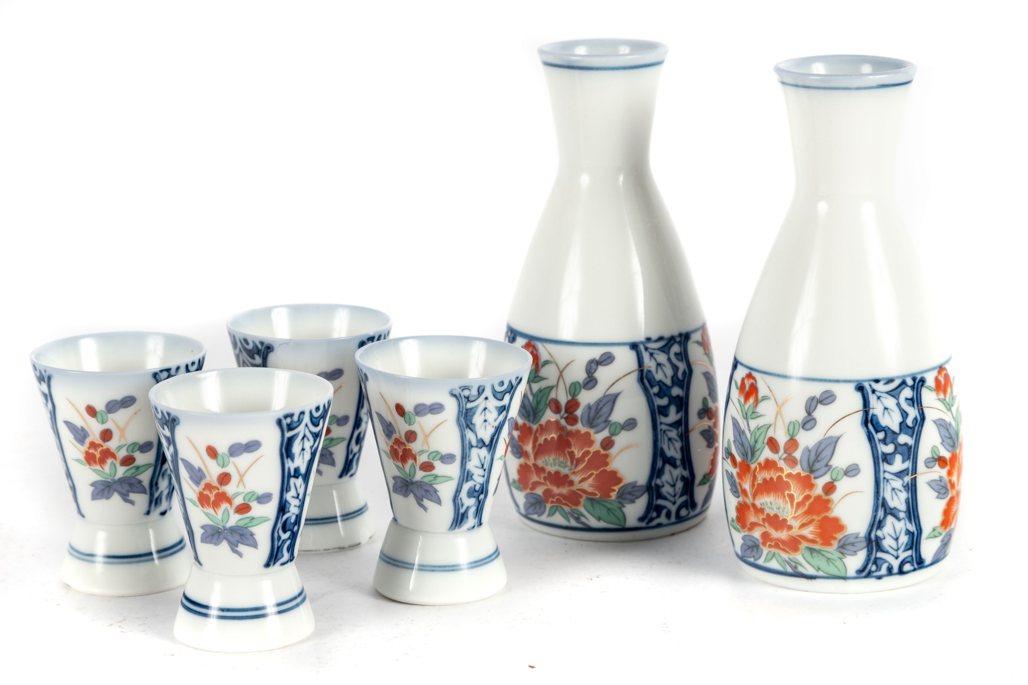 Charming Japanese Imari-style porcelain sake set including two carafes and six matching cups. Each piece is decorated with hand-painted floral motifs in iron red, cobalt blue, green, and gold tones, featuring stylized peonies framed by blue scrollwork borders. The design is both traditional and vibrant, showcasing fine craftsmanship and symmetry. Blue character marks appear on the undersides.