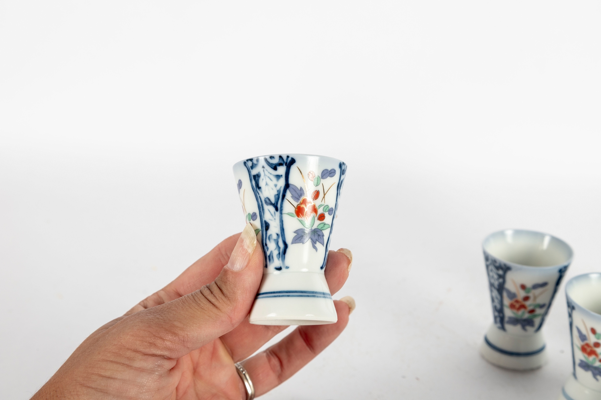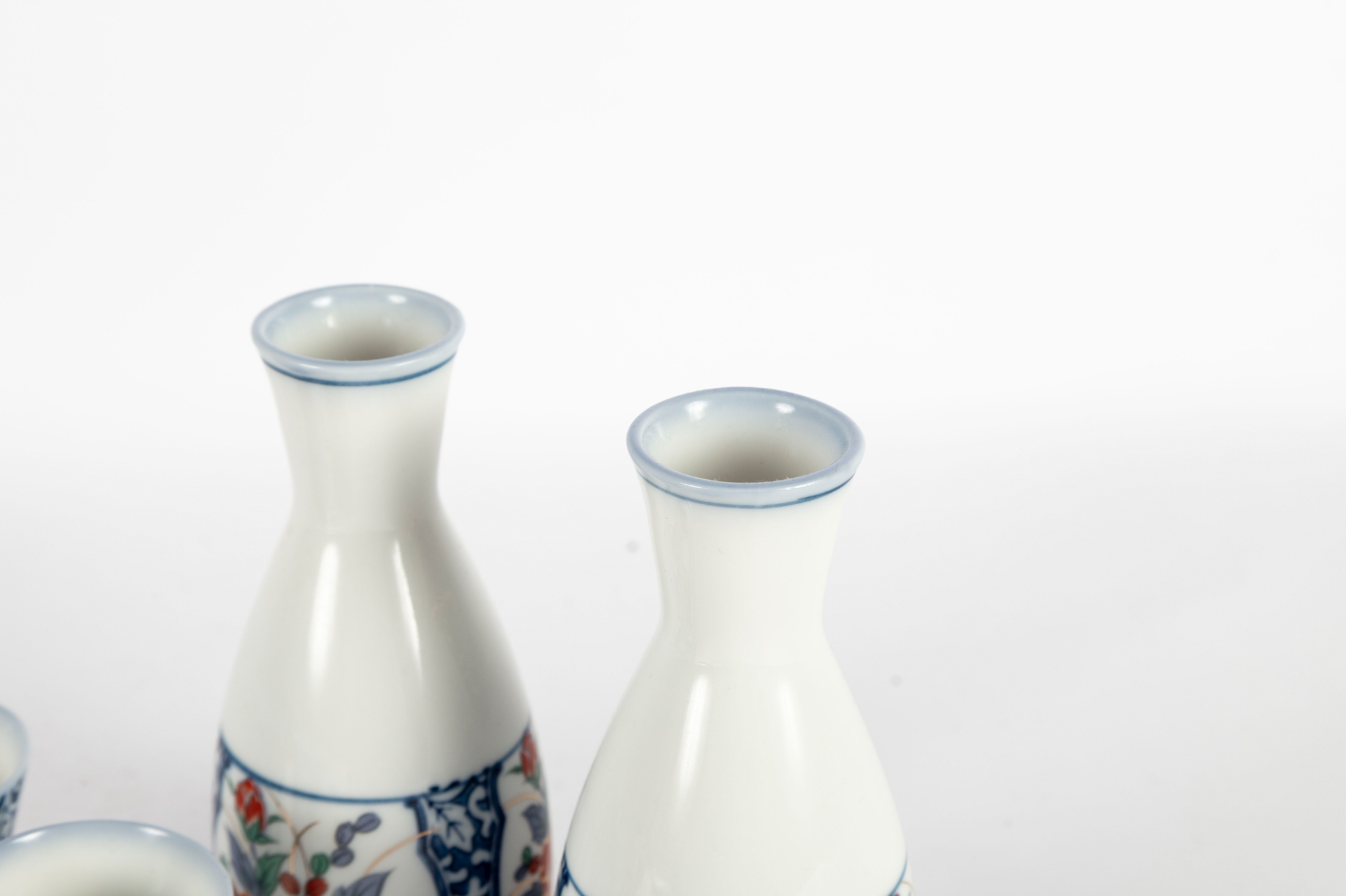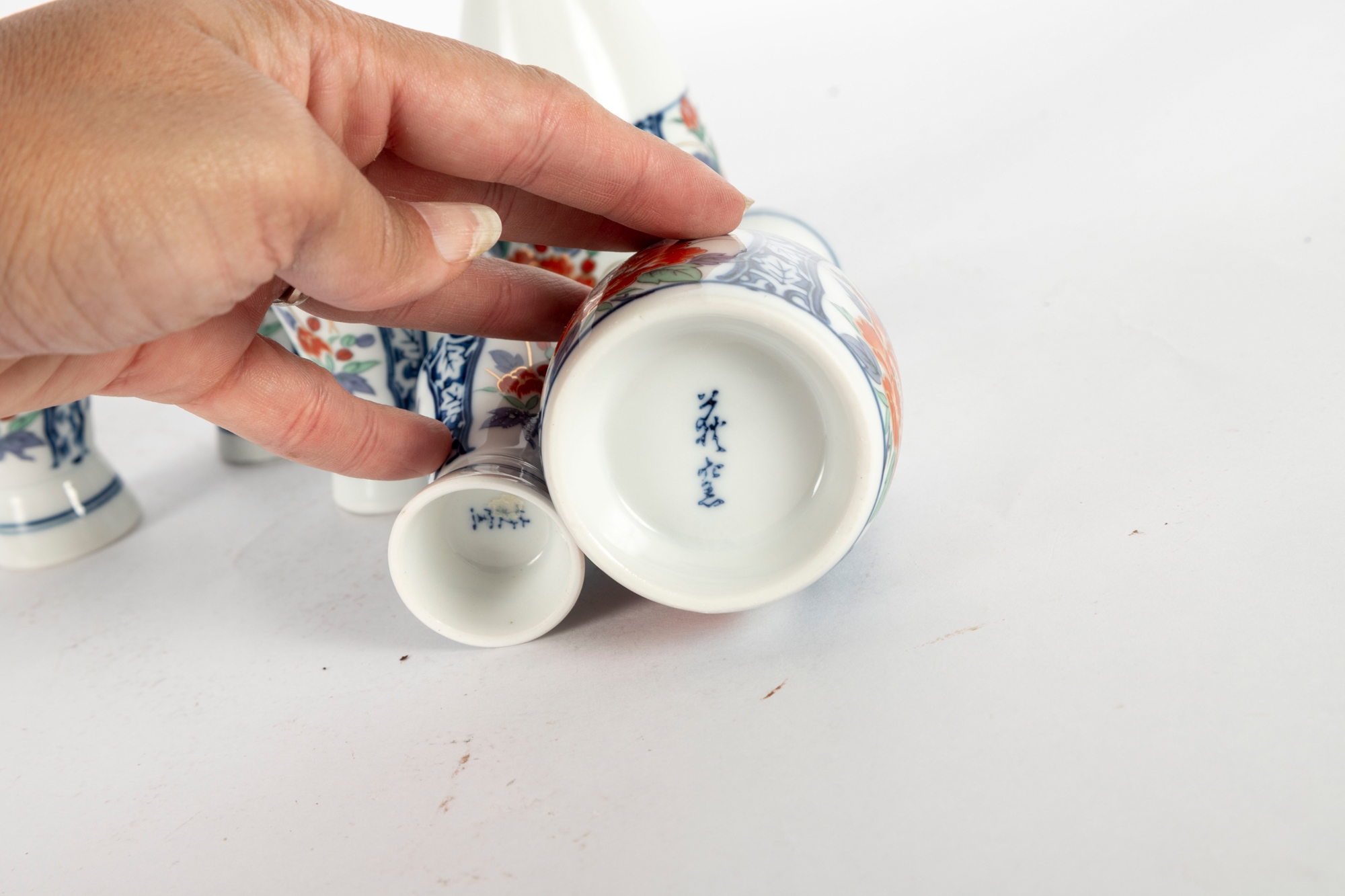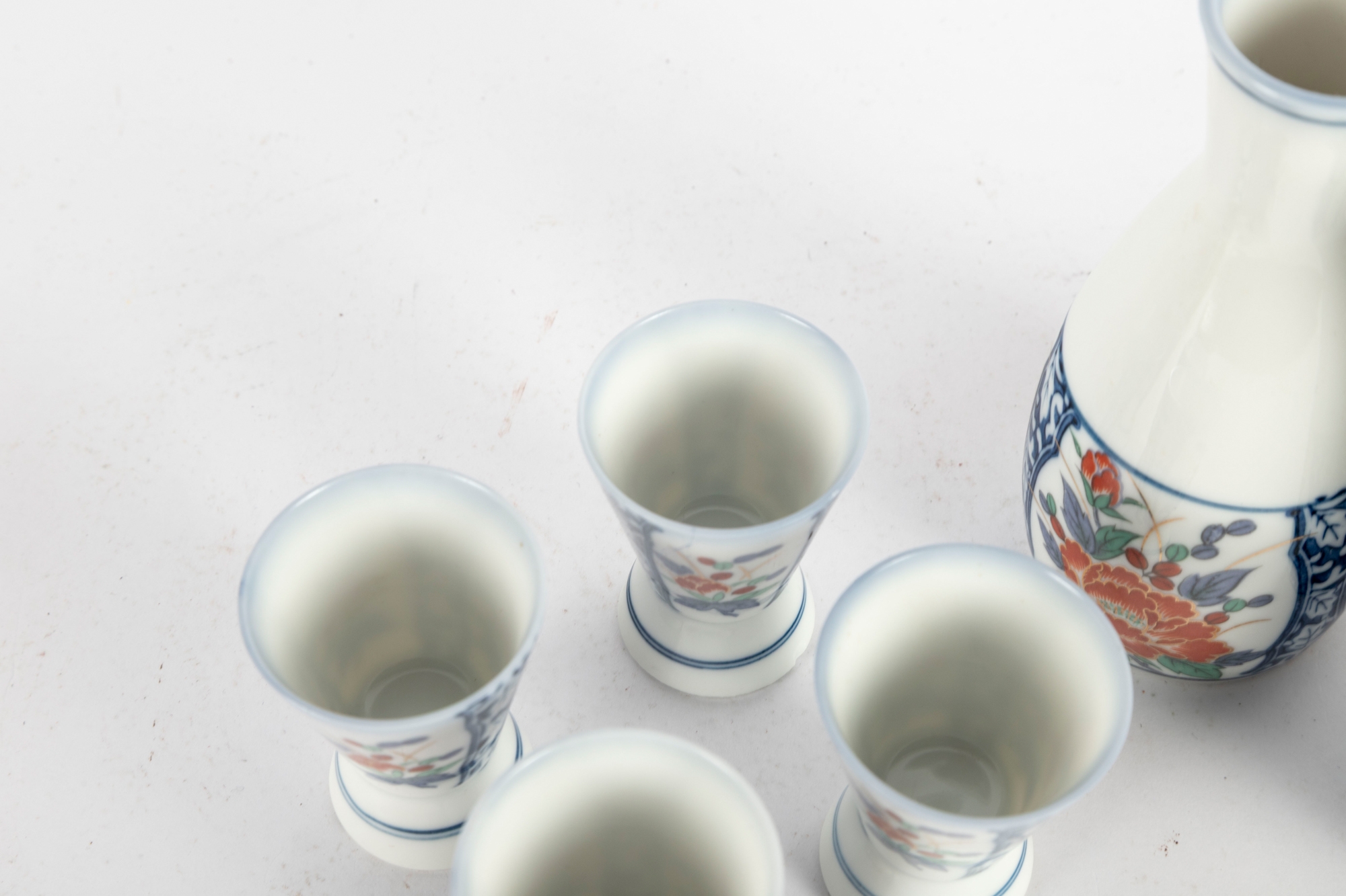 Charming Japanese Imari-style porcelain sake set including two carafes and six matching cups. Each piece is decorated with hand-painted floral motifs in iron red, cobalt blue, green, and gold tones, featuring stylized peonies framed by blue scrollwork borders. The design is both traditional and vibrant, showcasing fine craftsmanship and symmetry. Blue character marks appear on the undersides.