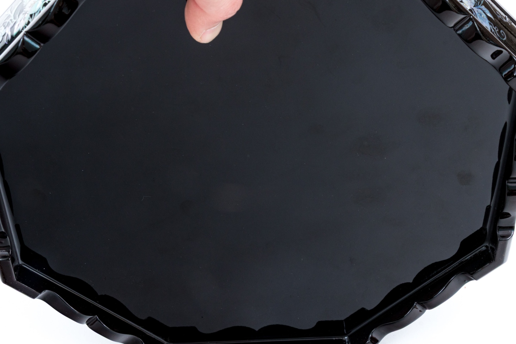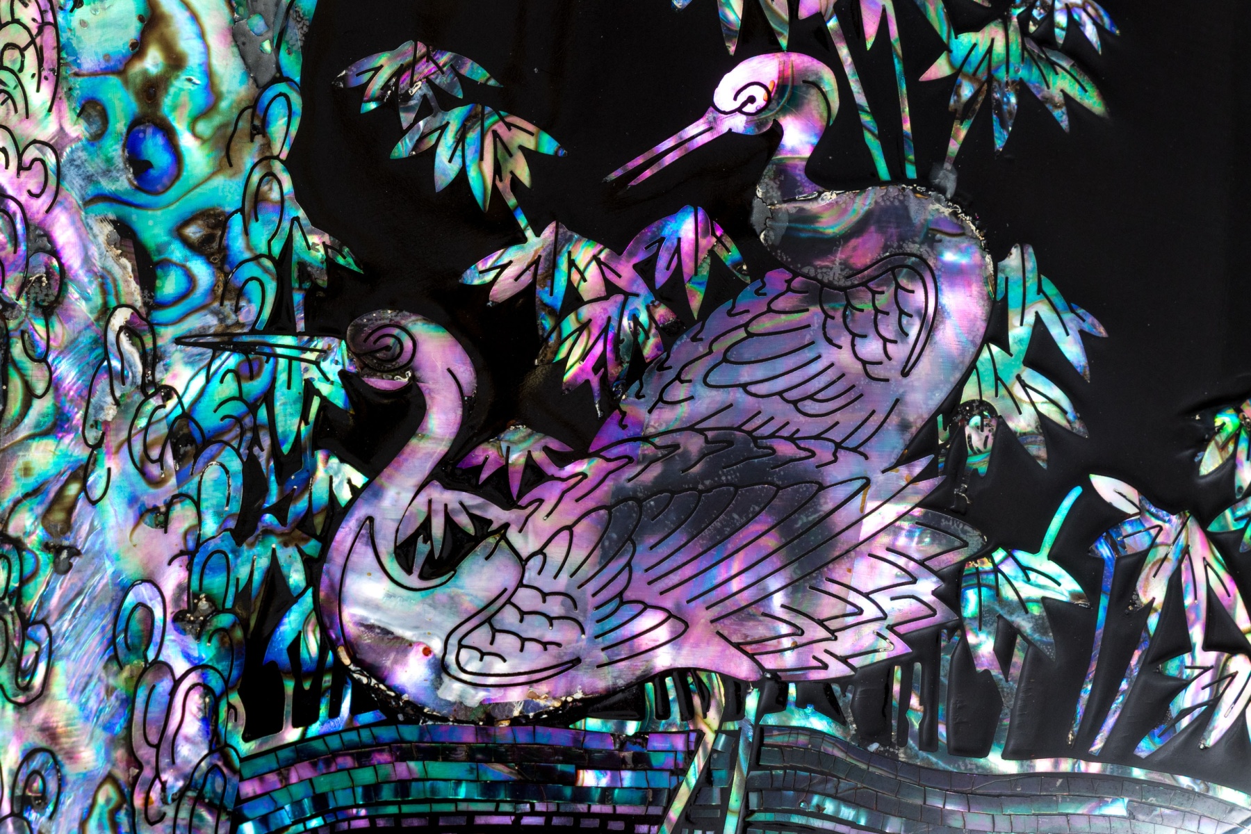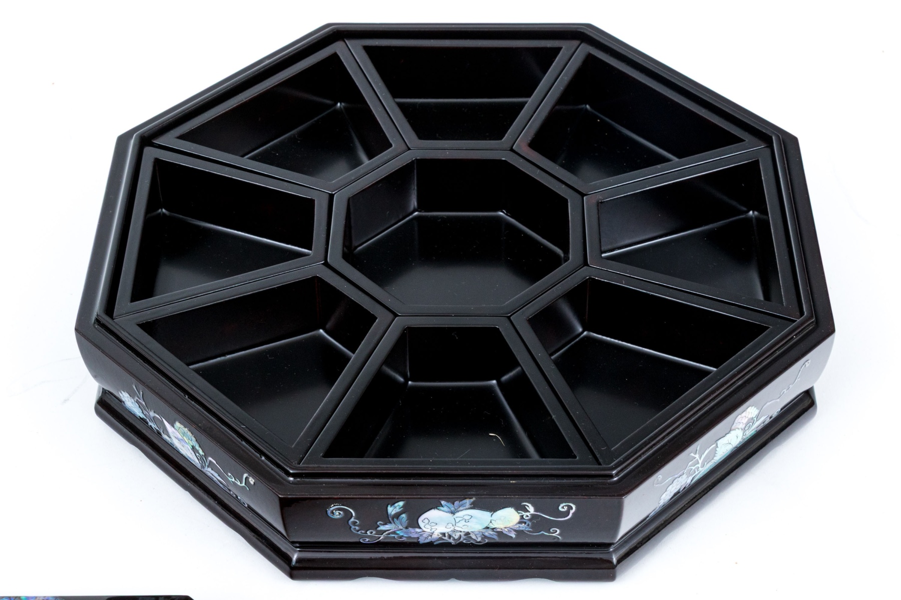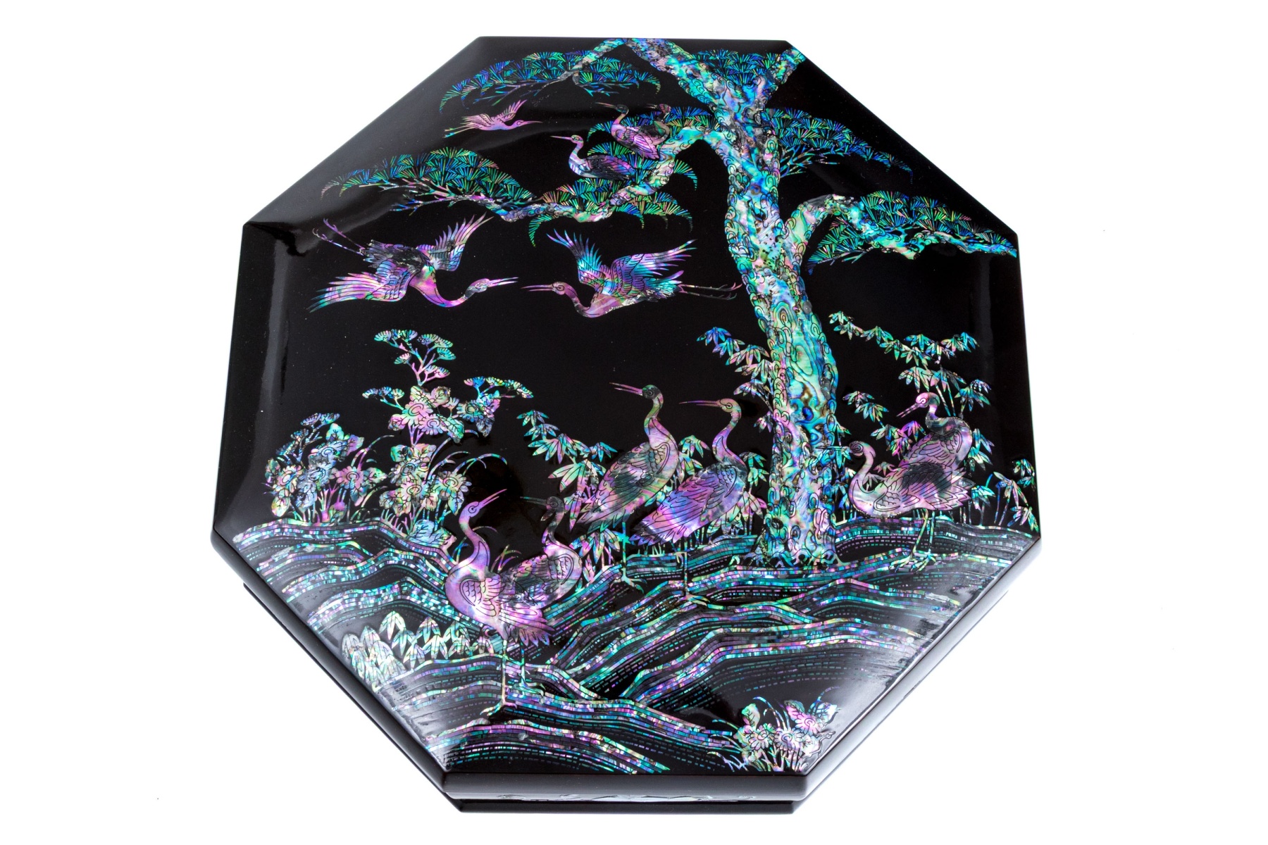 Octagonal form with interior removable shaped bowls with an octagonal fitted lid with highly decorative shell and mother of pearl inlaid landscape motif with crane. Raised on a shaped foot ring.