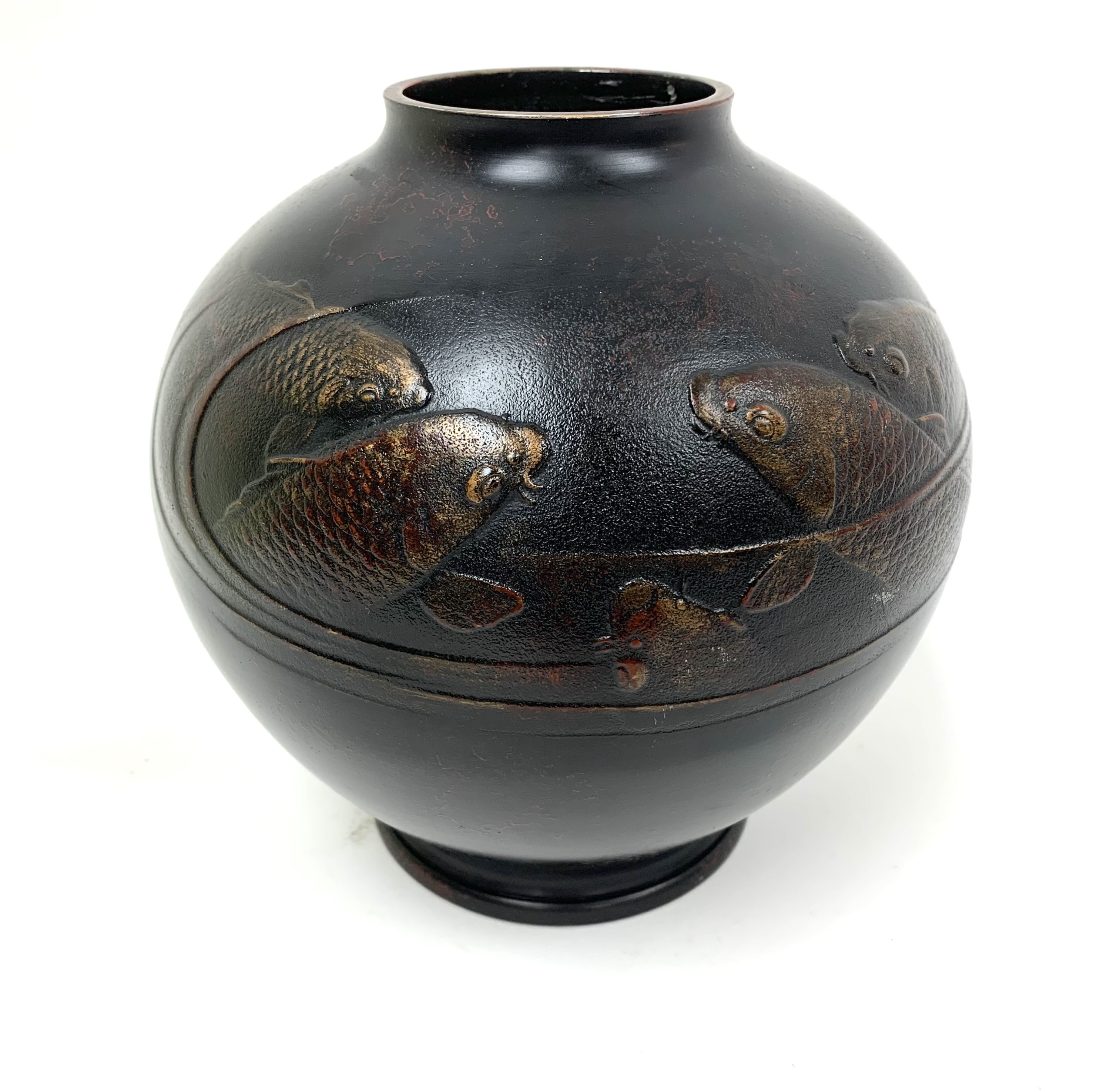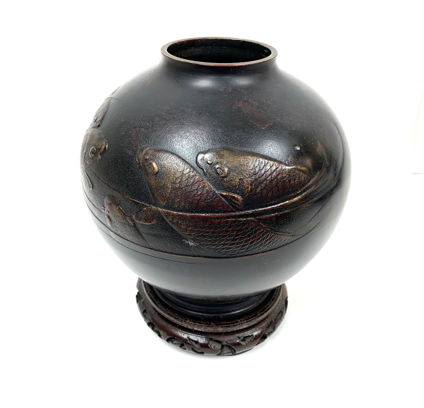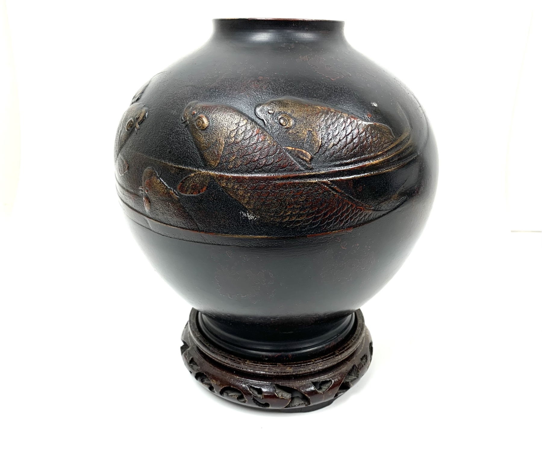 A cast metal Vase in traditional Japanese form having five gathered Koi in raised design. The Vase is finished in a fine mottled Bronze finish and comes with an older conforming pierced wood stand, likely Chinese in origin. Unmarked.