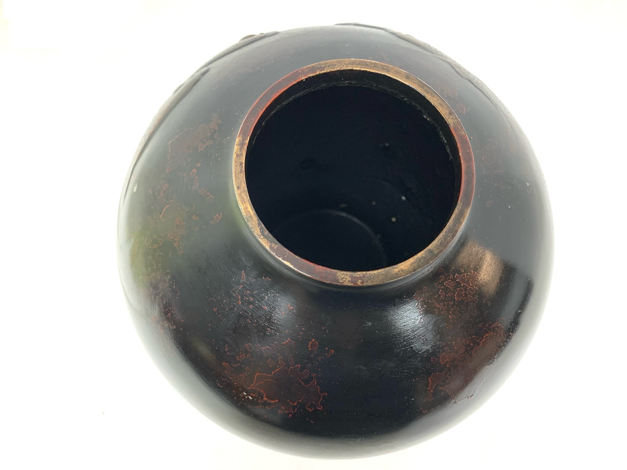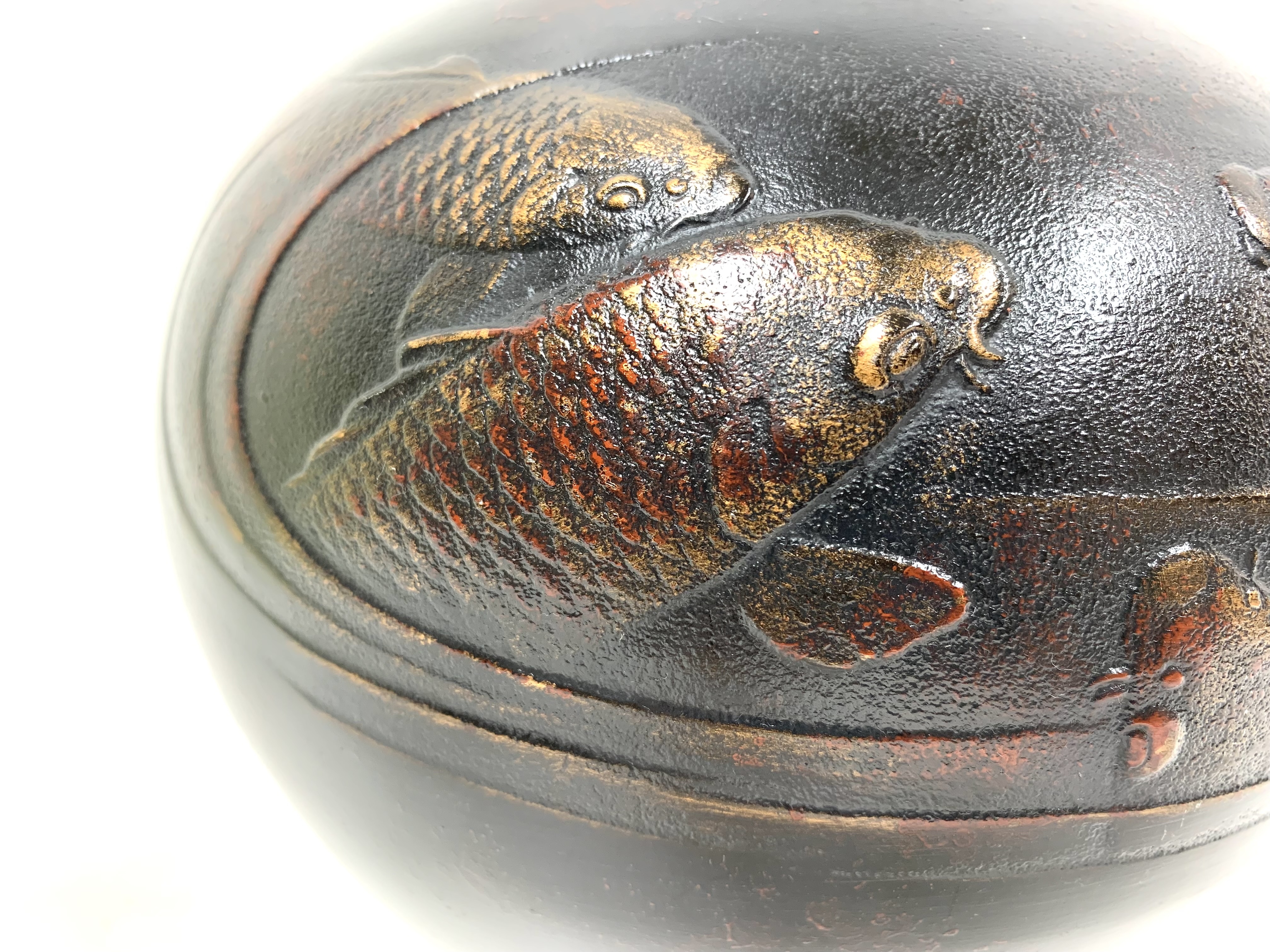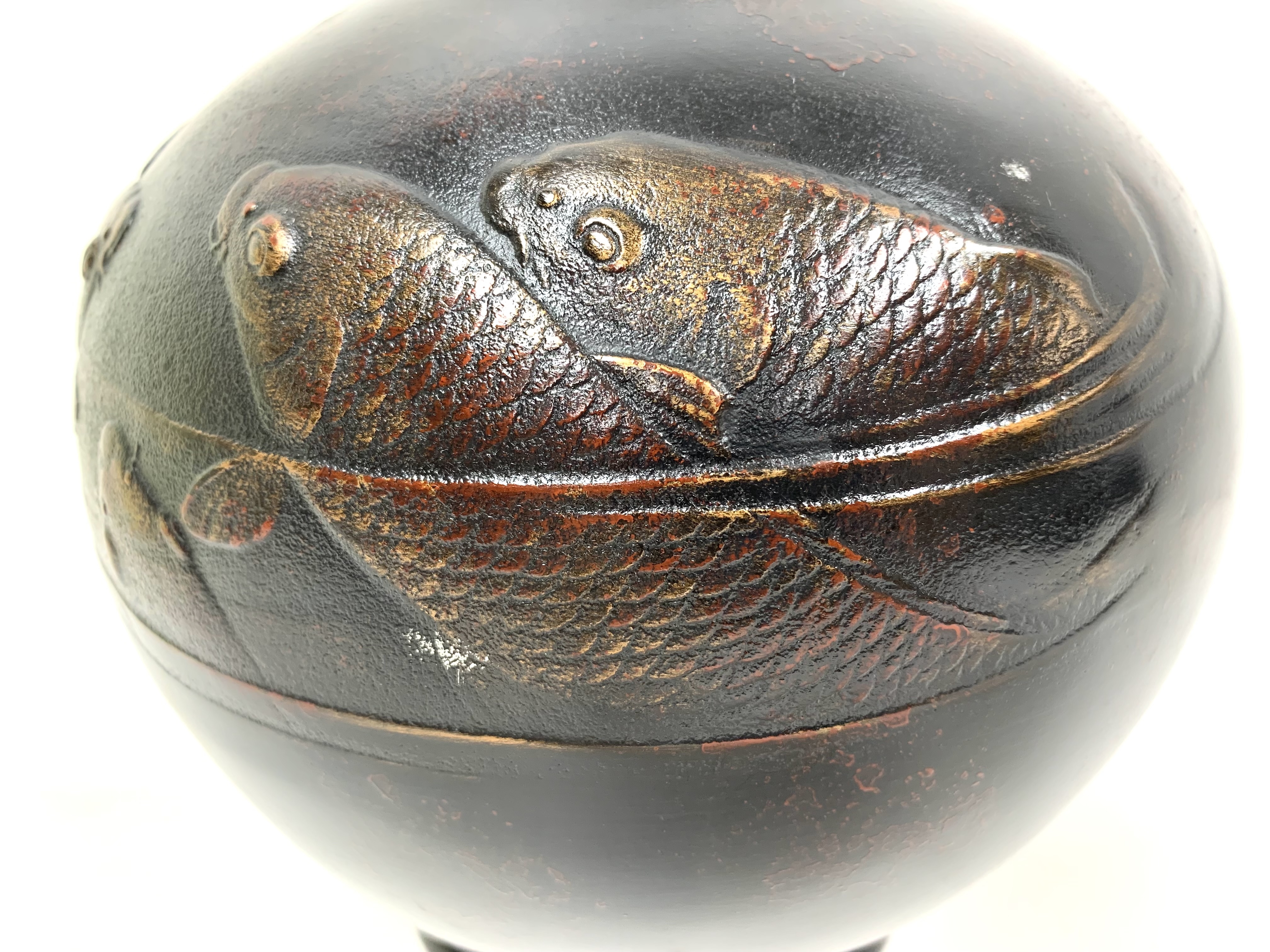 A cast metal Vase in traditional Japanese form having five gathered Koi in raised design. The Vase is finished in a fine mottled Bronze finish and comes with an older conforming pierced wood stand, likely Chinese in origin. Unmarked.