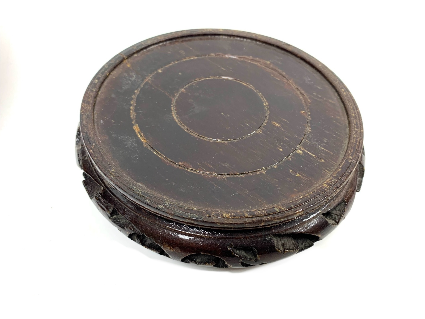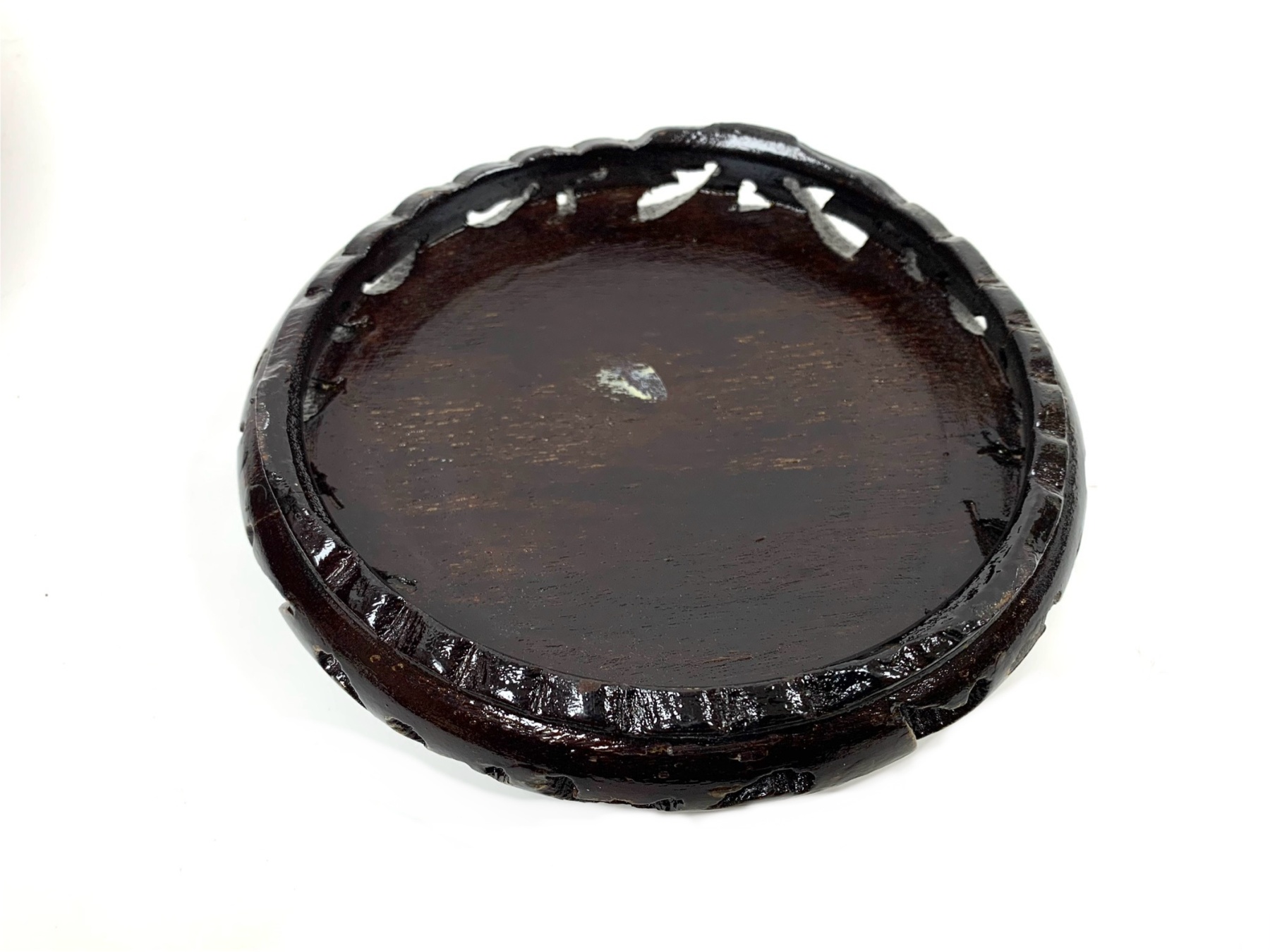 Condition: Please see detail photos. Various acceptable signs of age and use include wear to the base and top edge, a few nicks to the body as well as losses and chips to the wood stand mentioned for accuracy as the presentation is serene and fine.