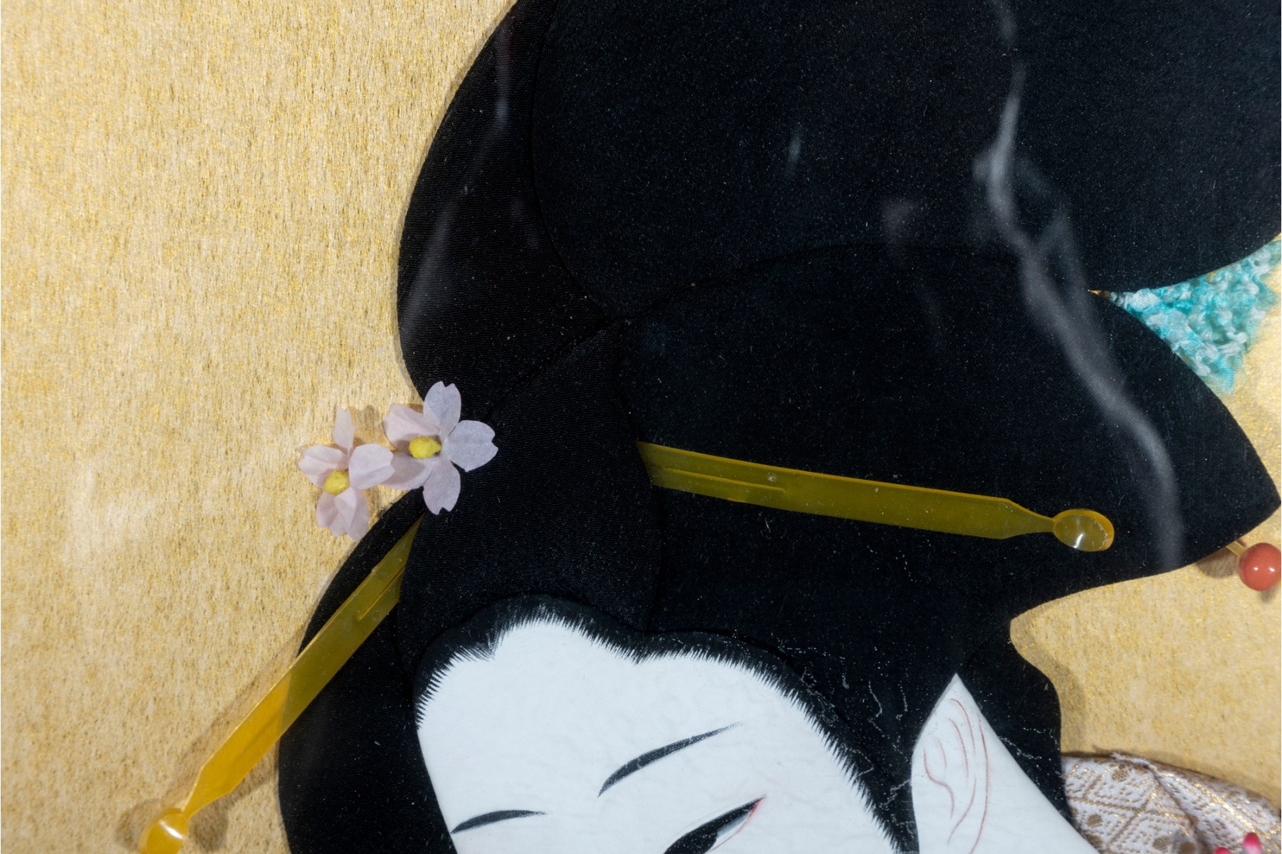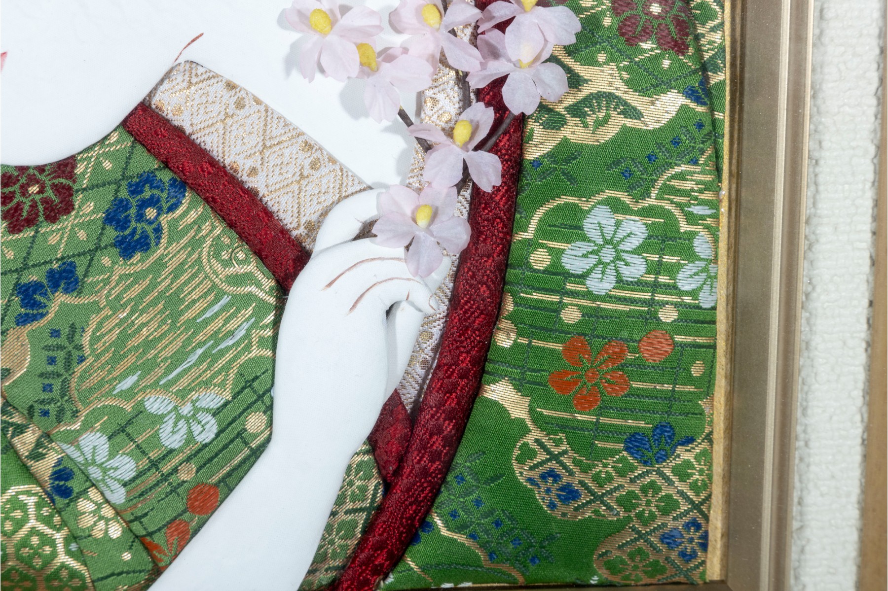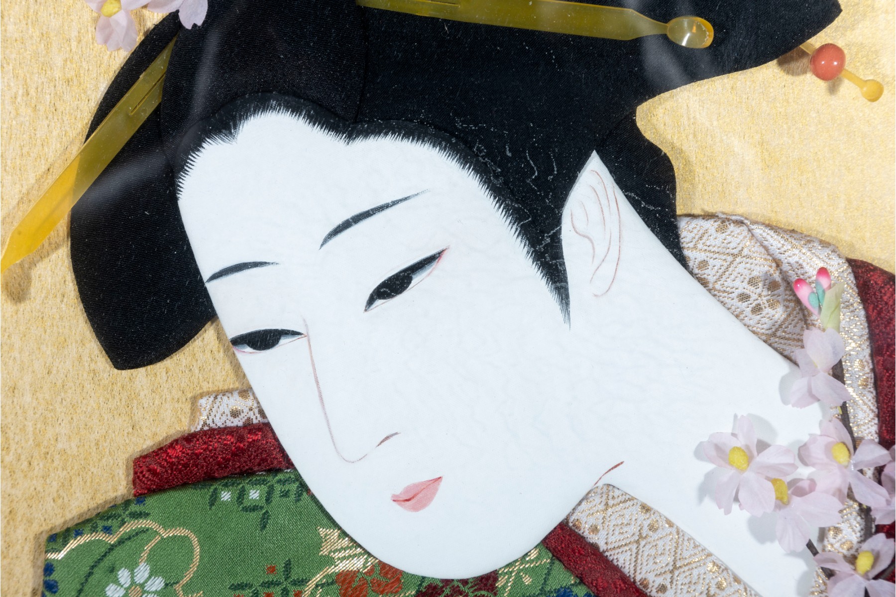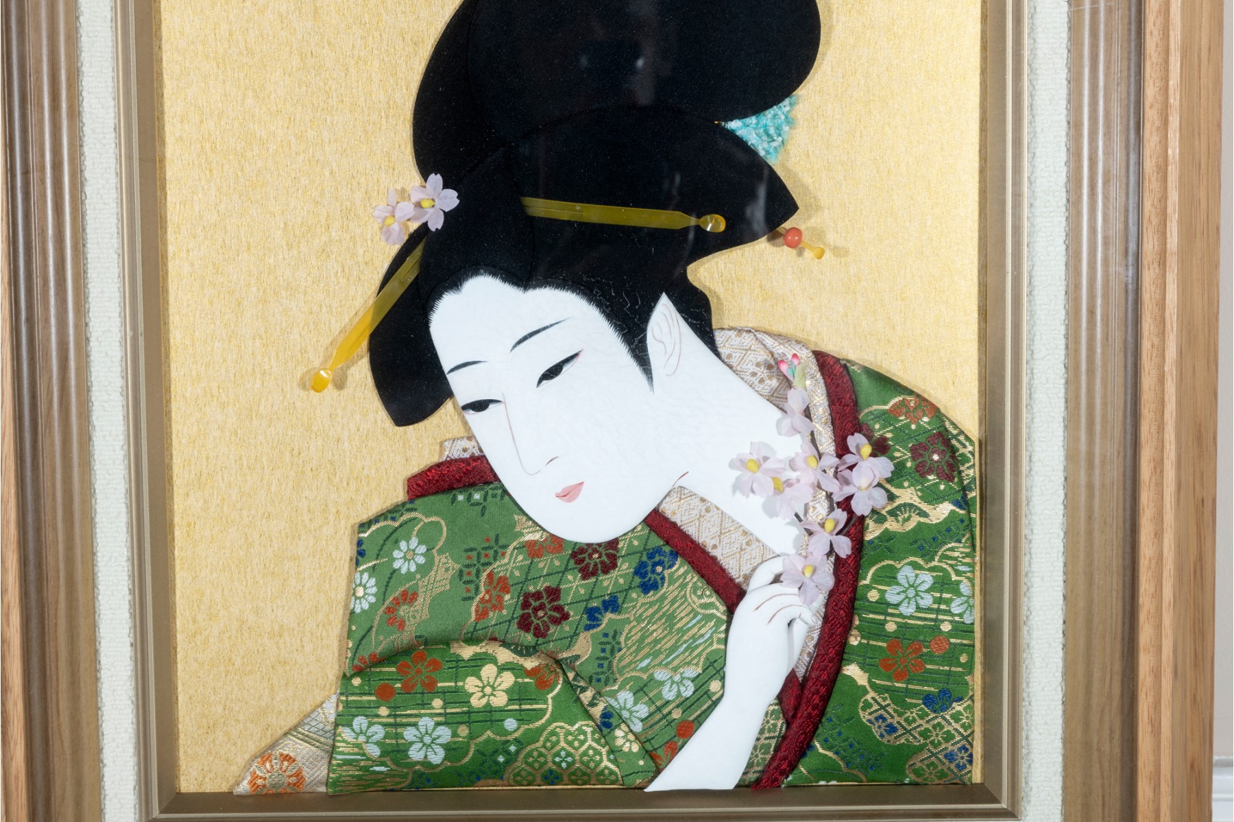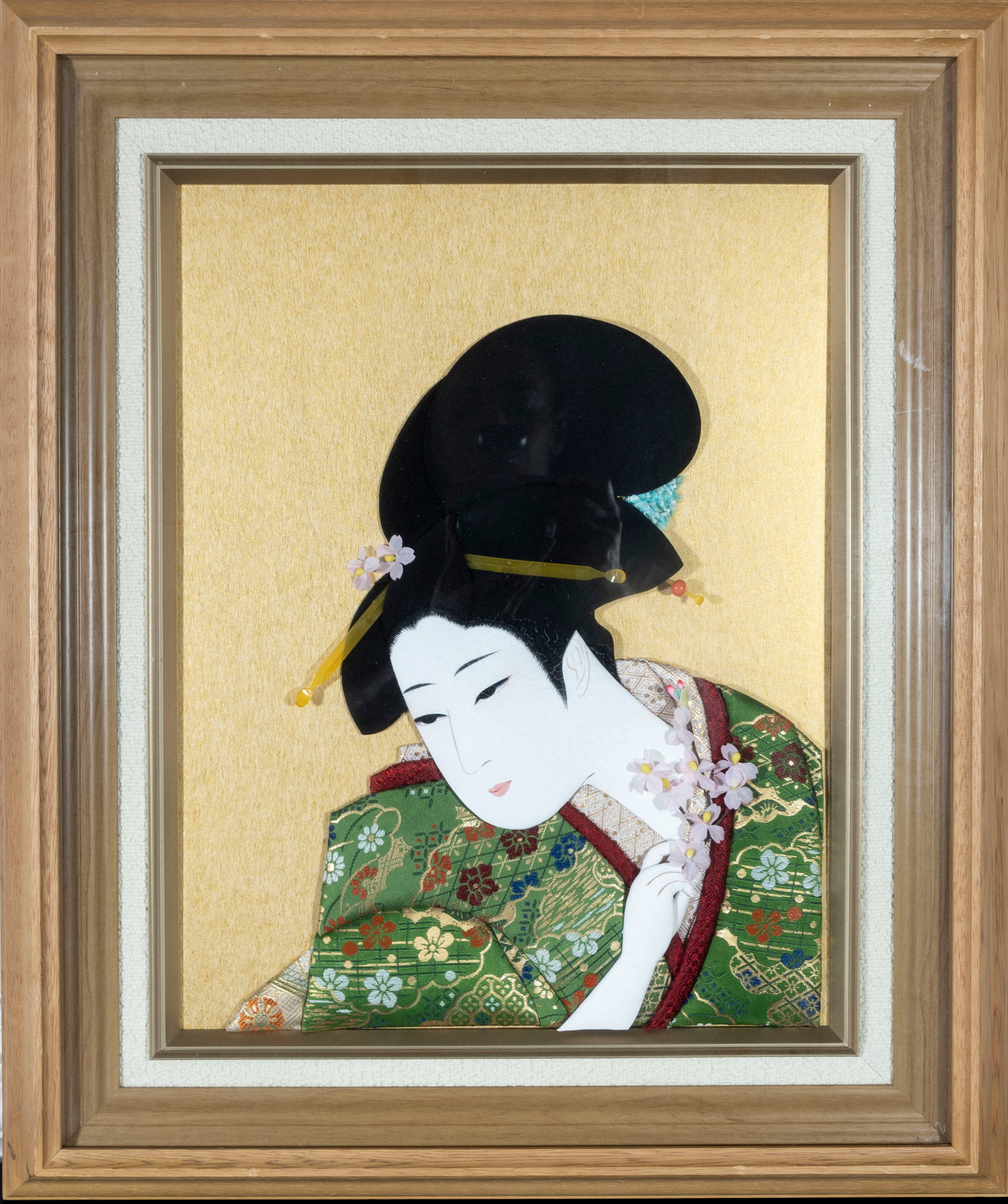 A traditional Japanese Oshie (Oshi-e), a form of Japanese handicraft originating from the Edo period. Built in layers, each piece is wrapped in beautiful kimono fabric or paper, padded with cotton in between, and is nailed/glued together to create a three-dimensional work of art. The background is plain, with depth coming from origami flowers and mixed media -- unsigned and presented in a wood shadow-box frame with a glass facing.