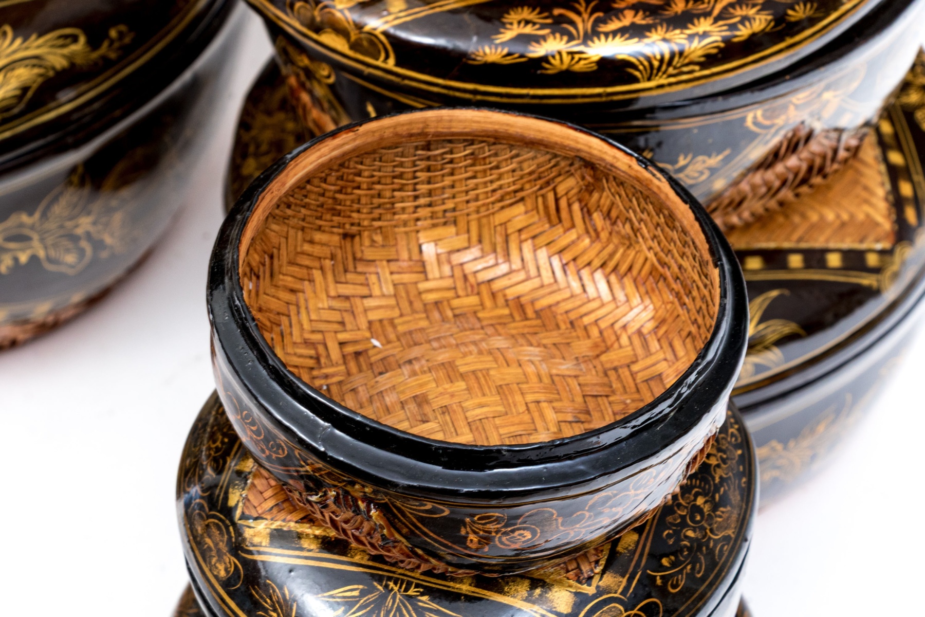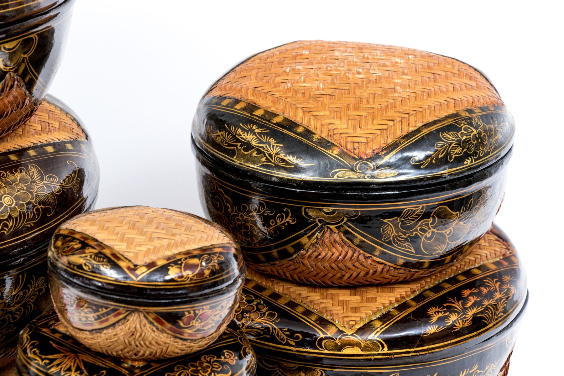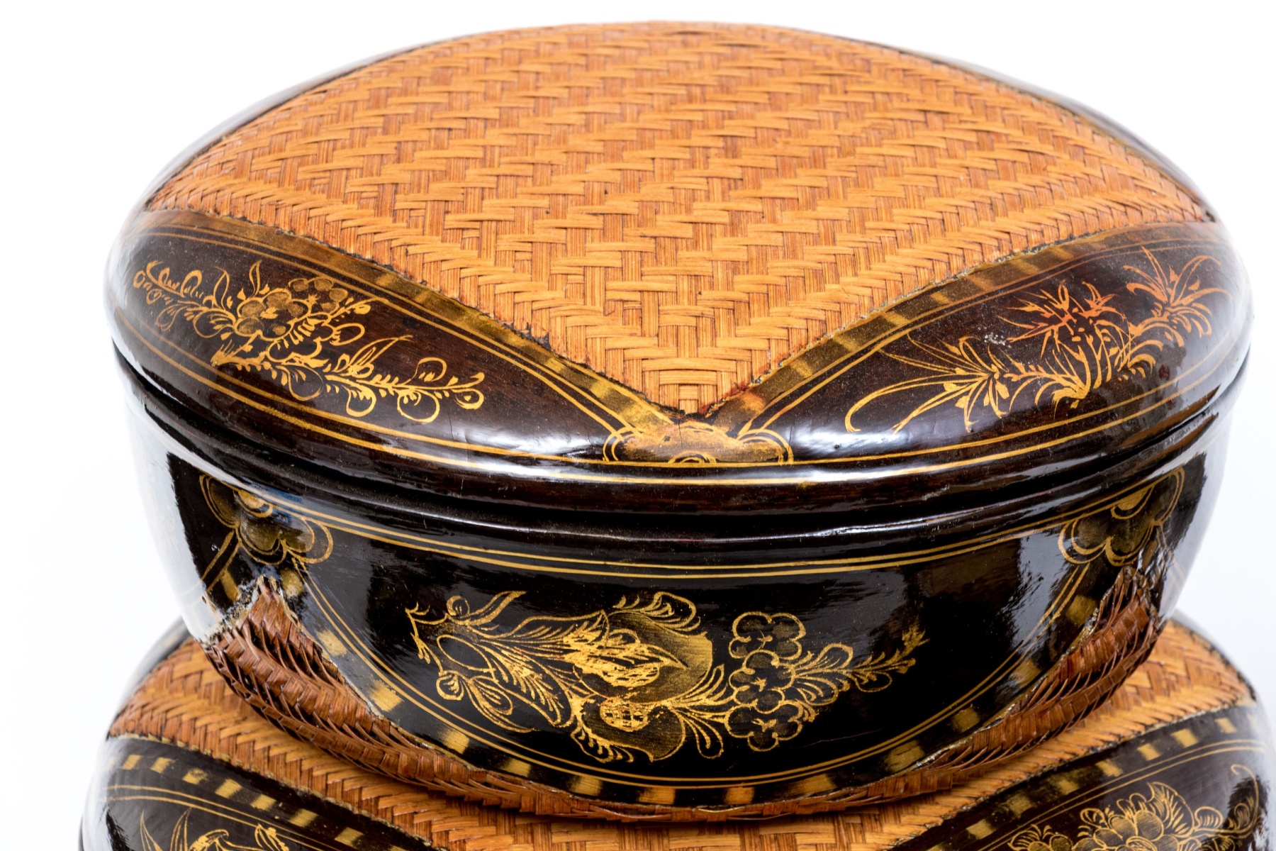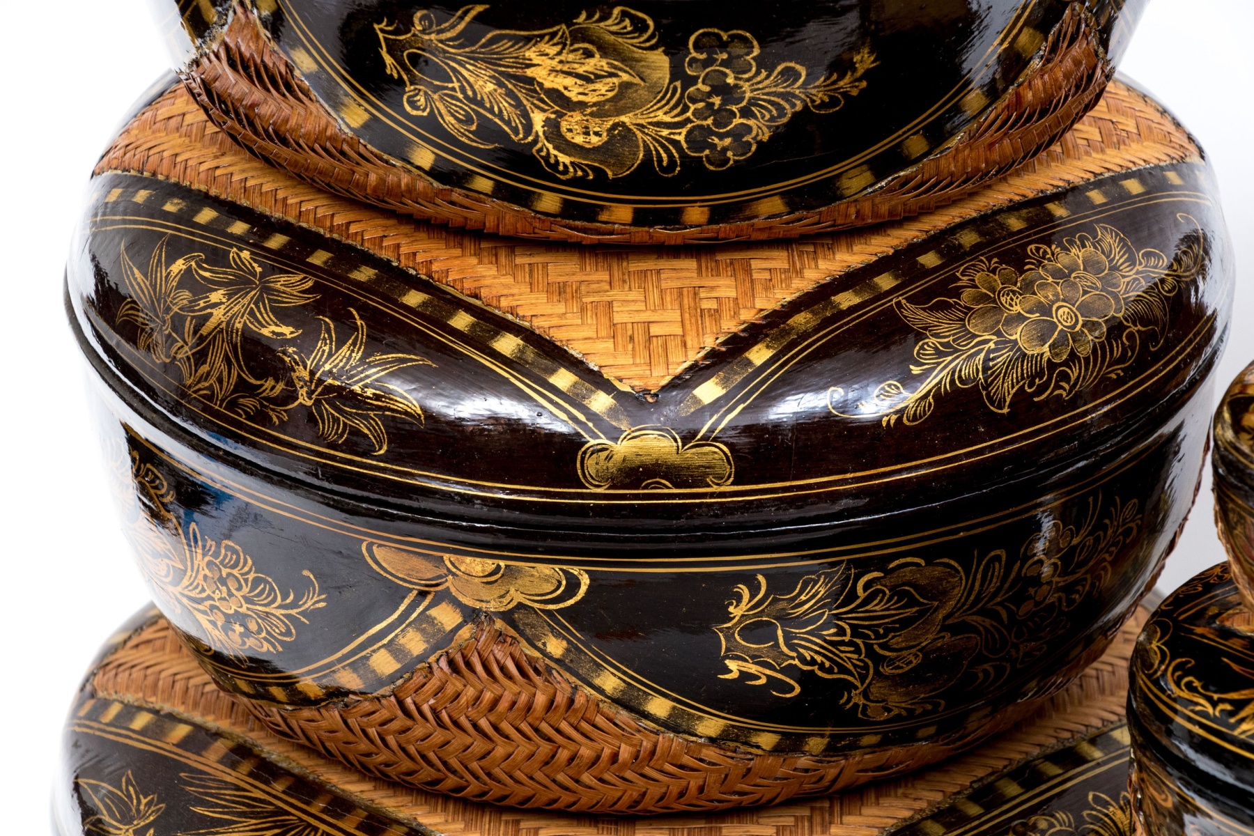 Each with laquered decoration and rattan woven square tops of graduated size to fit into the largest.