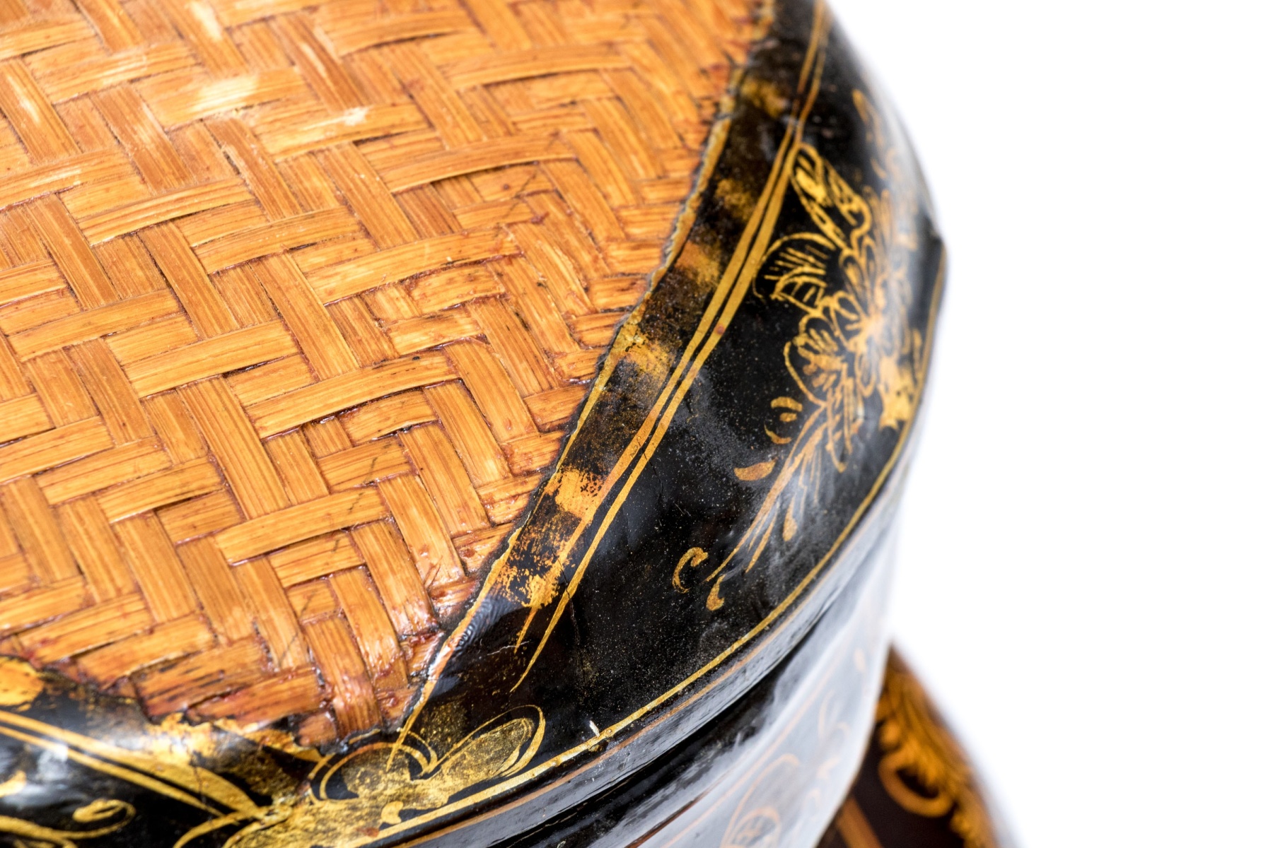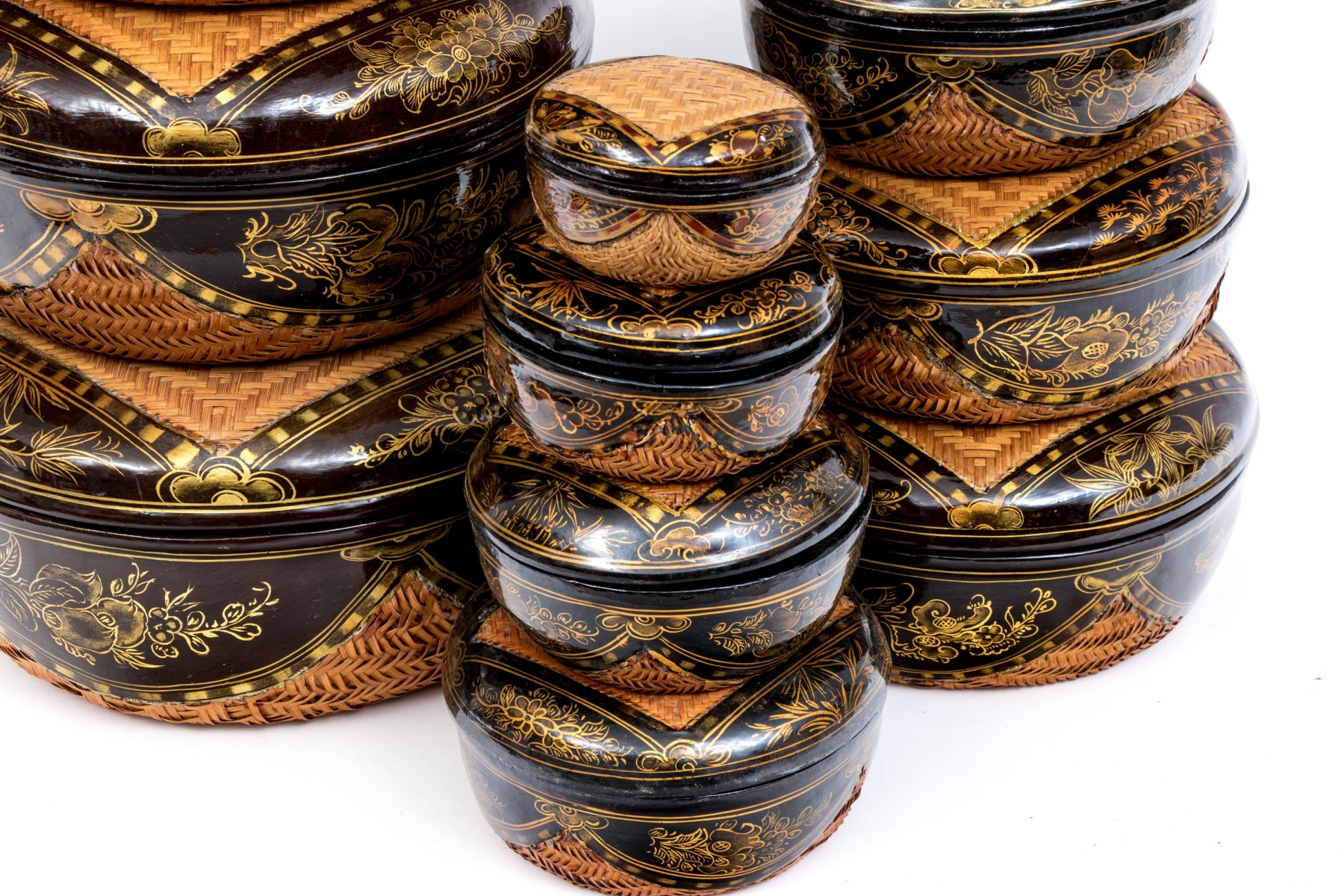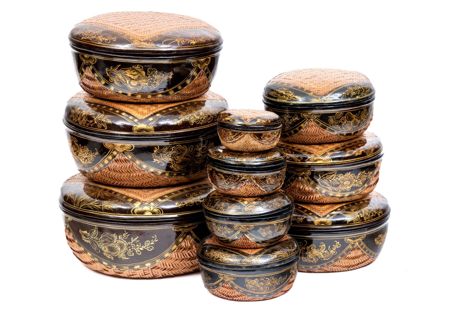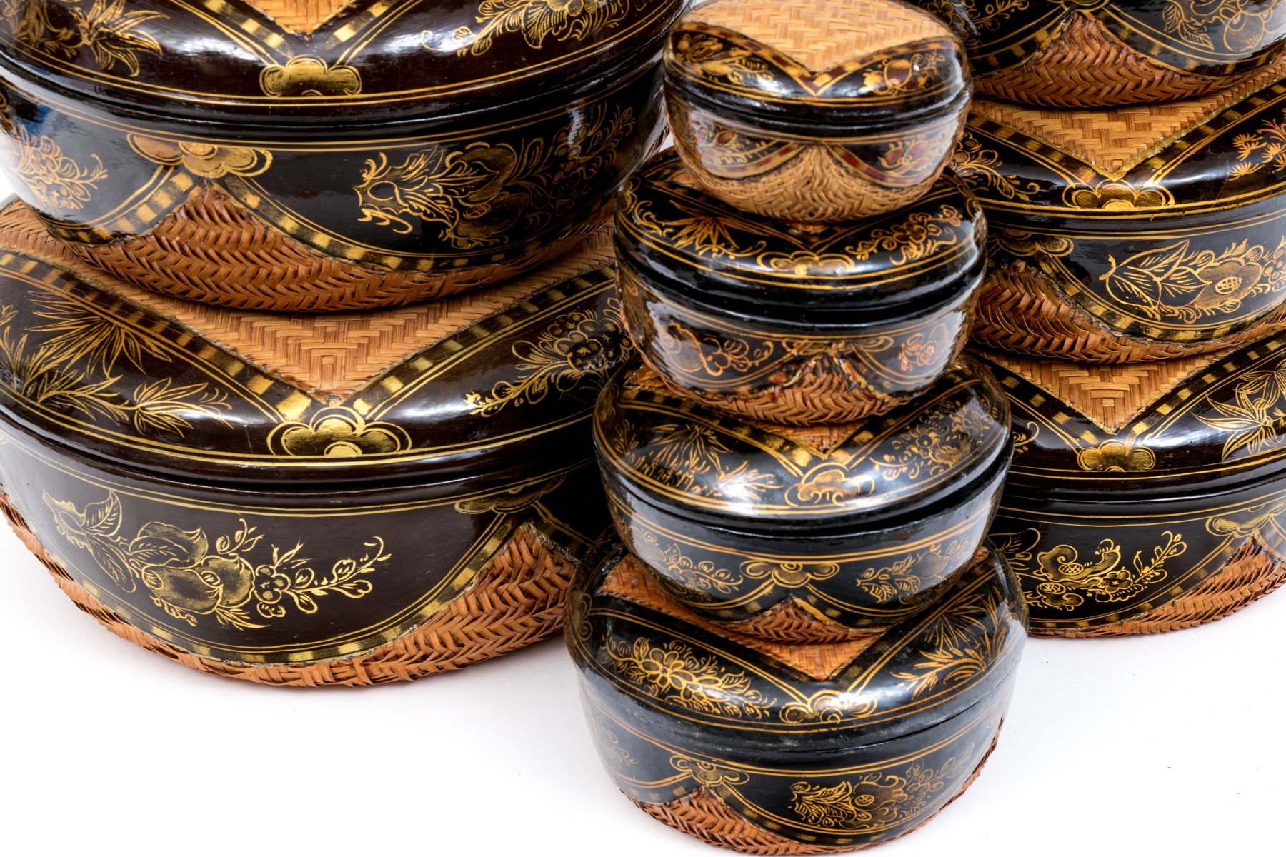 Each with laquered decoration and rattan woven square tops of graduated size to fit into the largest.