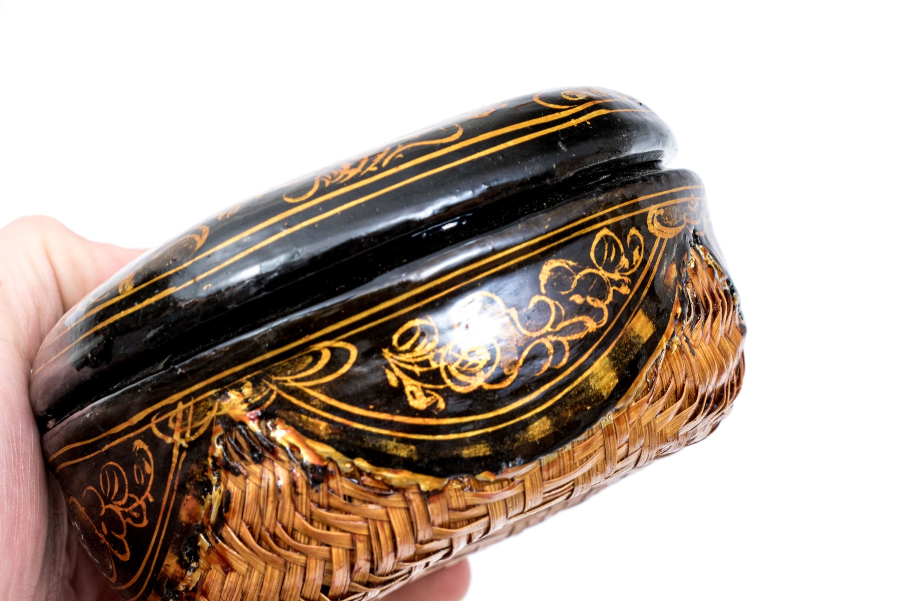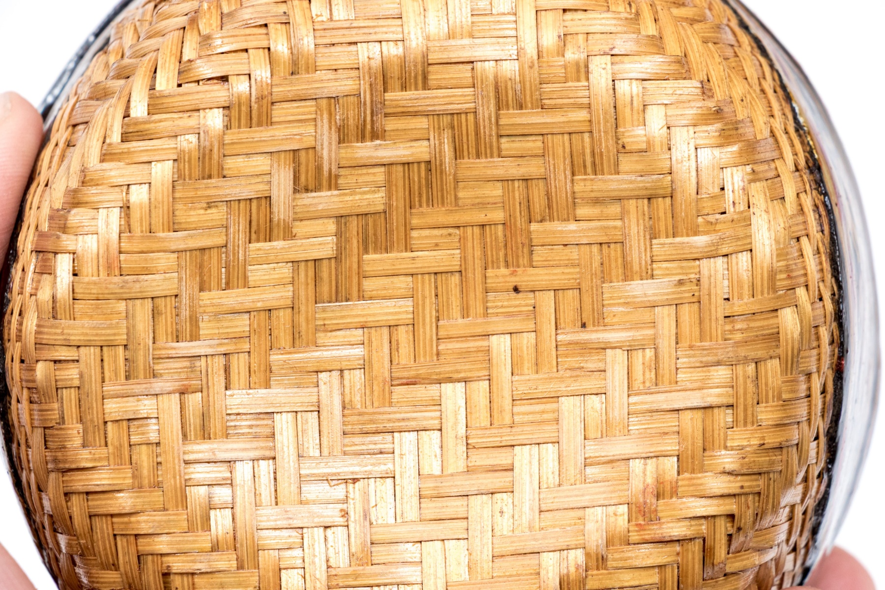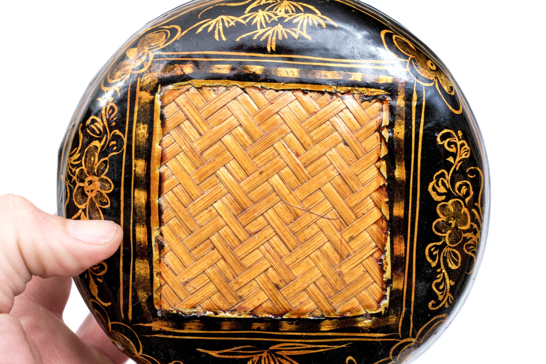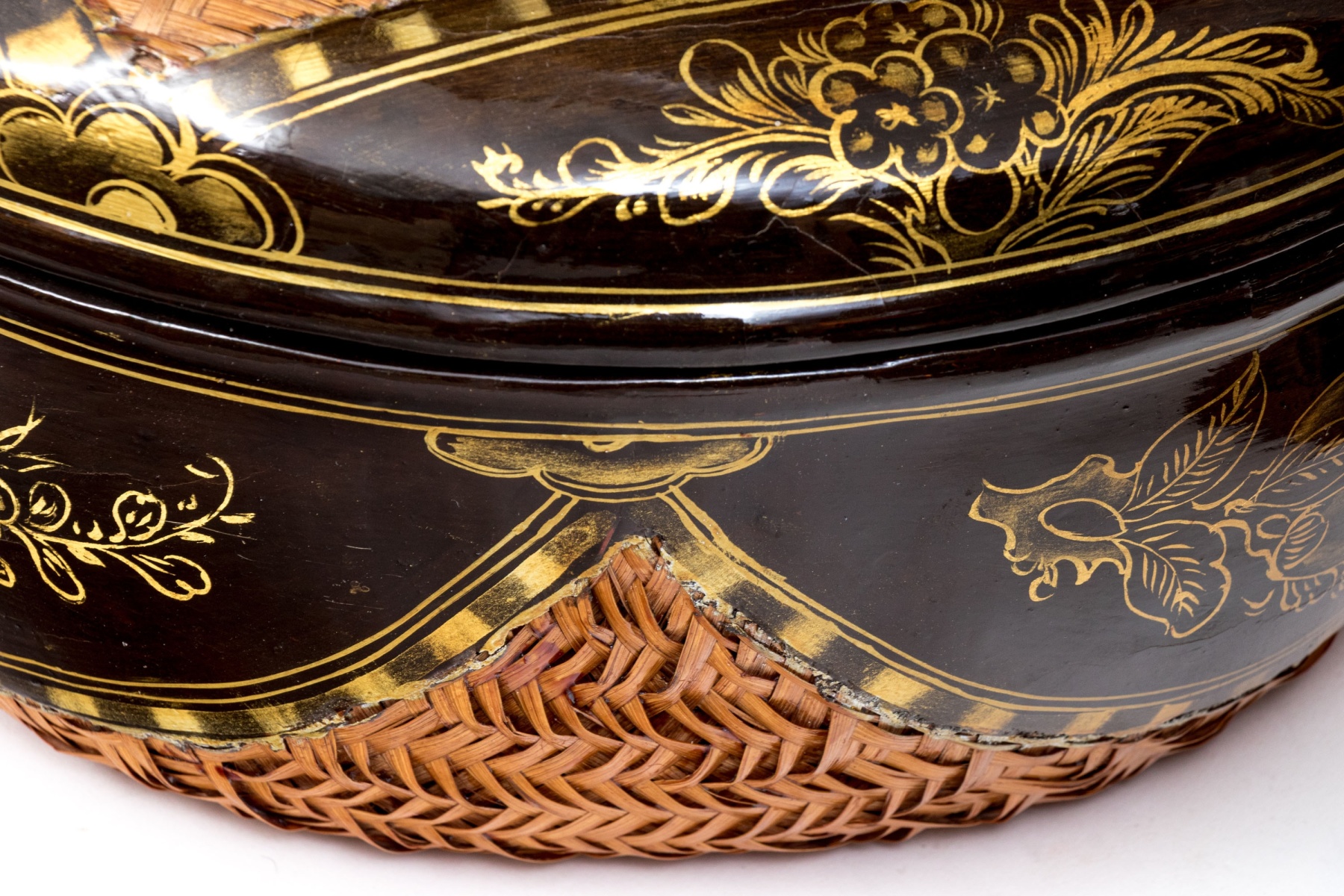 Each with laquered decoration and rattan woven square tops of graduated size to fit into the largest.
