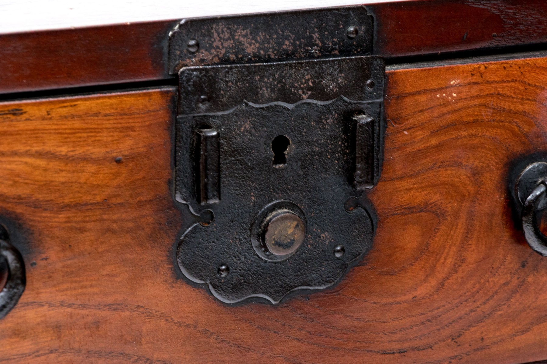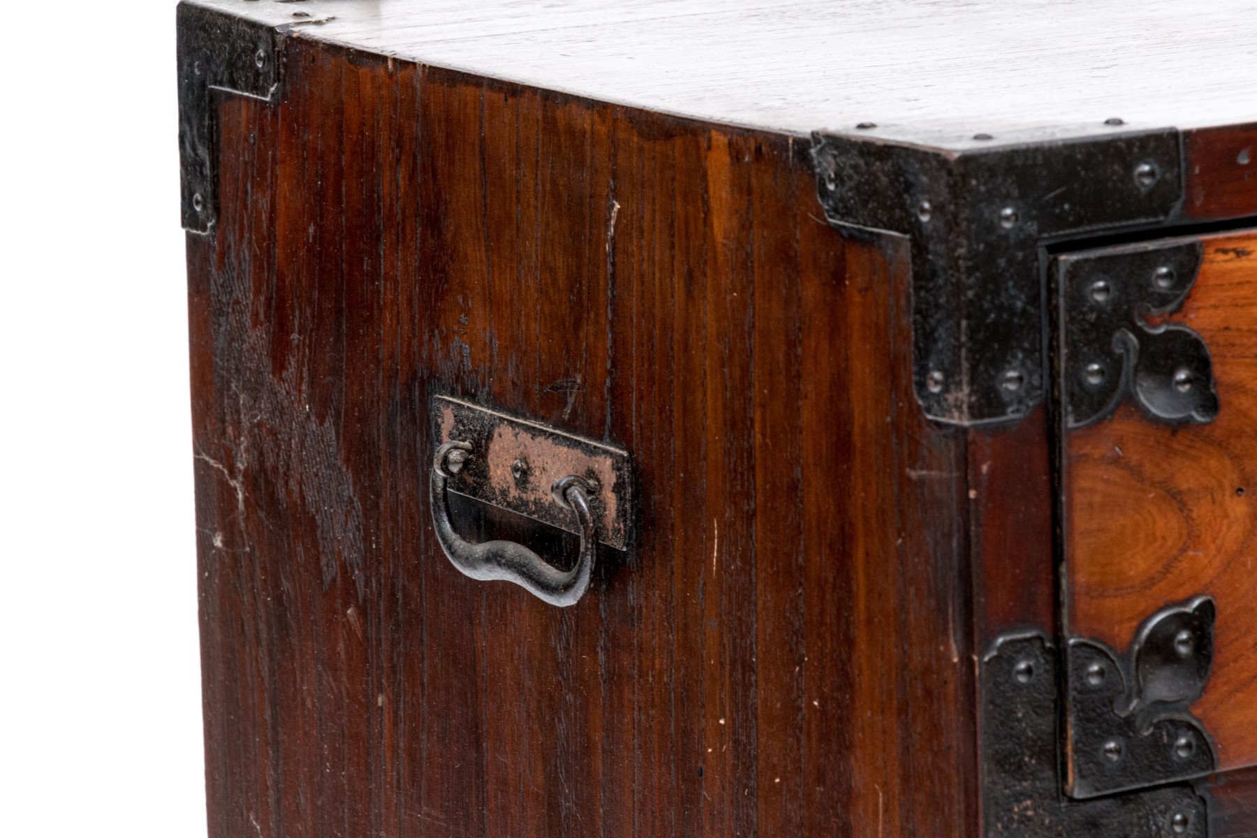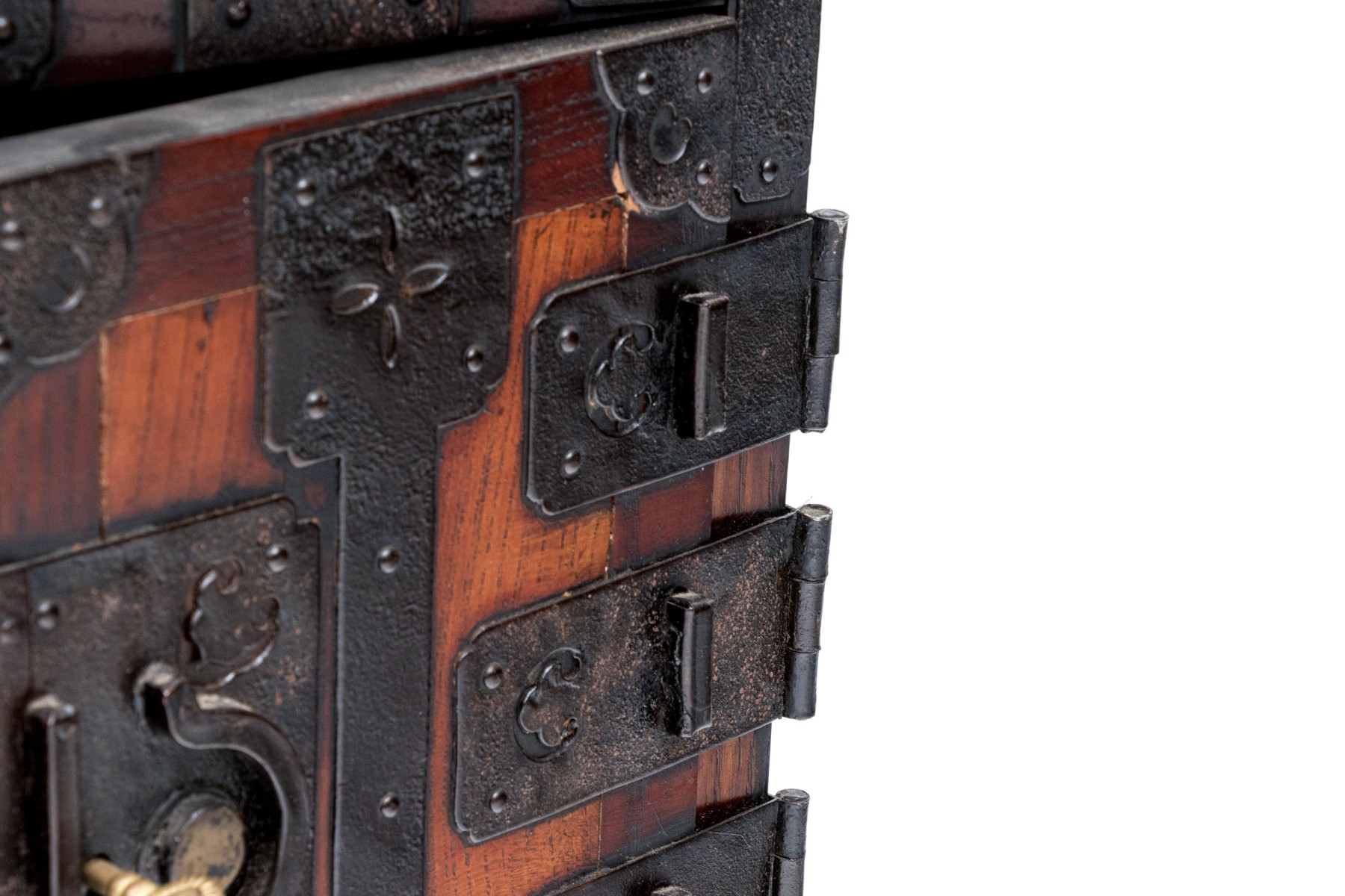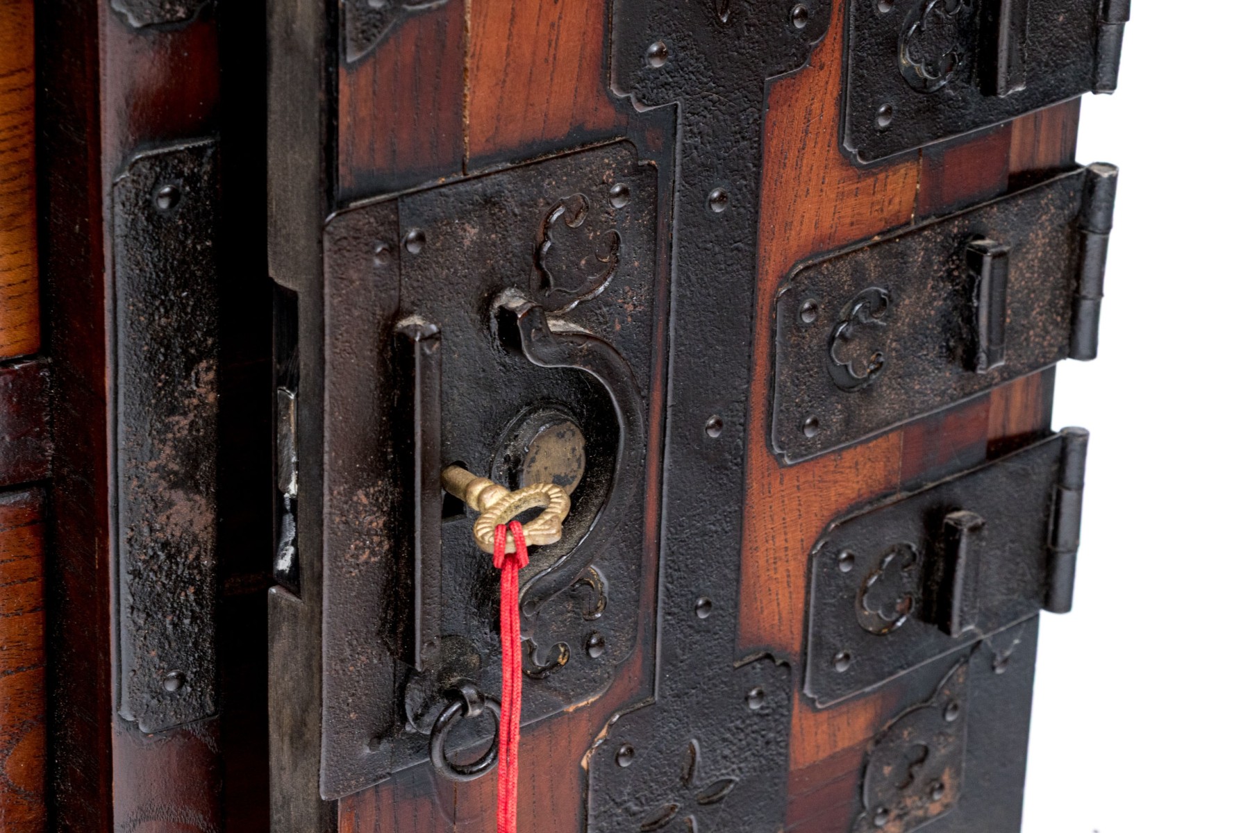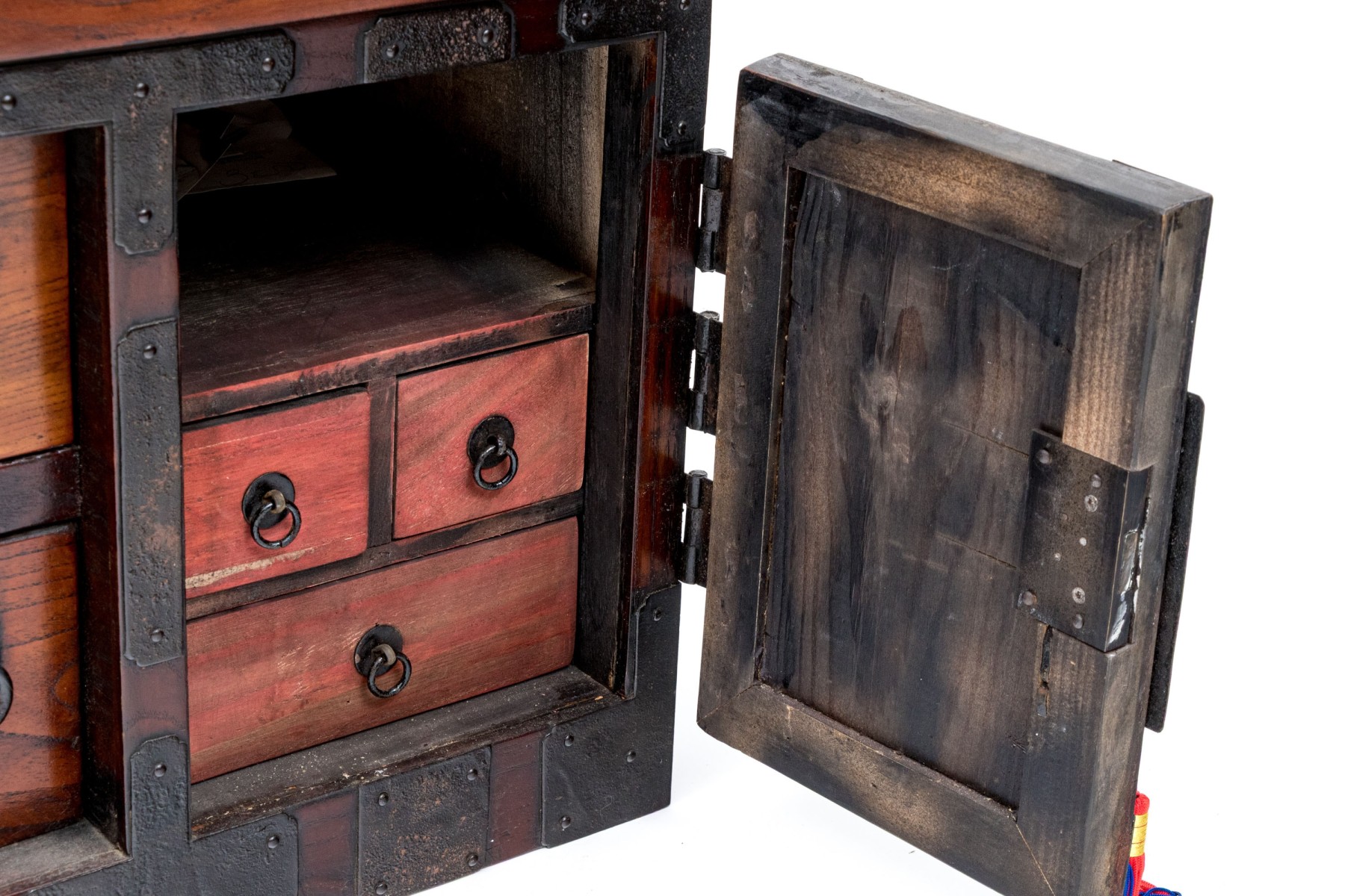 The case has iron mounts and is fitted with a long drawer, another door on the lower right opens up to interior shelf and three interior drawers. Opposite are two shelves with two handles.
