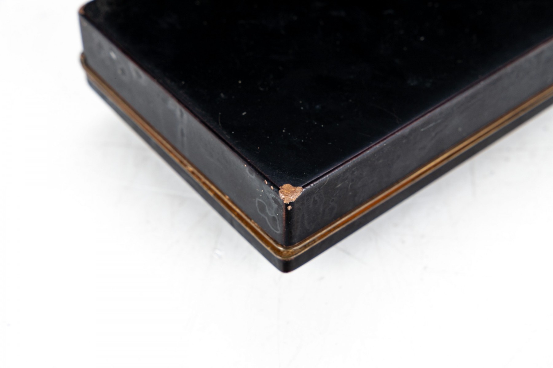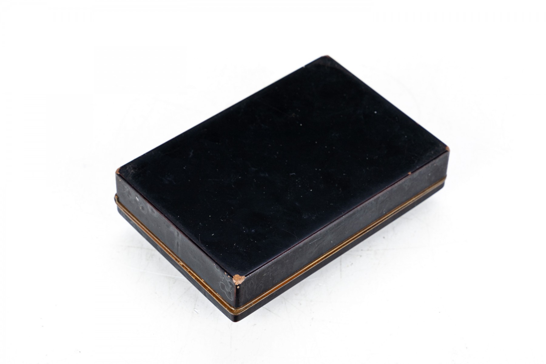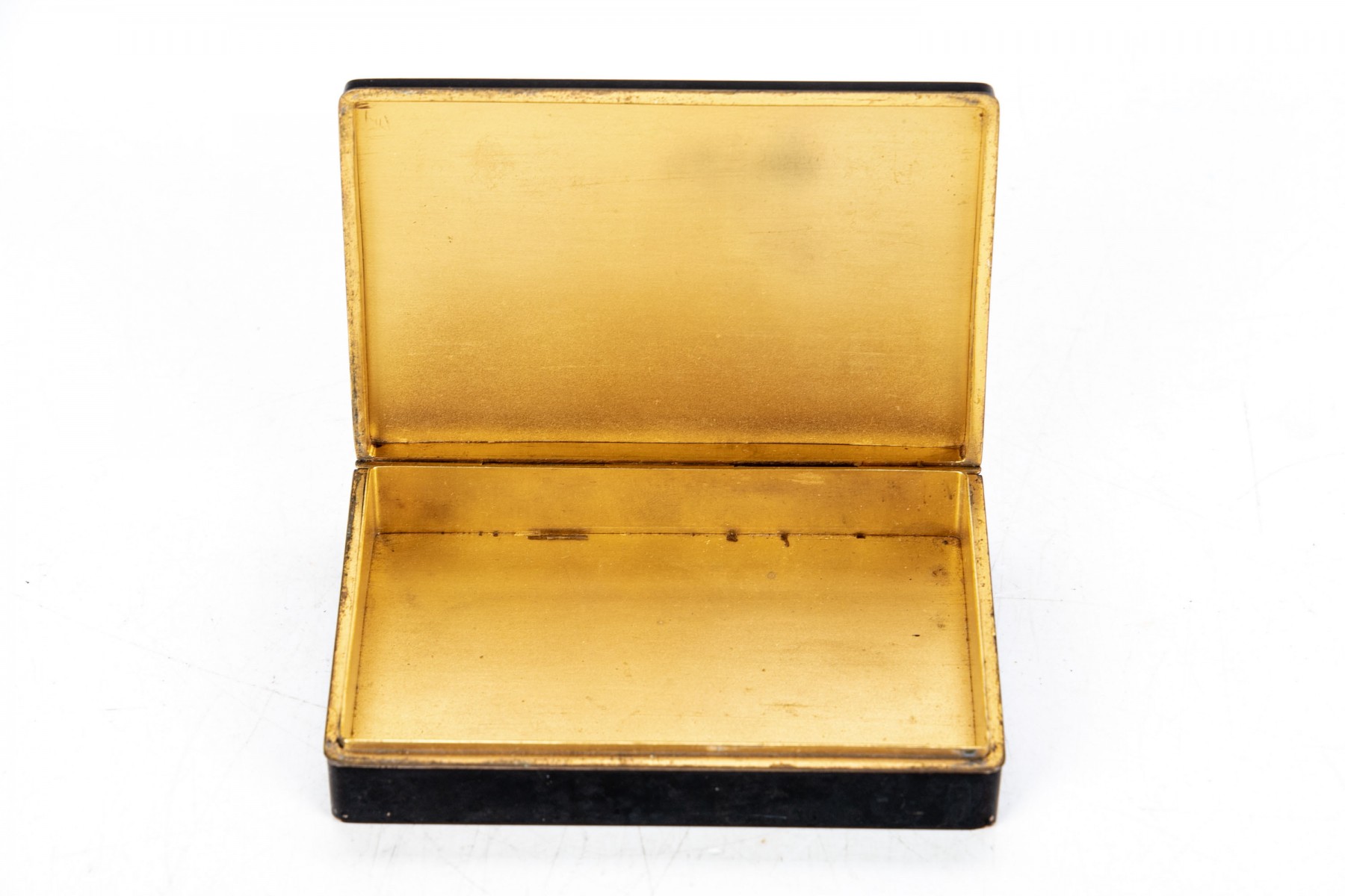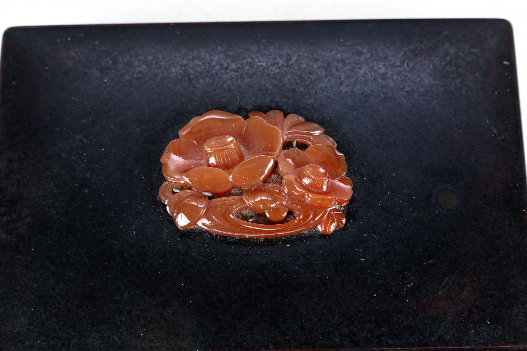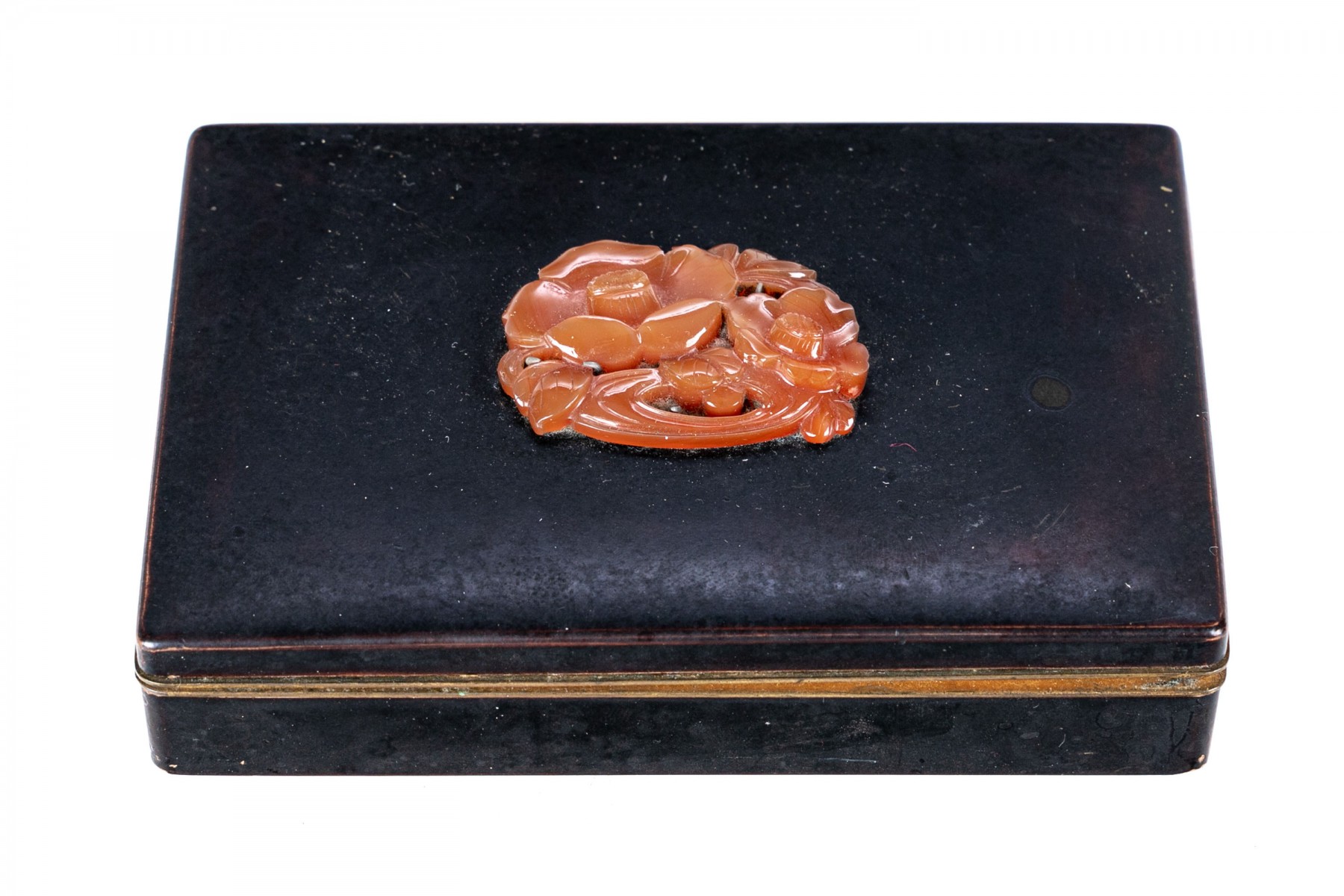 A simple dark metallic box with lid. Set into the lid is a red-brown carved chalcedony flower. The interior of the box has a bright metallic finish.