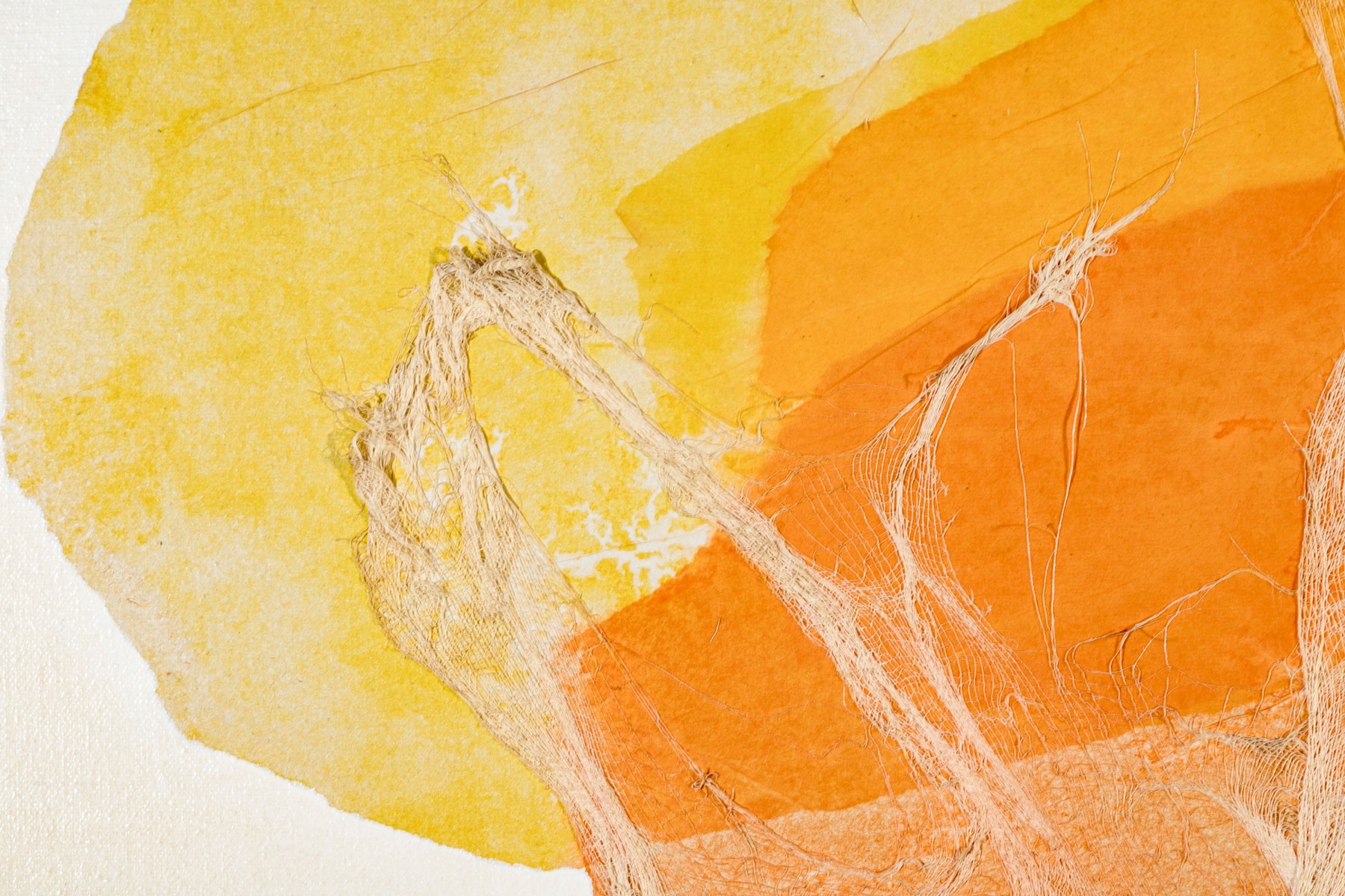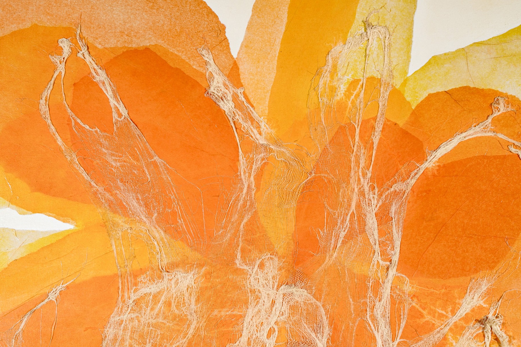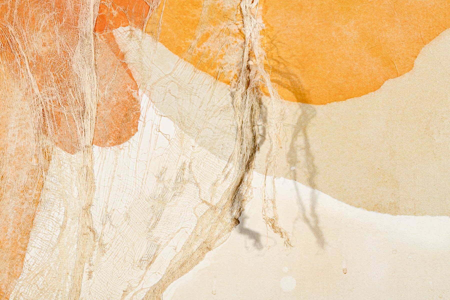 Large scale mixed media acrylic on canvas depicting a floral work with dimensional gauze accents.