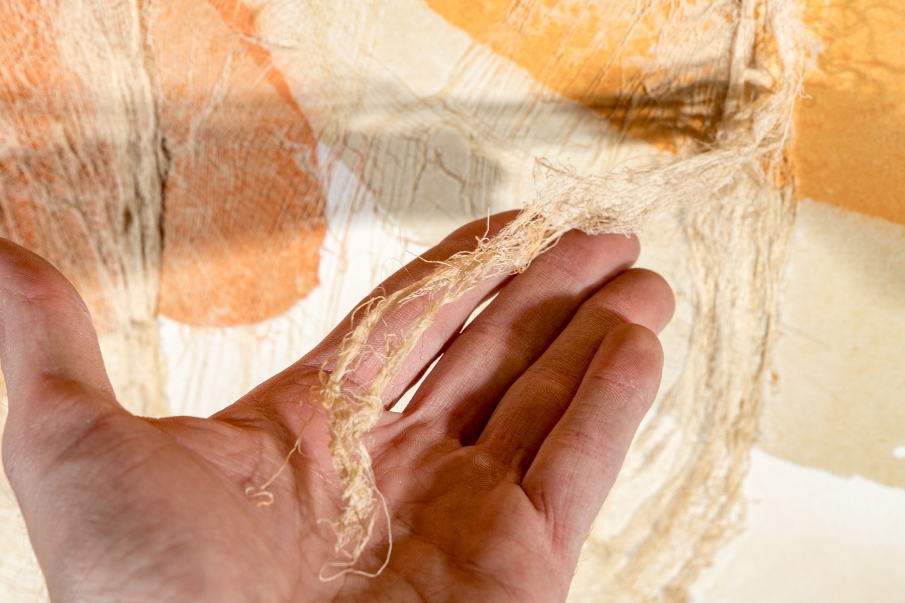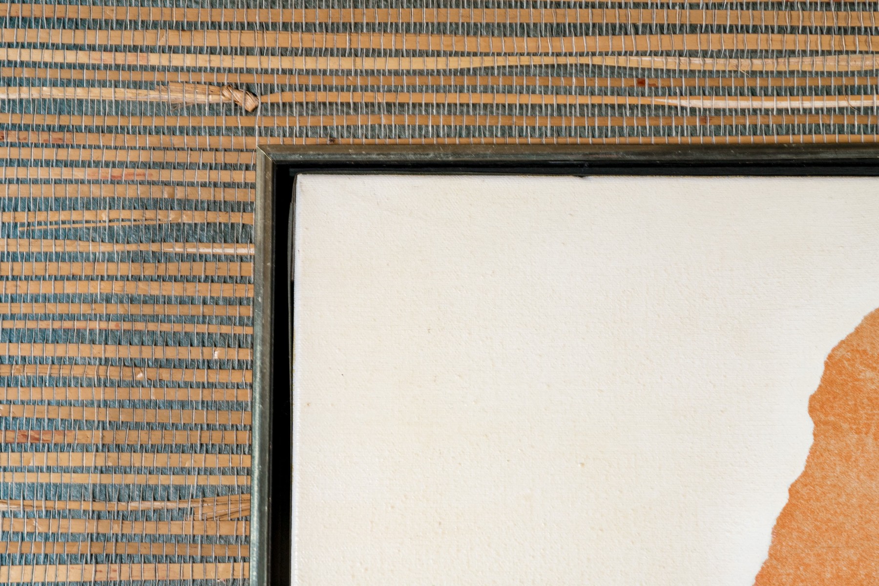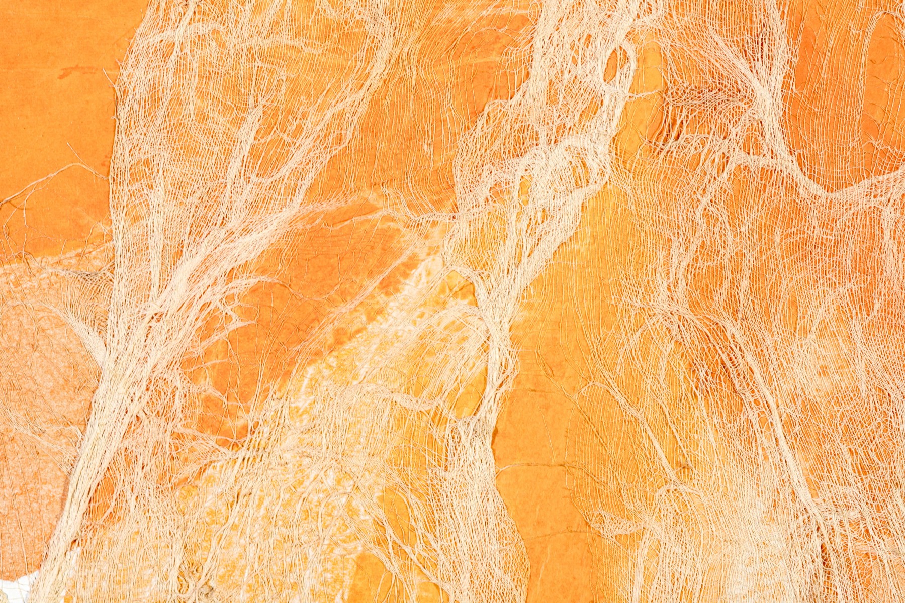 Large scale mixed media acrylic on canvas depicting a floral work with dimensional gauze accents.
