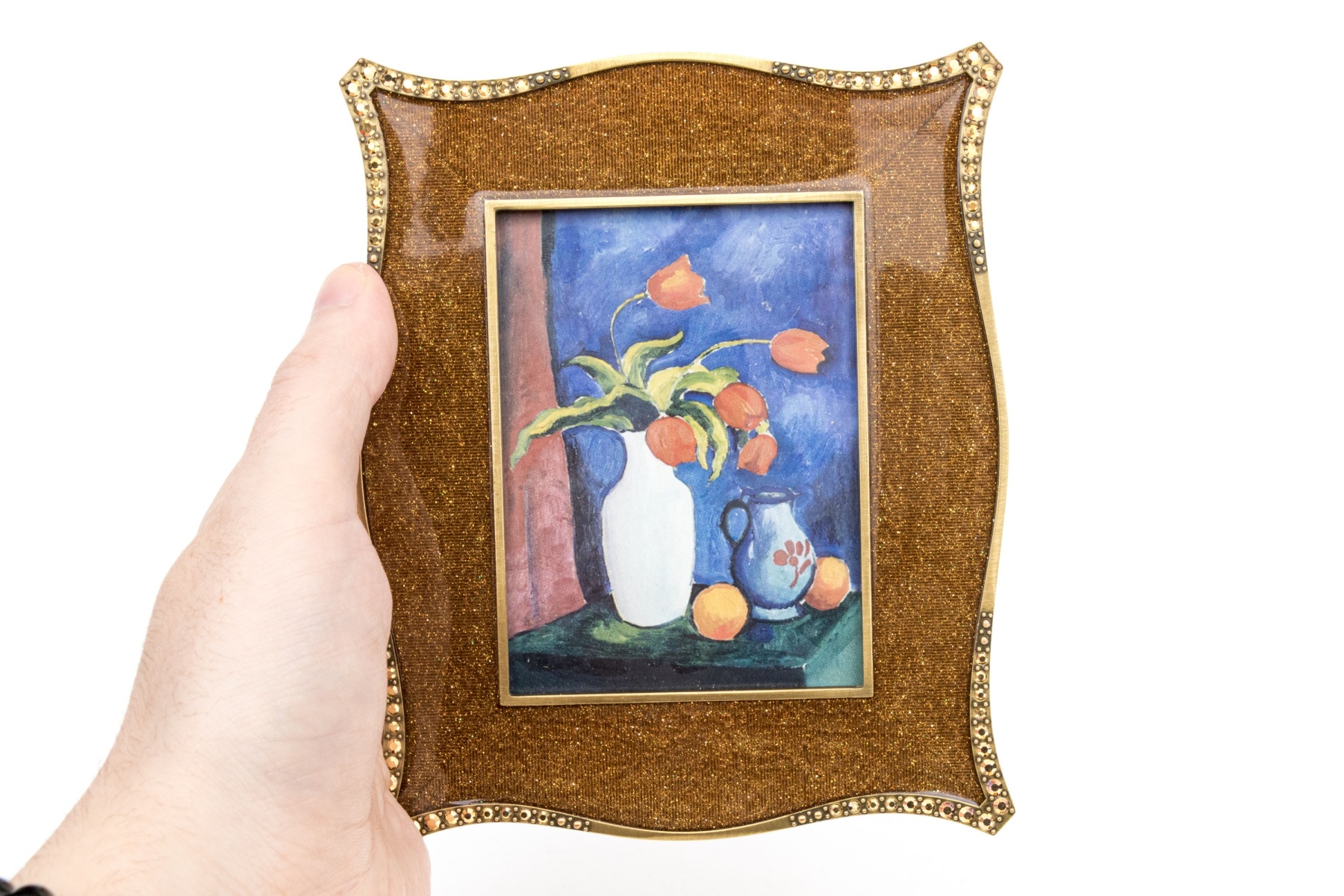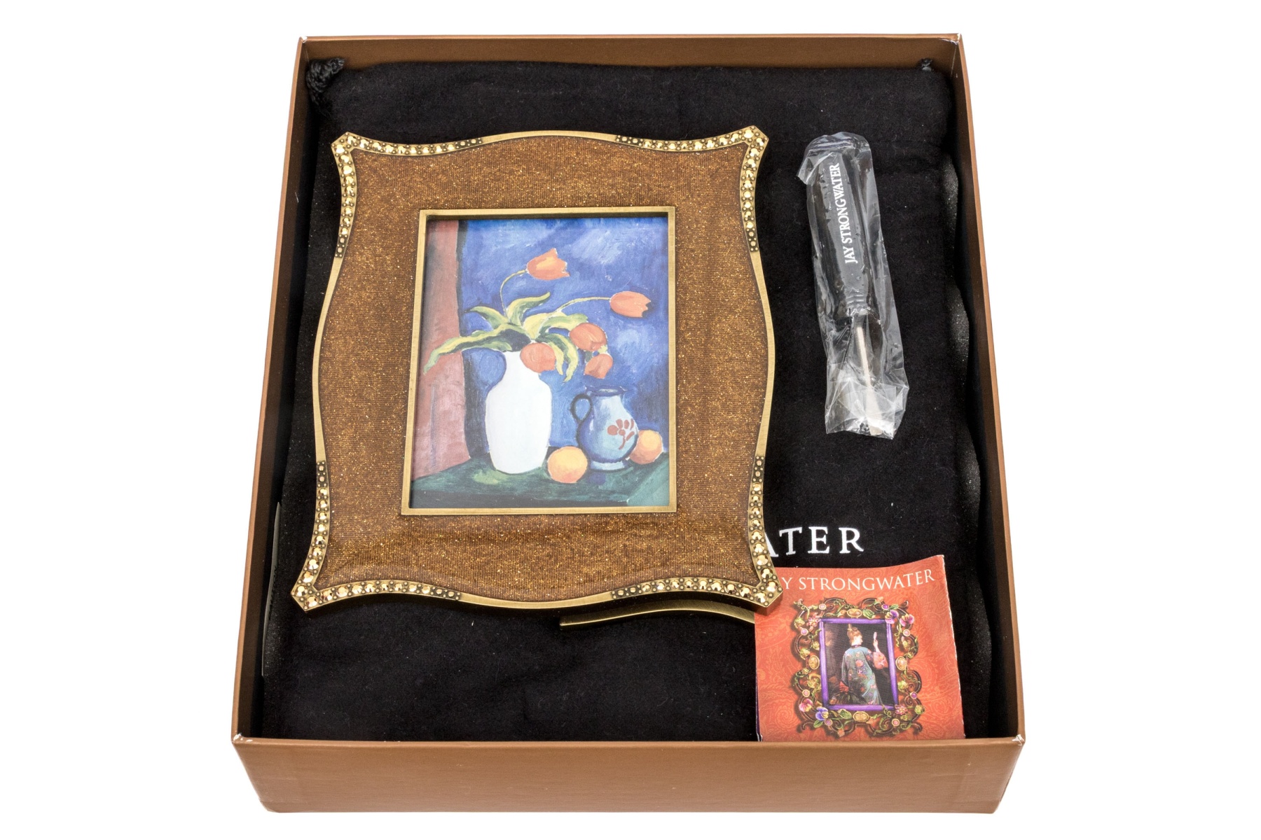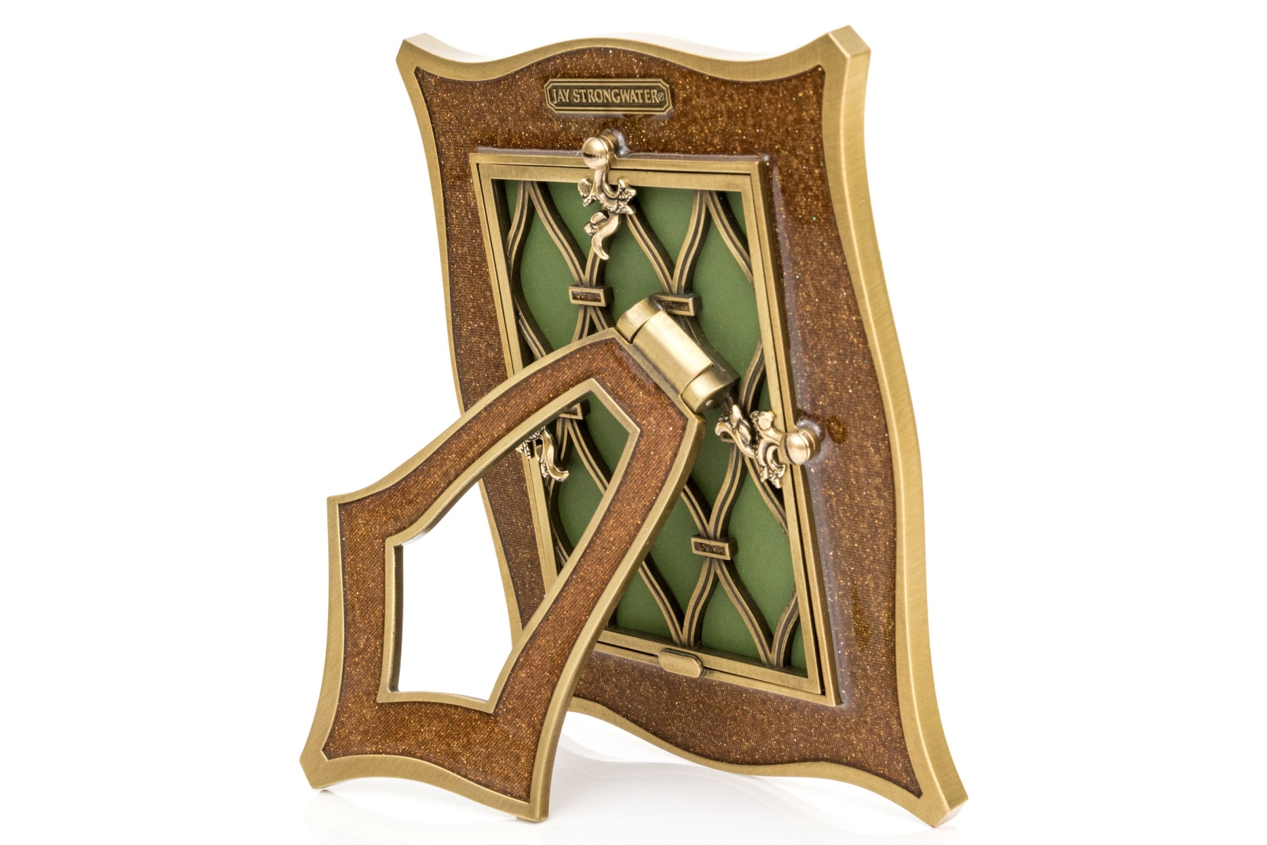 Retail $295. With the label. A serpentine copper tone sparkly frame set with stones at the corners. Along with a small screw driver for inserting the picture in the fittings on the back. Along with a pouch and brochure. Presented in the designer box.
