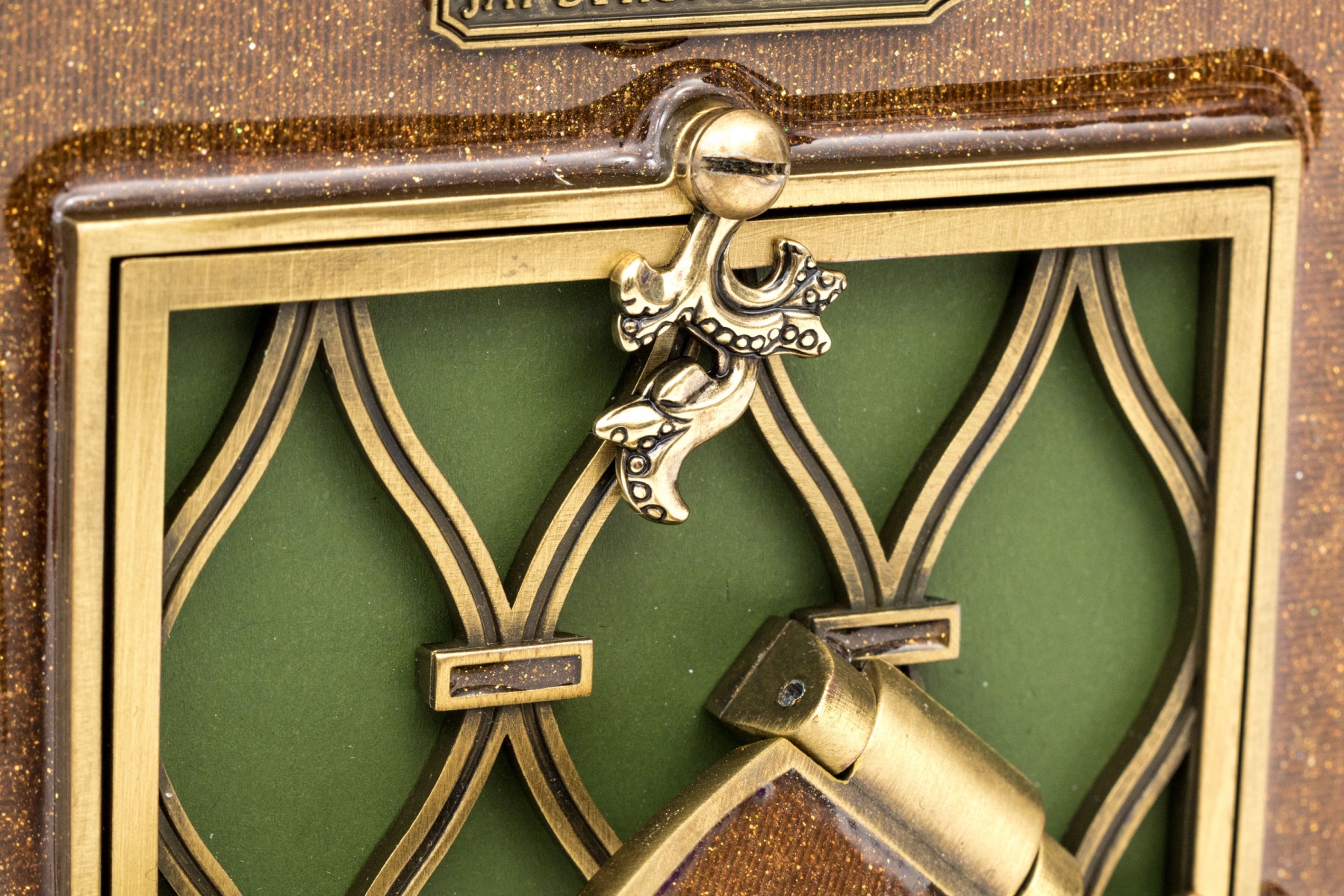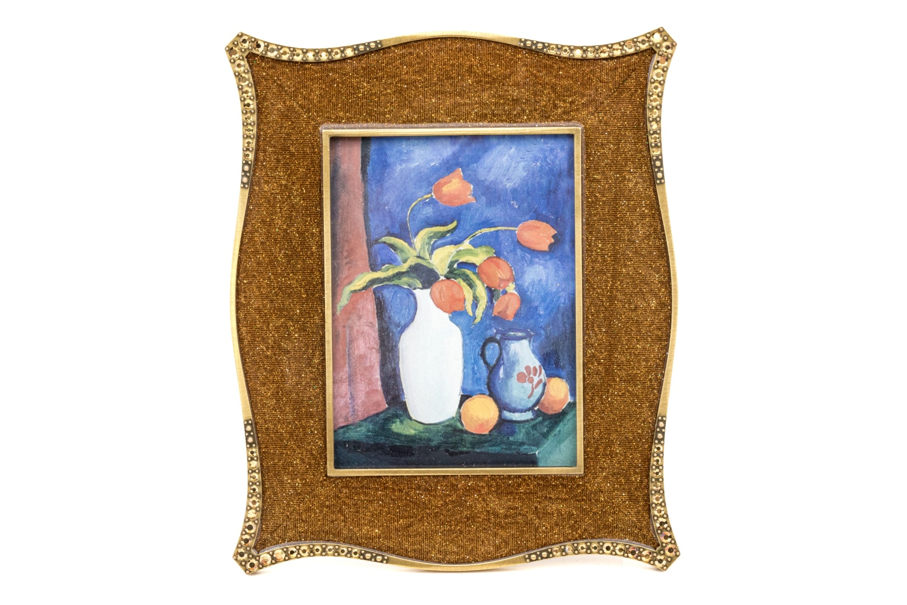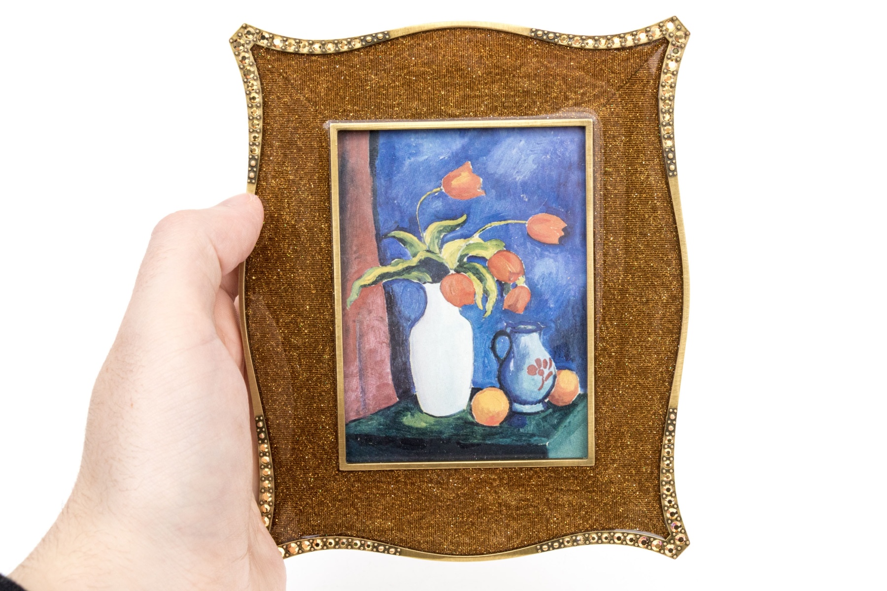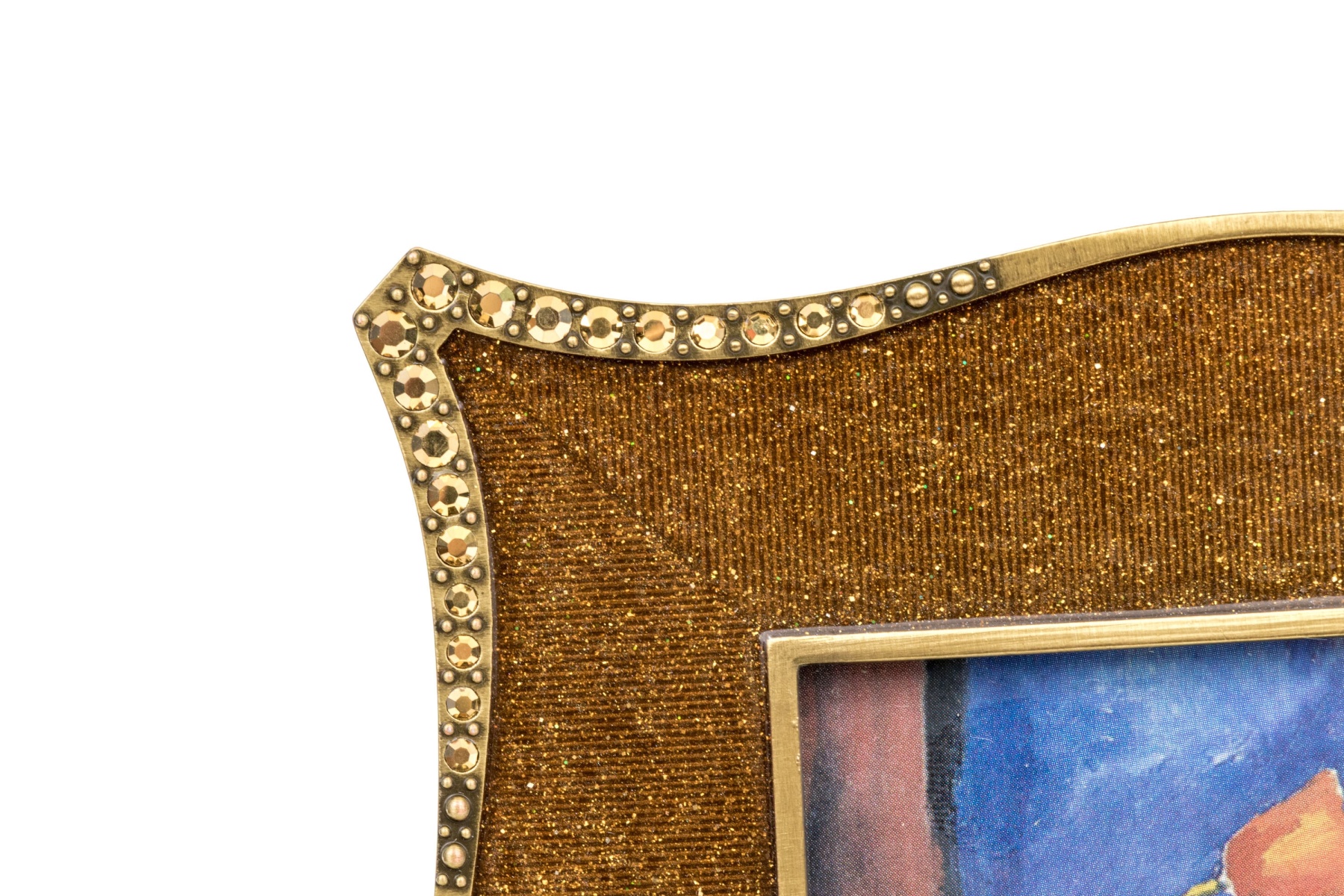 Retail $295. With the label. A serpentine copper tone sparkly frame set with stones at the corners. Along with a small screw driver for inserting the picture in the fittings on the back. Along with a pouch and brochure. Presented in the designer box.