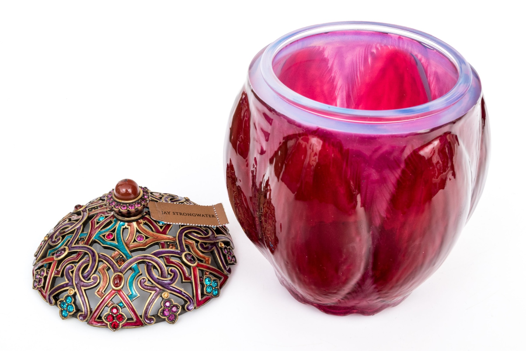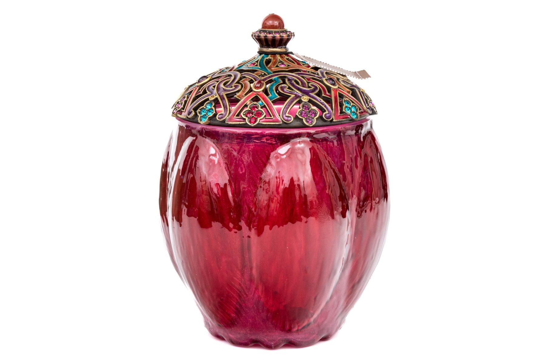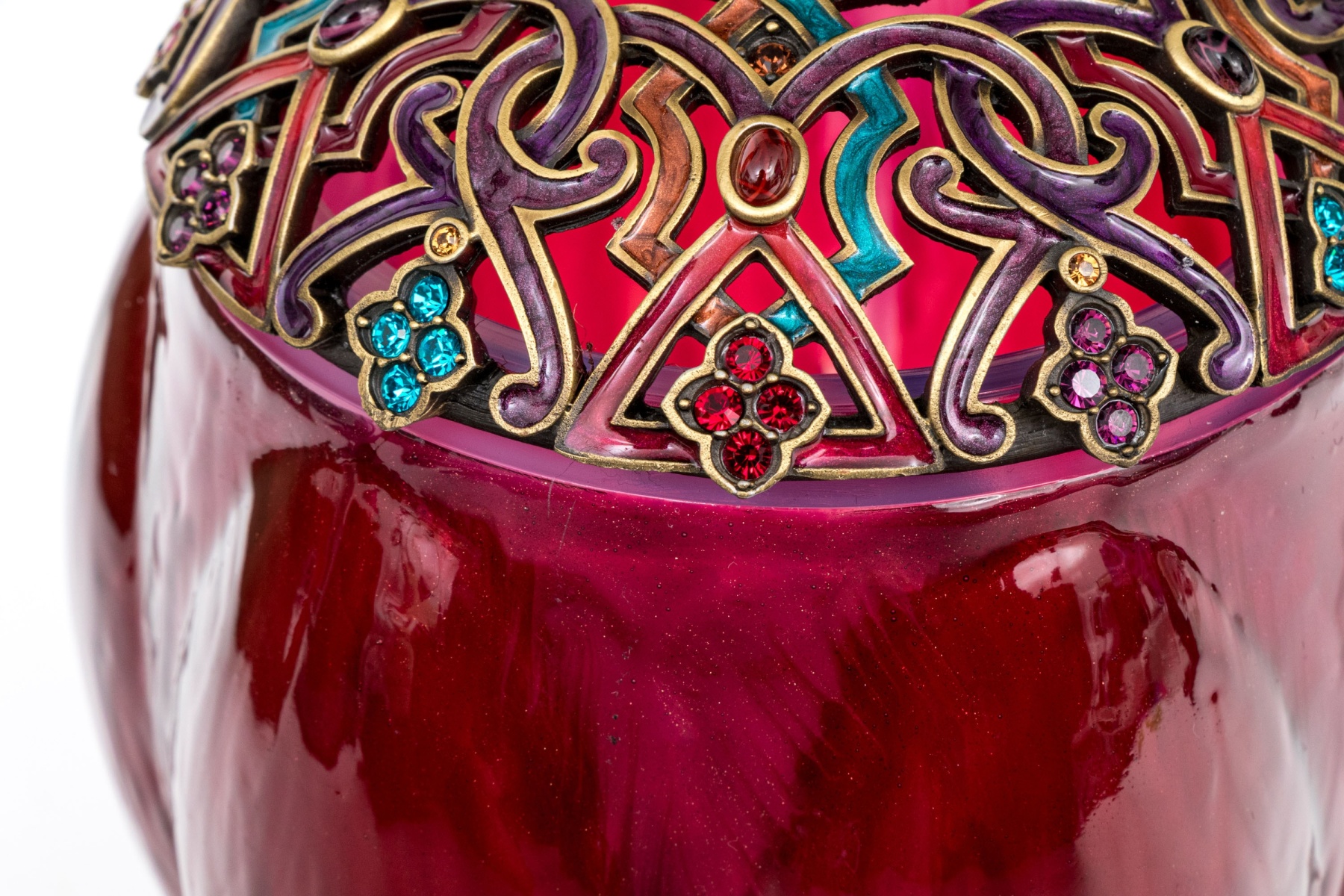 Retail $550. A lovely lobed dark red glass jar with a metal openwork scrolled lid enameled and set with stones. The finial with a cabochon. Presented in the designer brown box lined in foam along with a felt pouch.