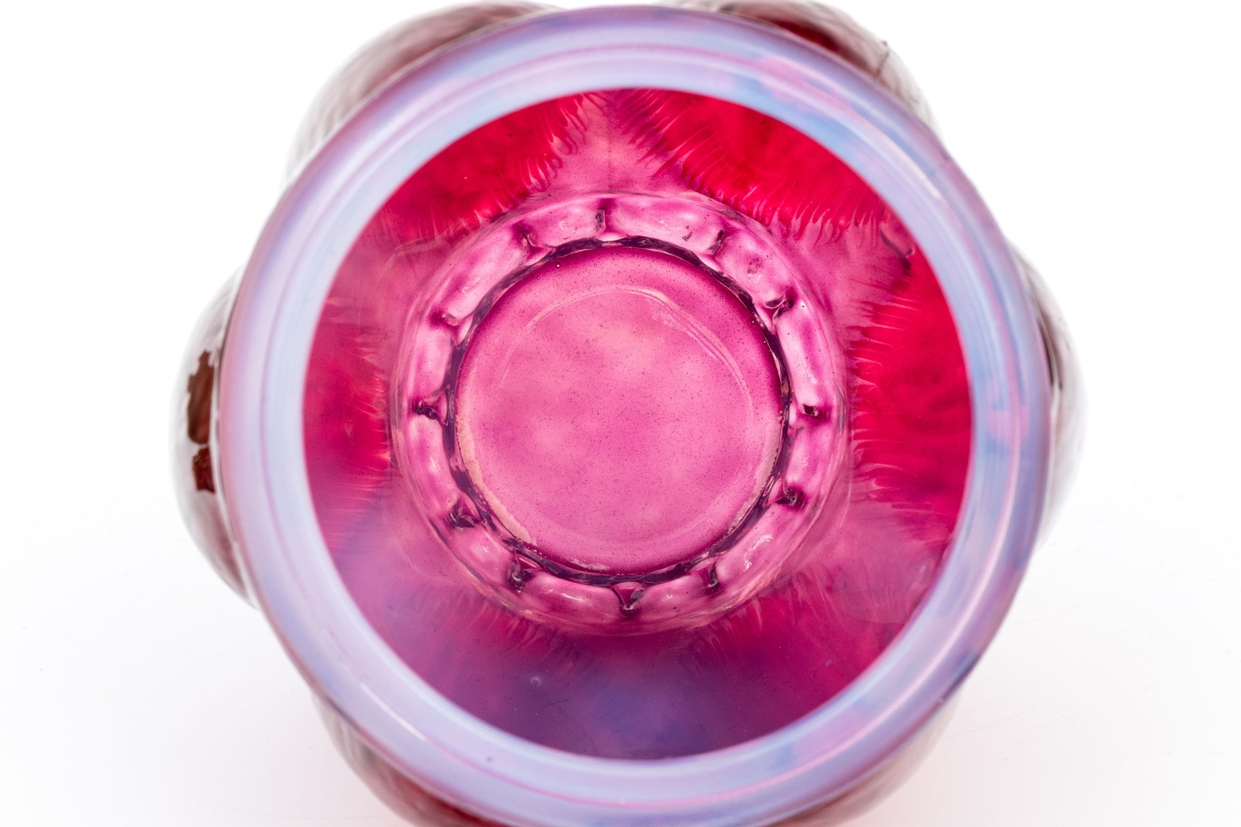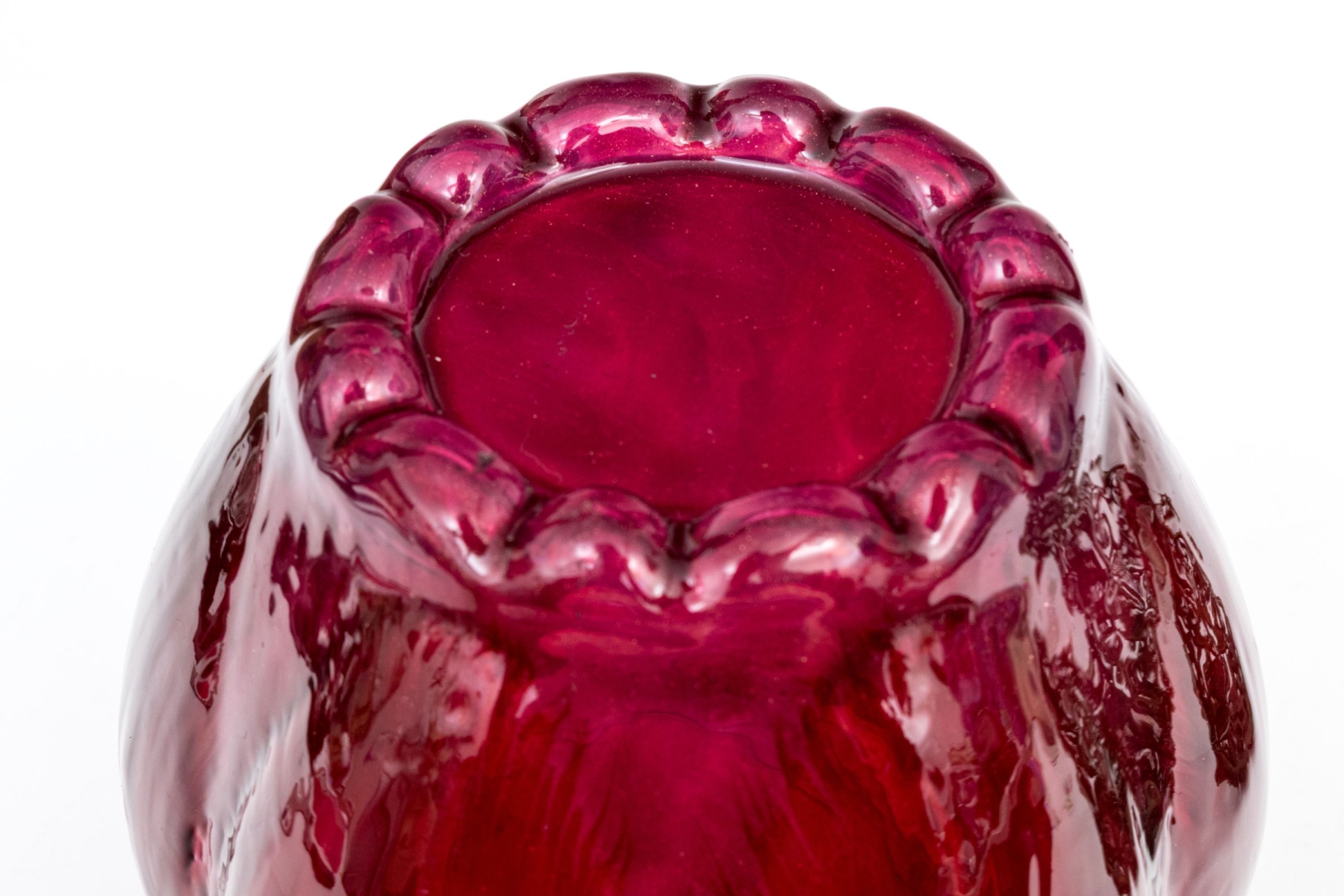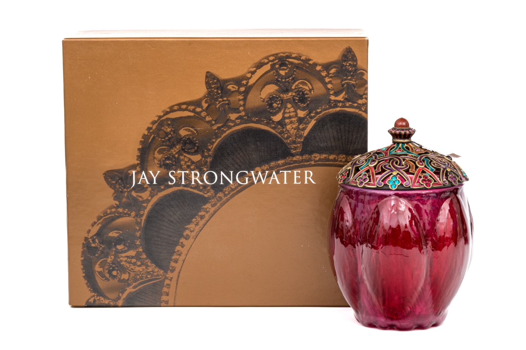 Retail $550. A lovely lobed dark red glass jar with a metal openwork scrolled lid enameled and set with stones. The finial with a cabochon. Presented in the designer brown box lined in foam along with a felt pouch.