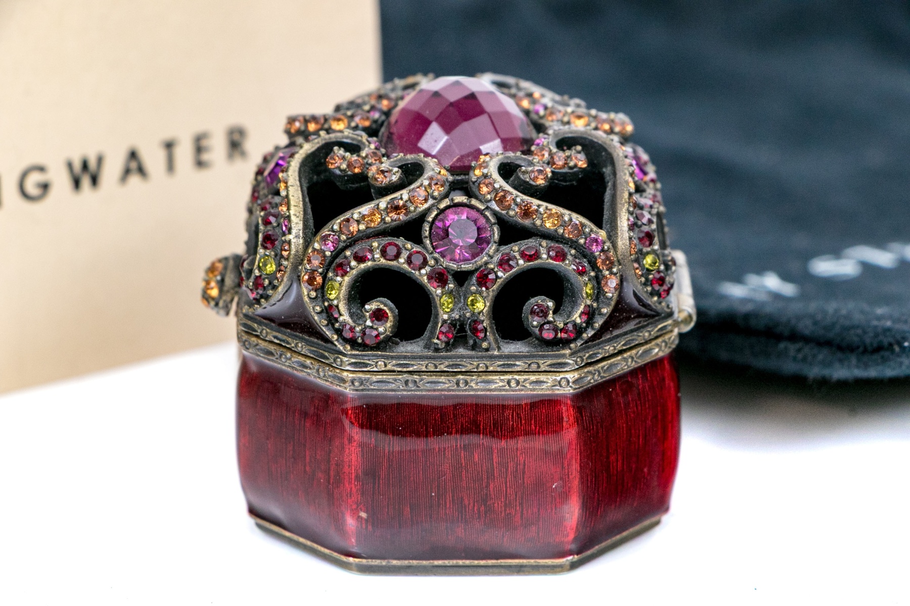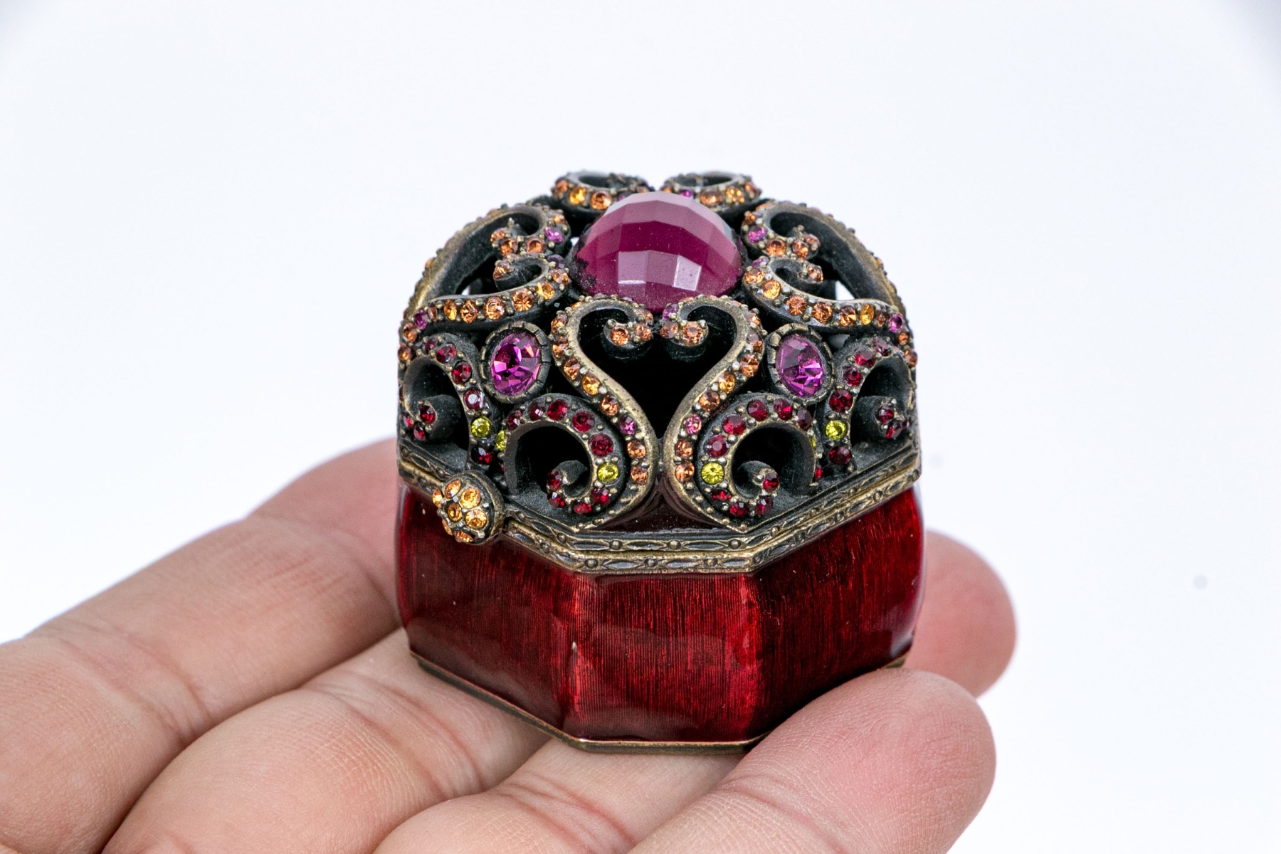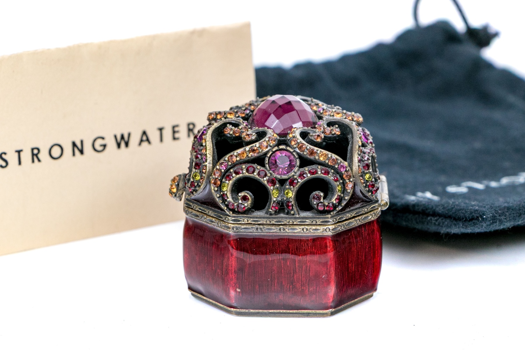 Signed and dated 2000 by the designer. From his Jewels for the Home collection. A small octagonal trinket box in bronze tone metal with wine red enamel and pierced scrolled hinged lid set with pink crystals and a cabochon stone. With a label and the black designer pouch.