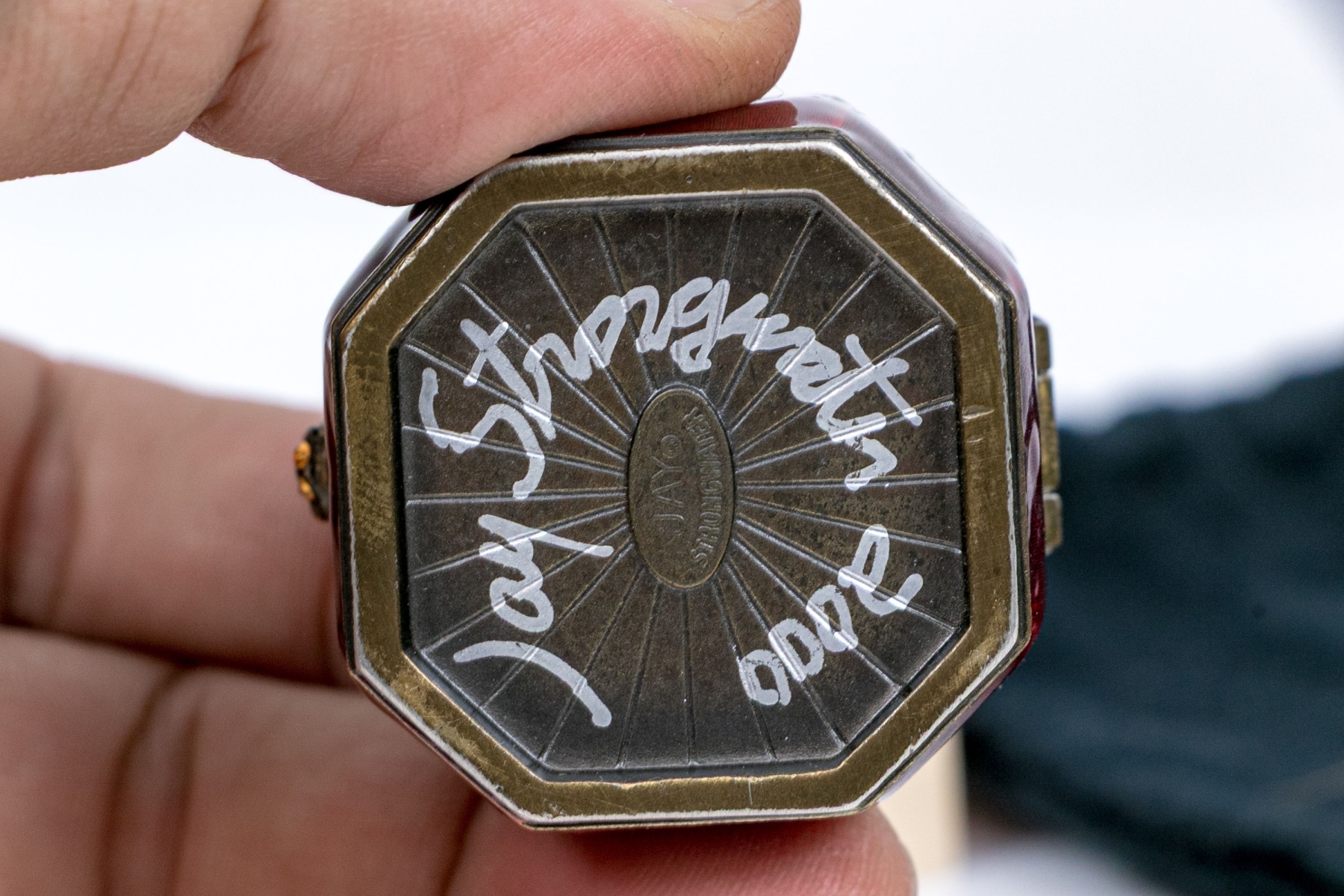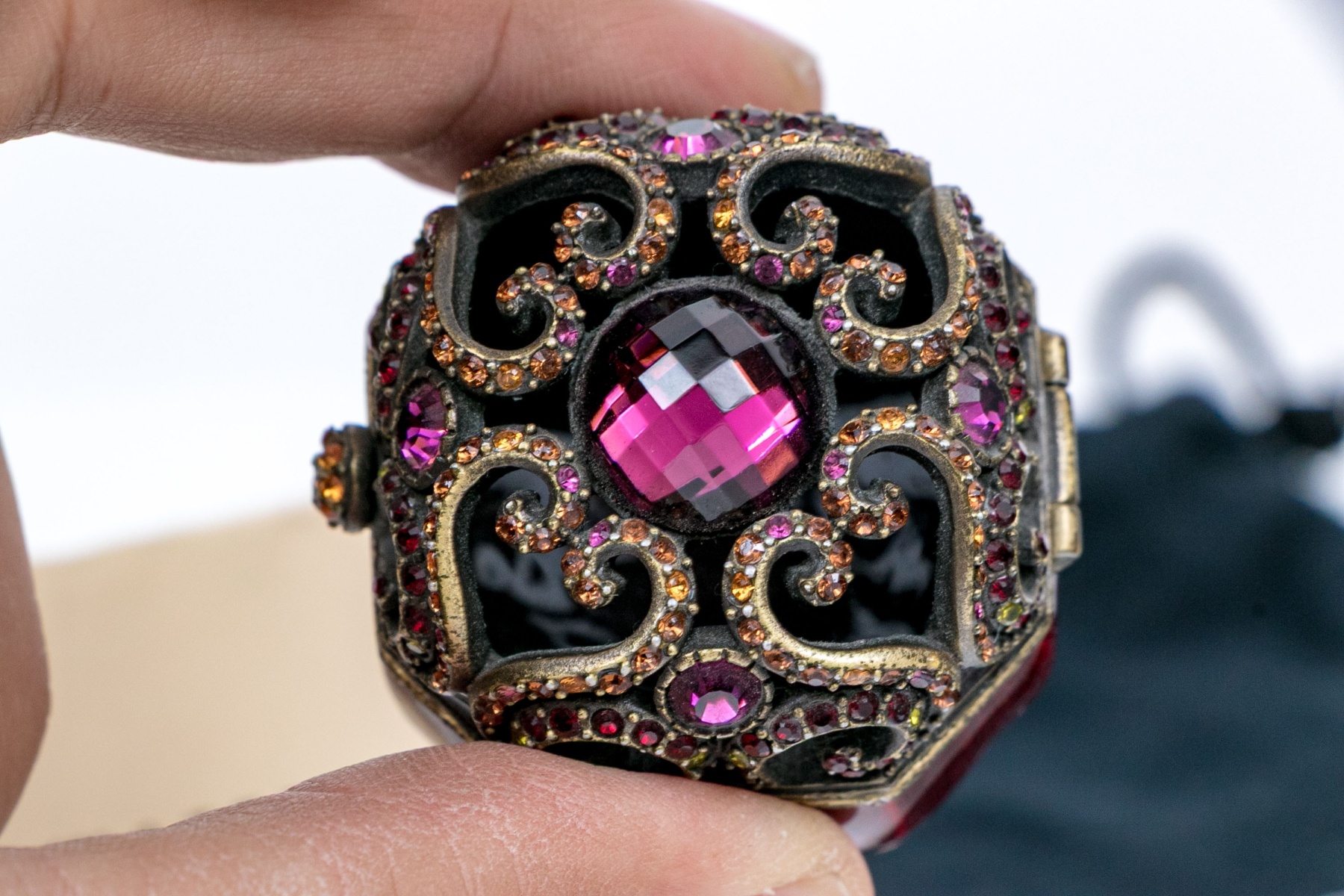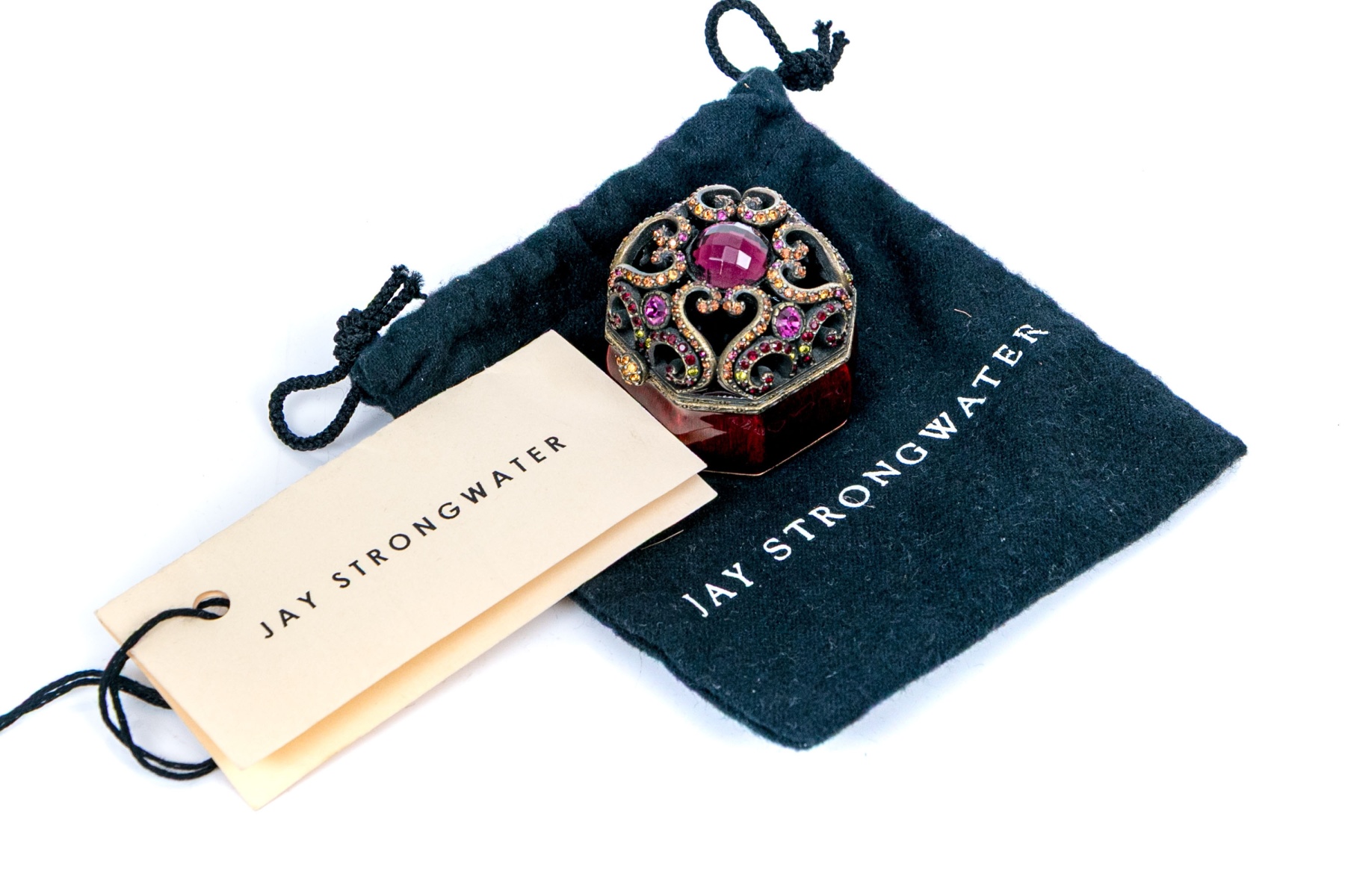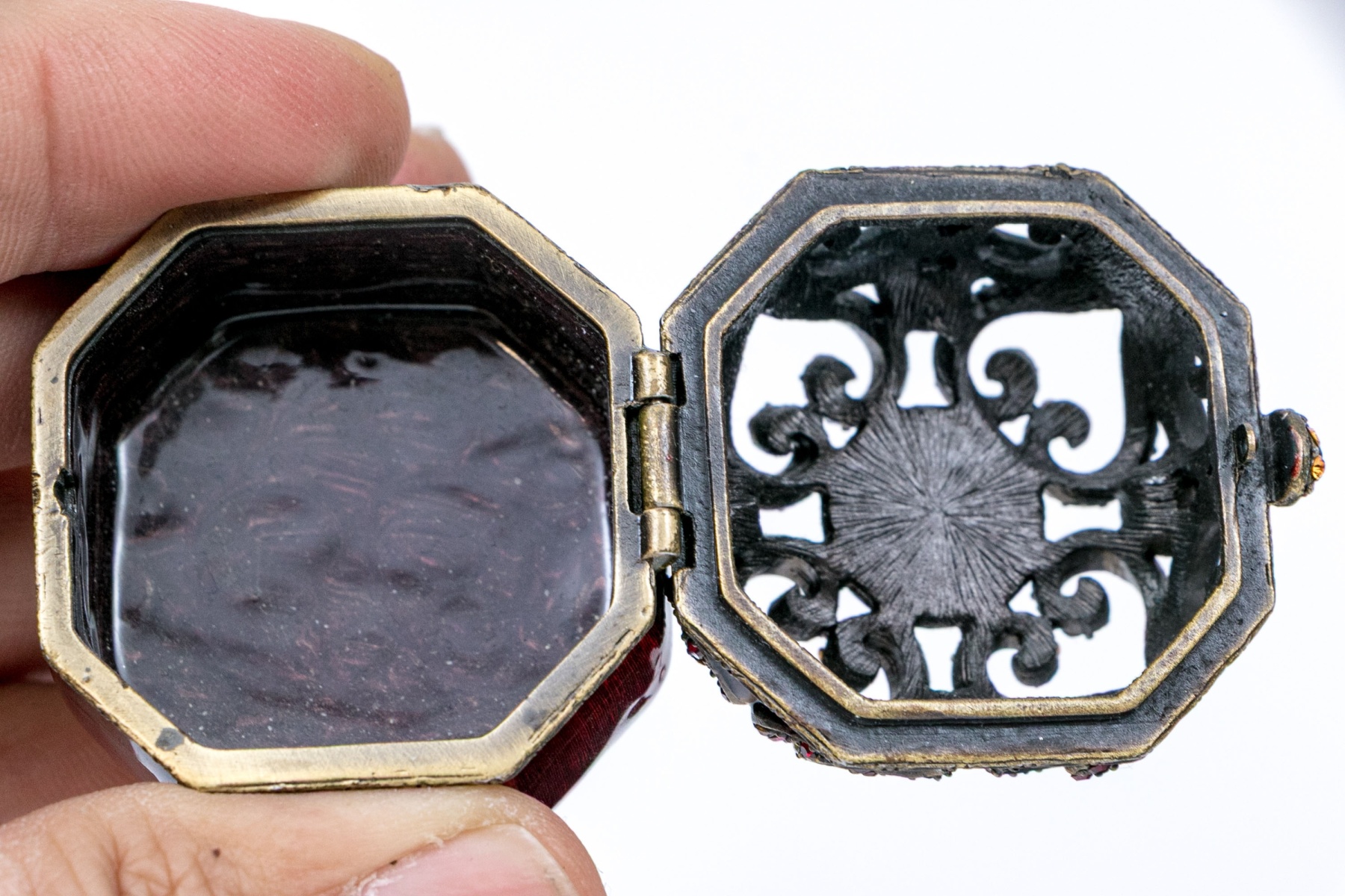 Signed and dated 2000 by the designer. From his Jewels for the Home collection. A small octagonal trinket box in bronze tone metal with wine red enamel and pierced scrolled hinged lid set with pink crystals and a cabochon stone. With a label and the black designer pouch.