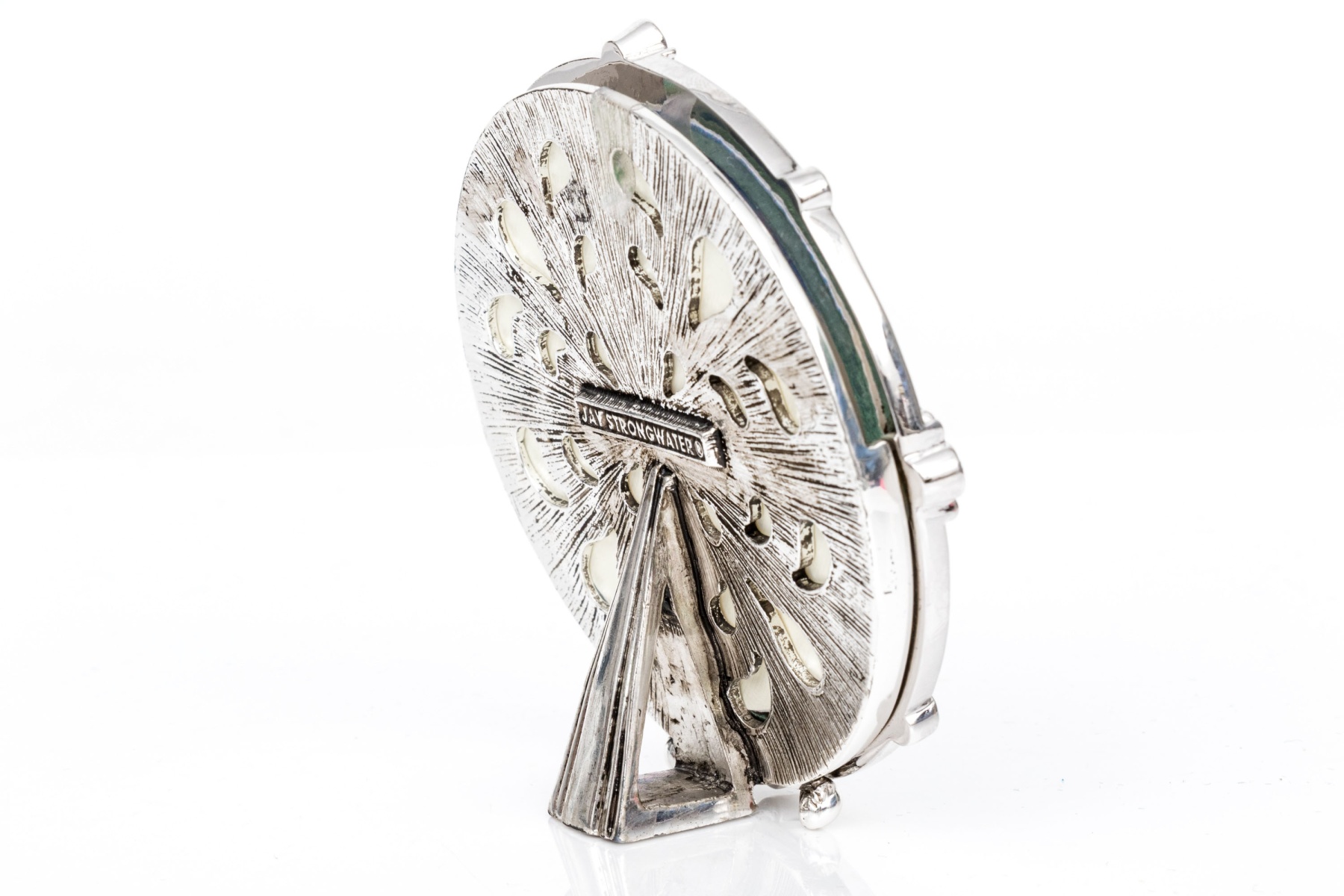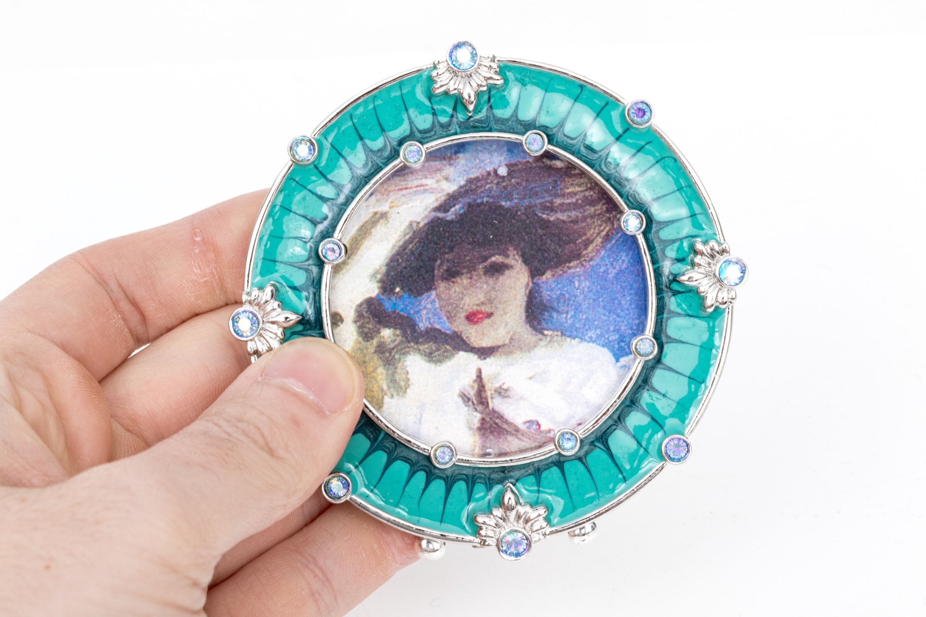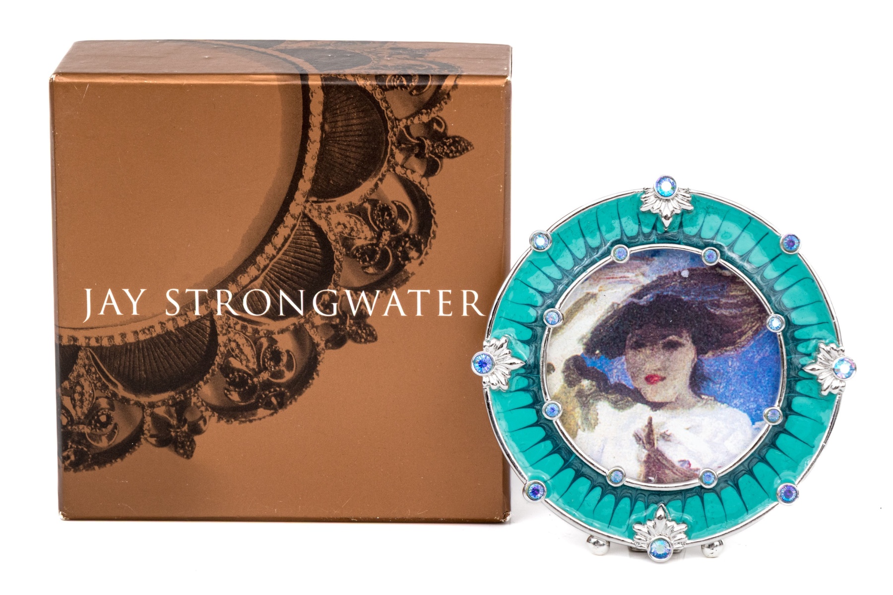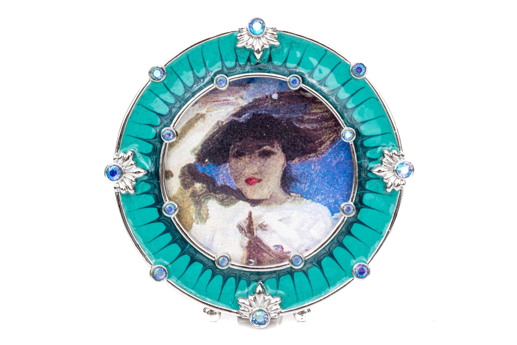 A sweet small round frame in teal and dark blue enamel with palmettes and set with blue and clear crystals. With a stand on the back. Presented in the designer box with black pouch and a brochure.