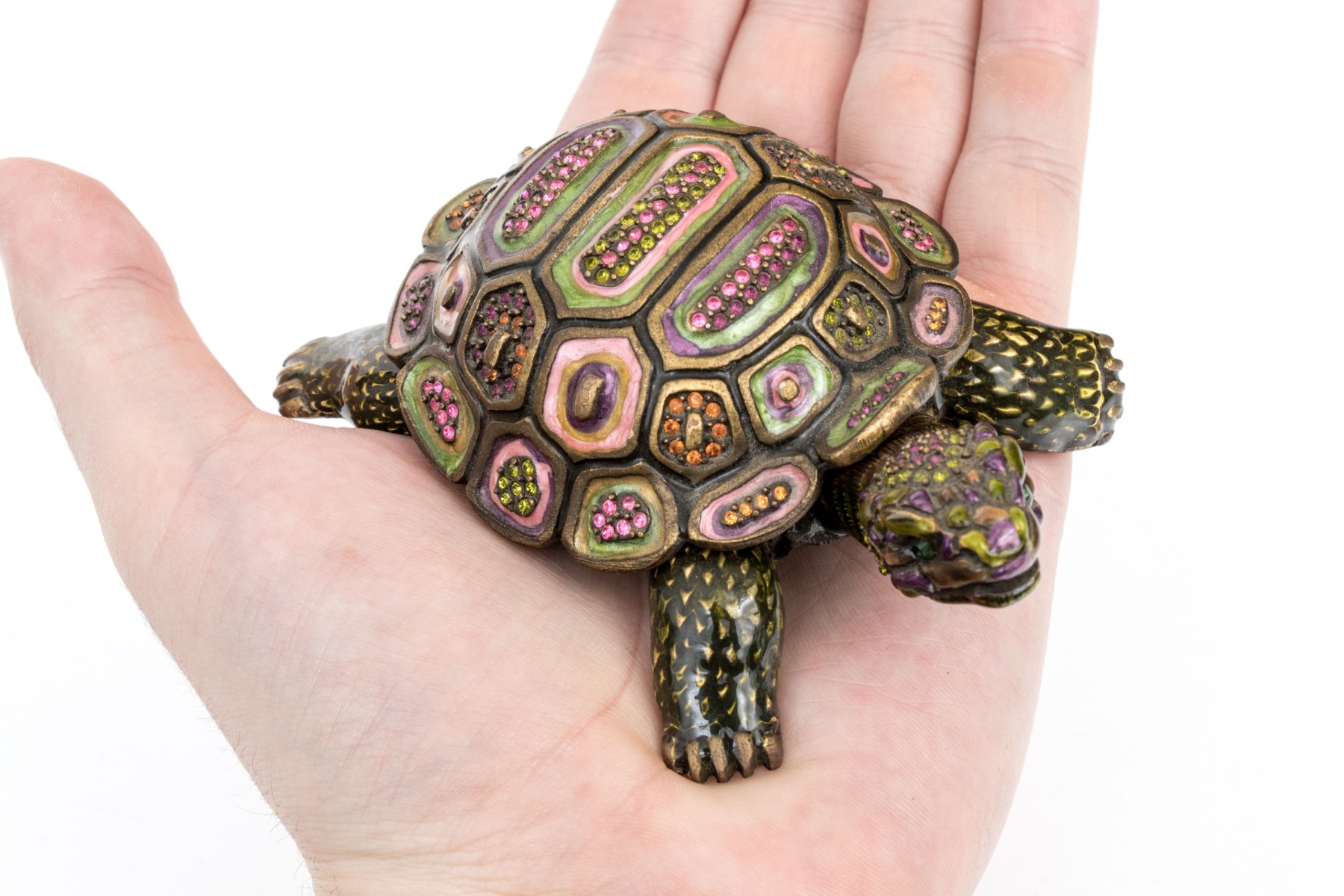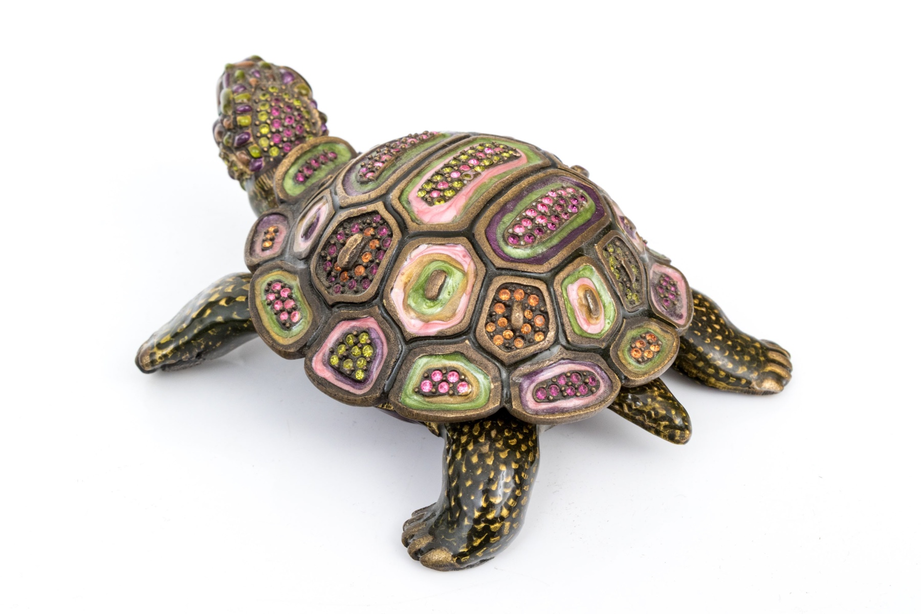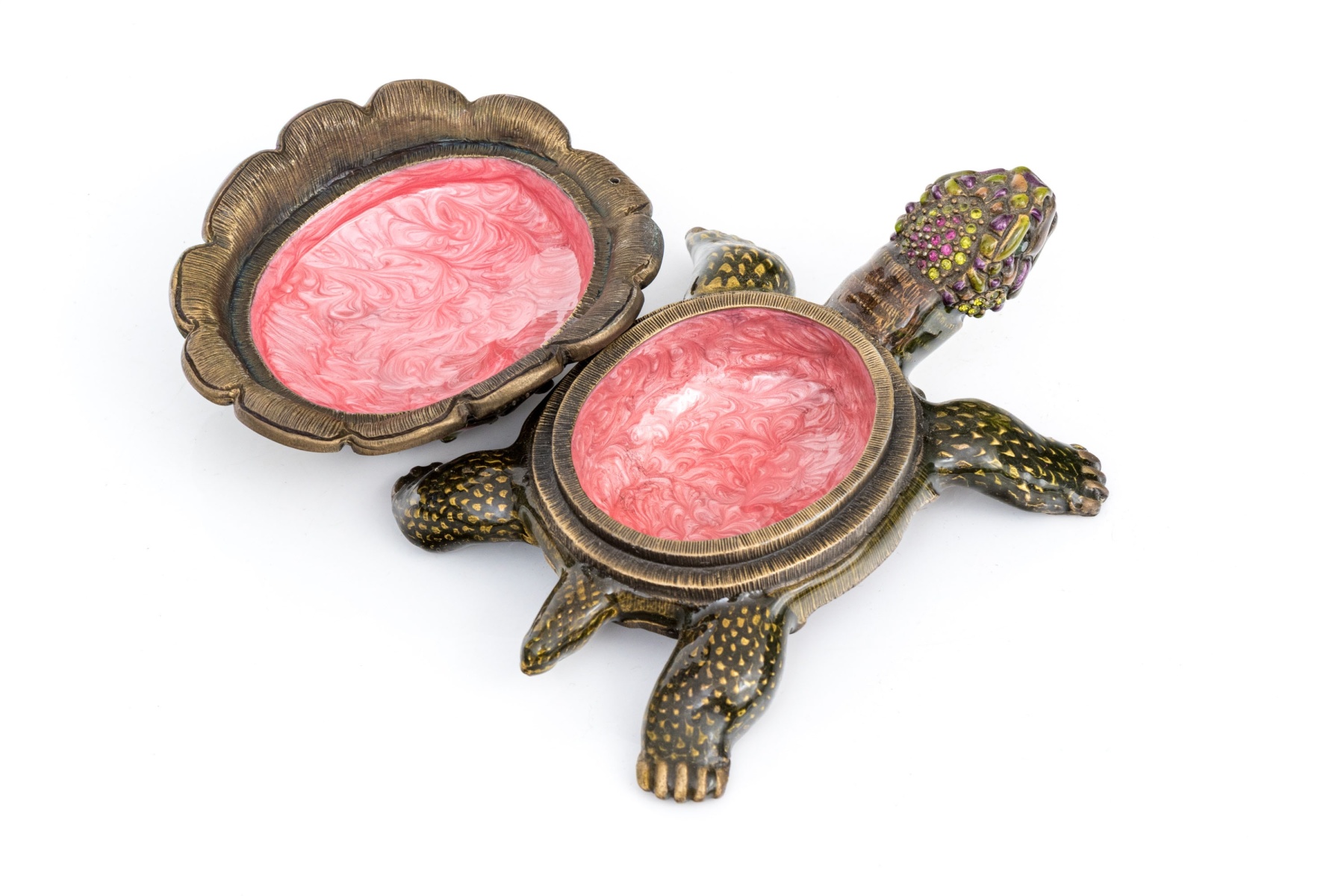A brown enameled turtle box with the back as a separate lid set with colored stones. With a pink enameled interior.