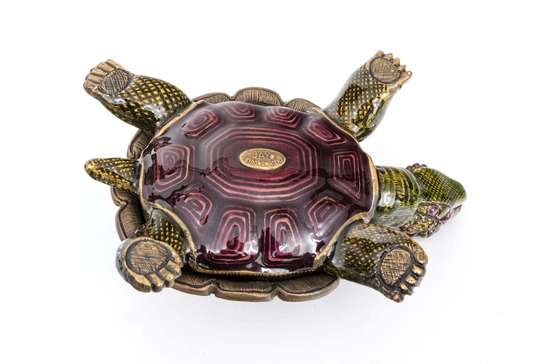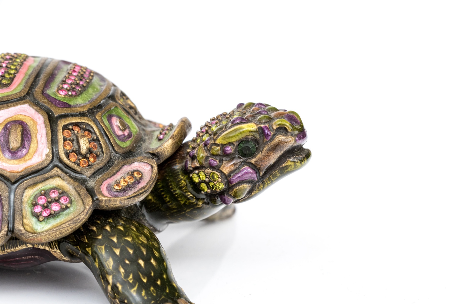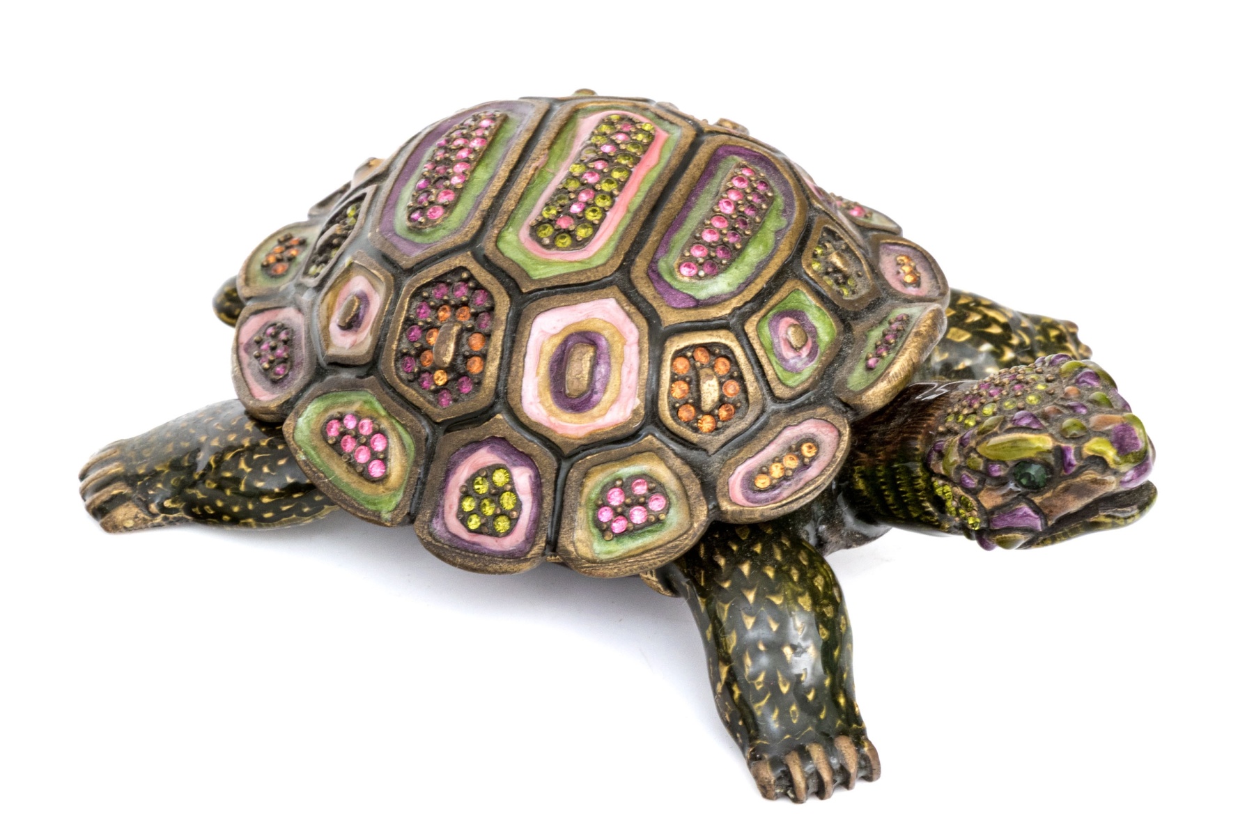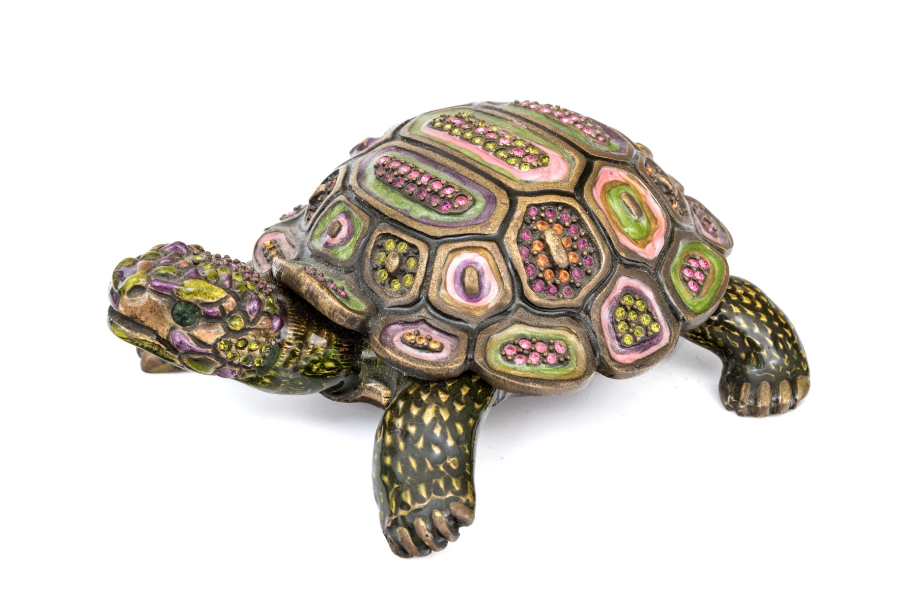A brown enameled turtle box with the back as a separate lid set with colored stones. With a pink enameled interior.